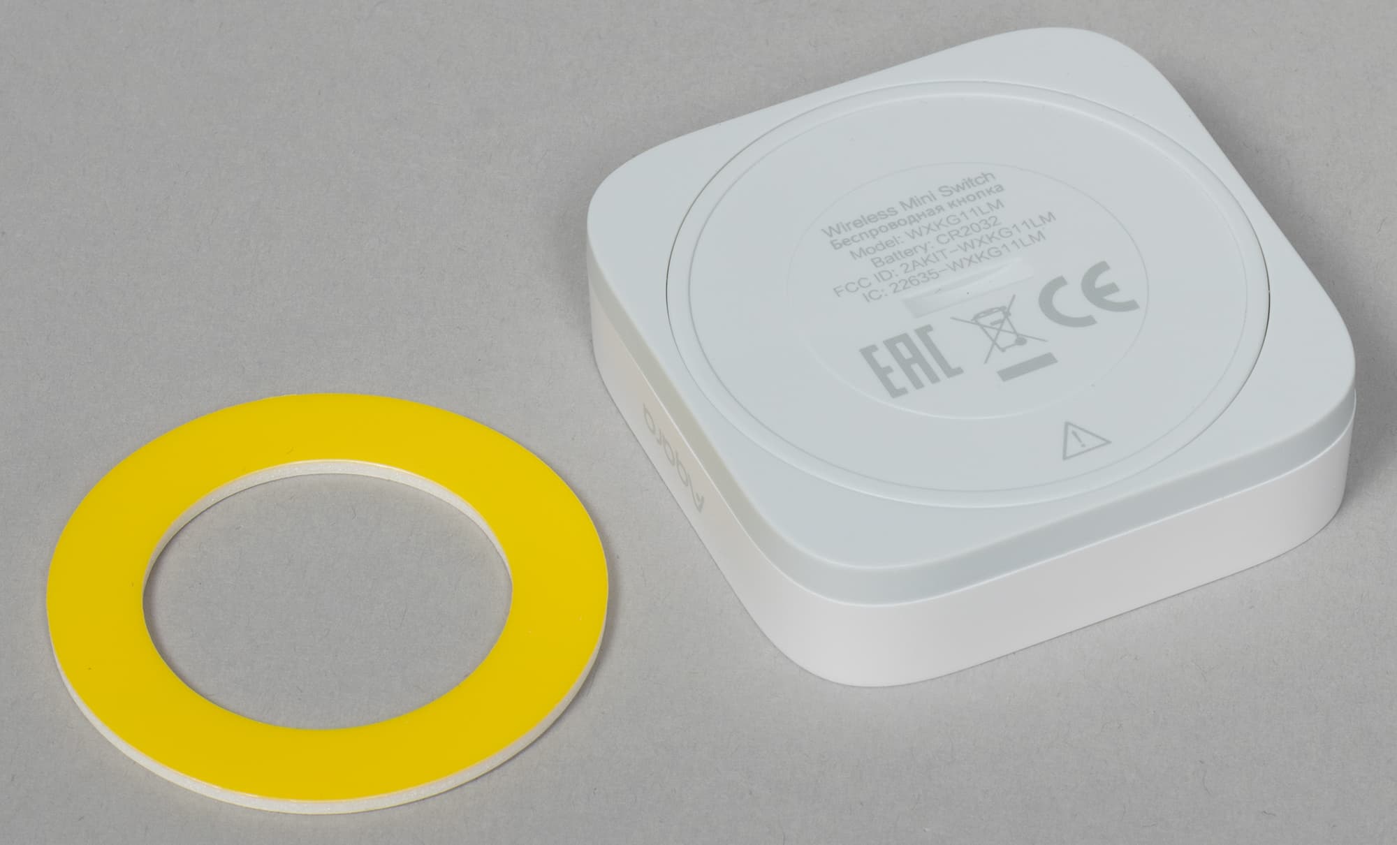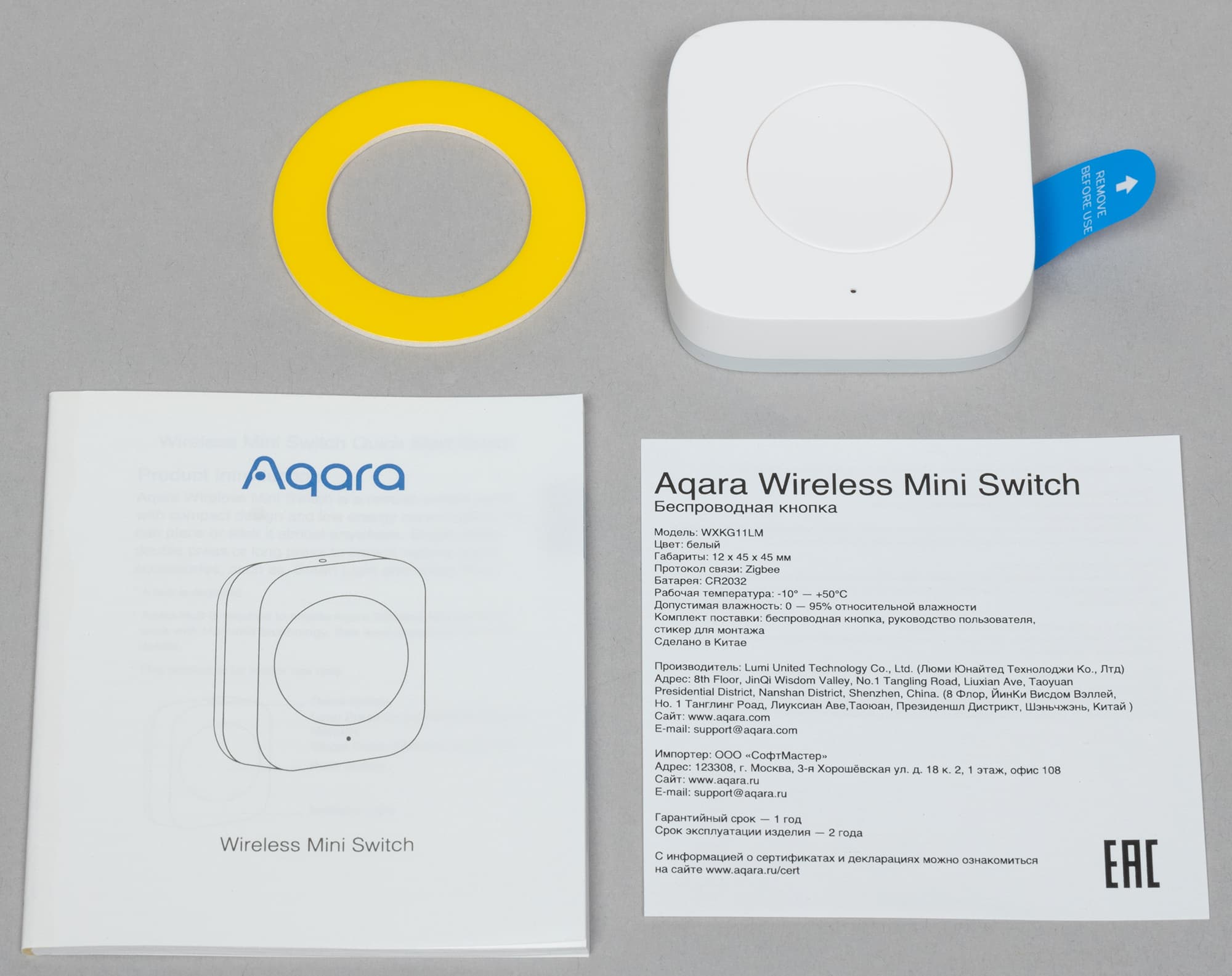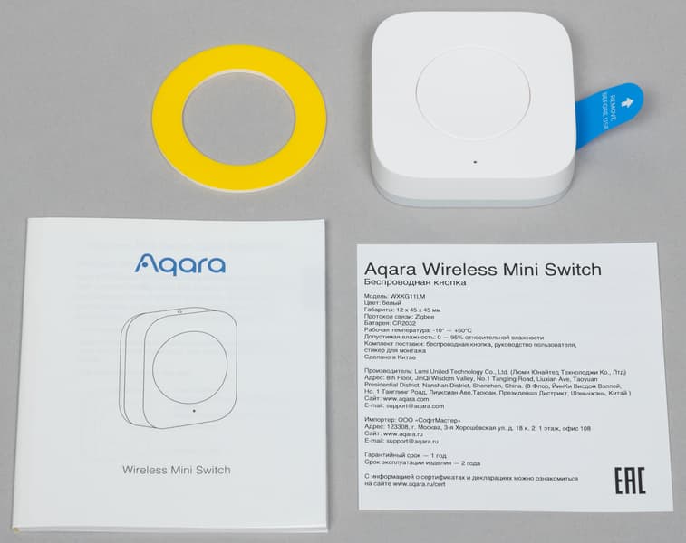 В коробке с кнопкой тоже есть свой кусочек скотча для монтажа. И опять же документы — куда без них.