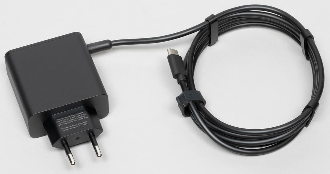 Блок питания выглядит надежным, на переднюю панель нанесен логотип Алисы. Технические характеристики видны на фото ниже, длина кабеля — 1,8 метра. Если длины многовато, можно воспользоваться идущим в комплекте силиконовым хомутом — пустячок, а приятно. В качестве разъема выбран USB Type C.