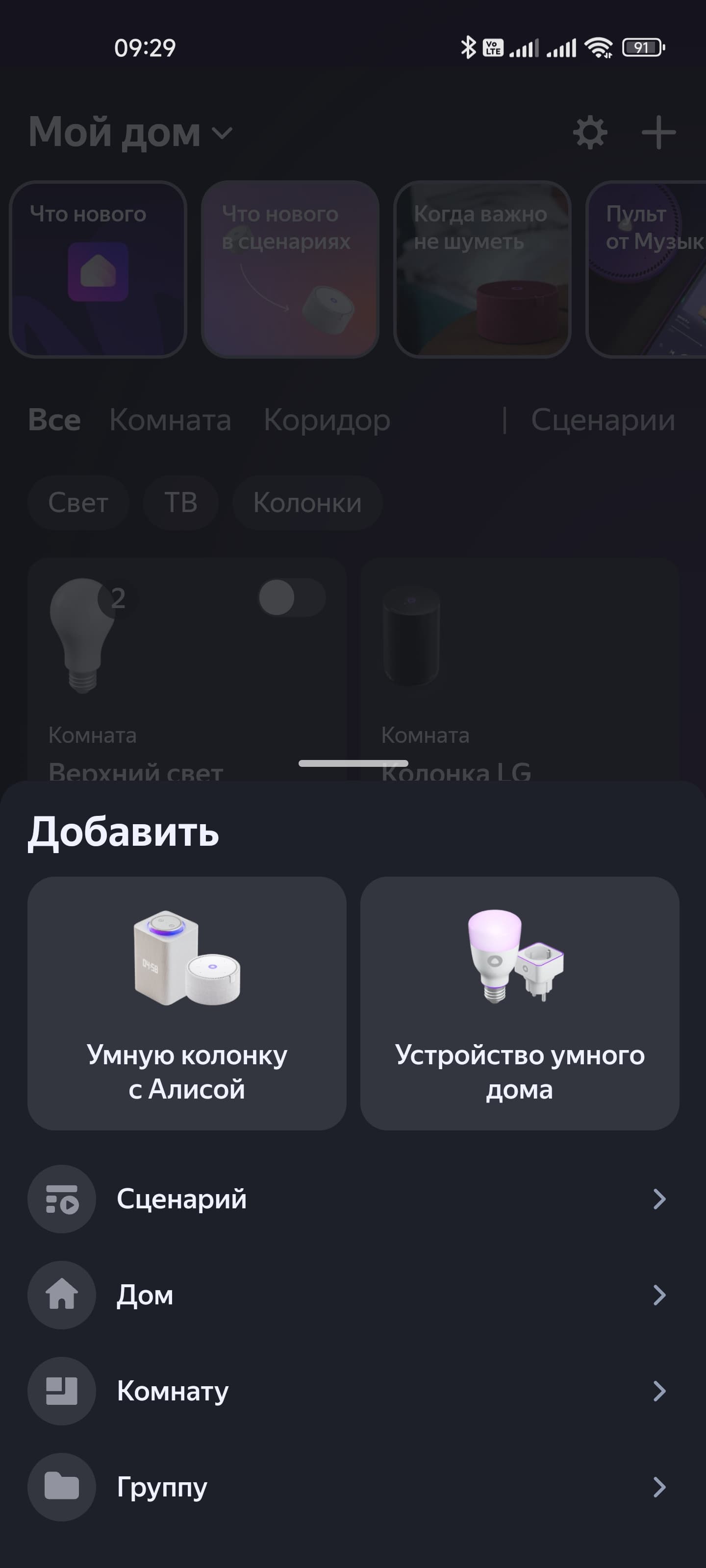 Ну а дальше нажимаем на кнопку добавления устройства, потом — кнопку добавления колонки. Видим обширный список, новинка — на самом верху. Выбираем и продолжаем. Система поддерживает несколько домов по несколько комнат в каждом: можно пользоваться одним аккаунтом в городской квартире и на даче, например.