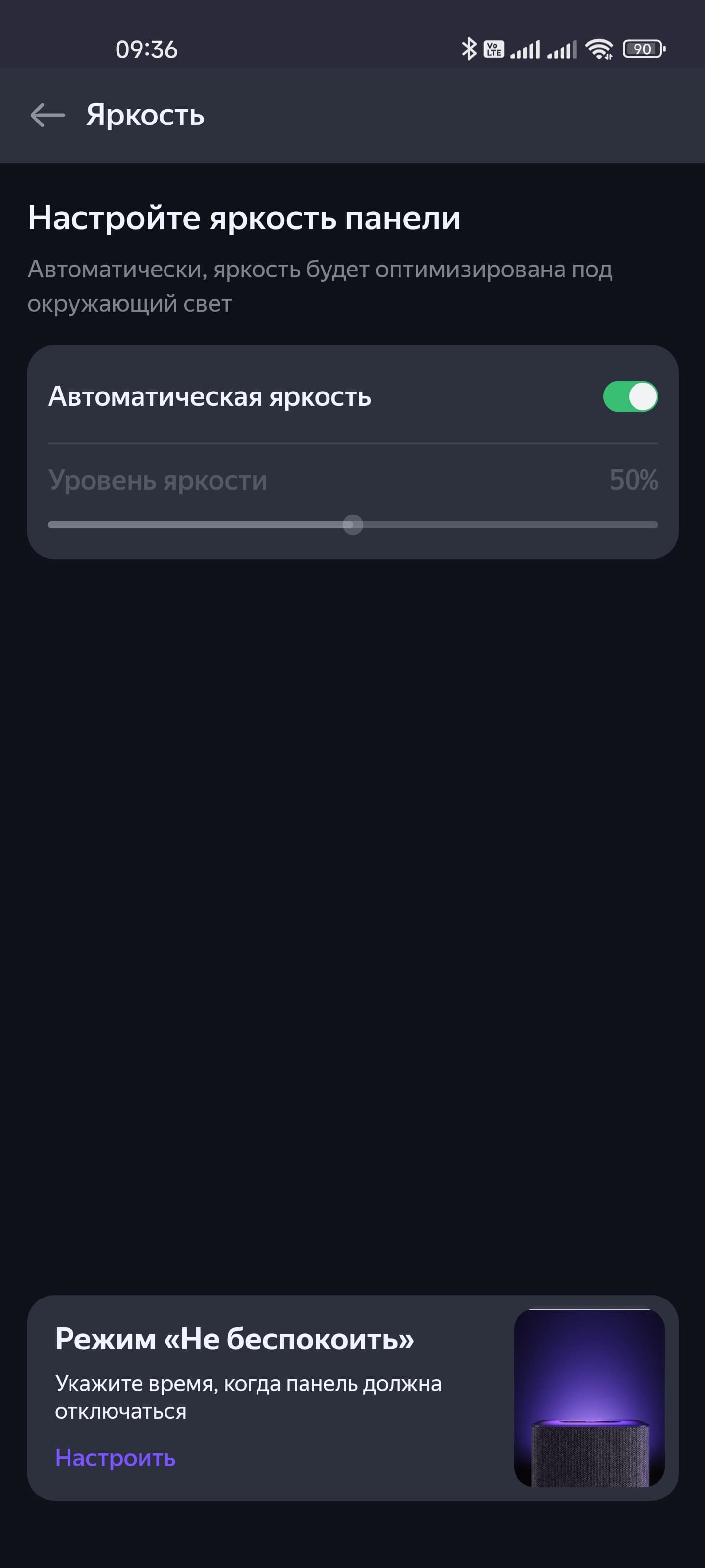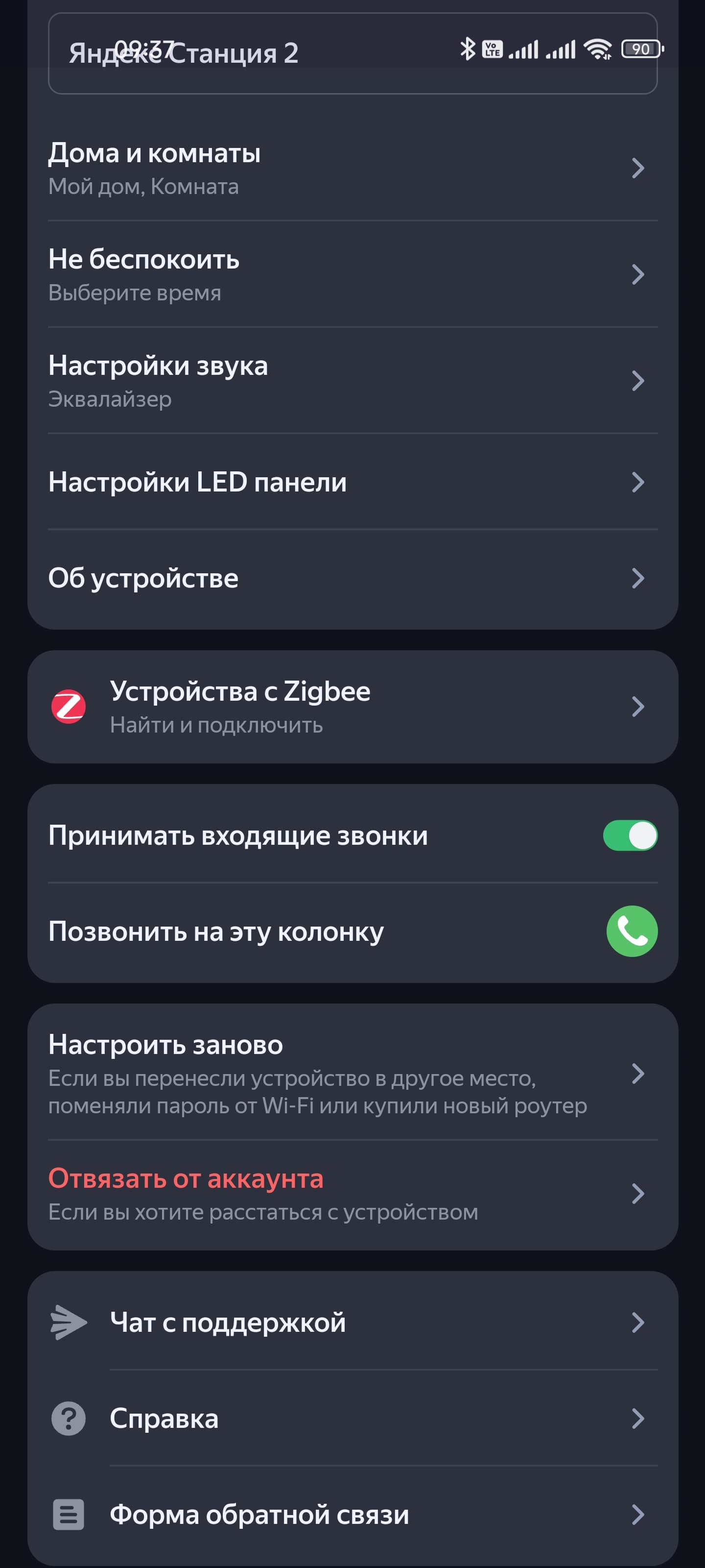 Работа верхней панели настраивается: можно вручную выставить яркость, выбрать тип визуализации. А еще на «Яндекс Станцию 2», как и на ряд прошлых колонок, можно позвонить. На первый взгляд, не самая полезная функция. Но пару вероятных сценариев использования для нее придумать легко: например, можно позвать всех обедать, не покидая кухню и не повышая голос…