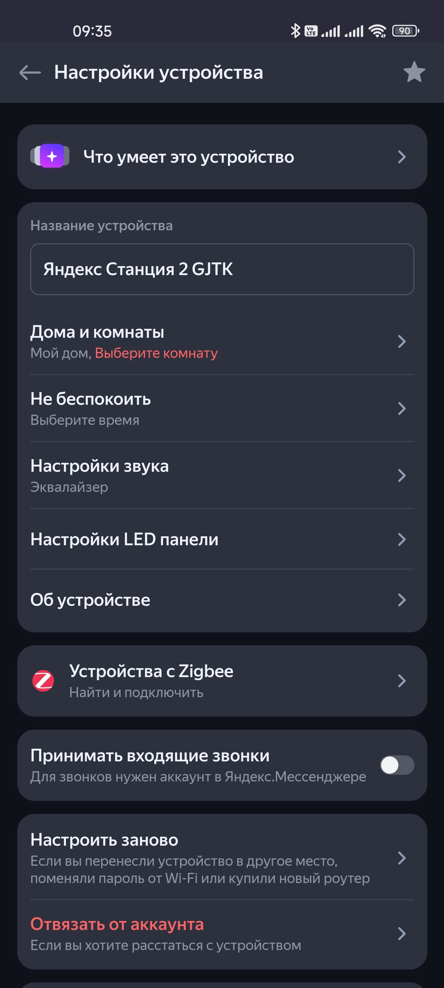 А пока продолжаем настройку. Первым делом можно поменять имя устройства на какое-нибудь более удобное. Ну и еще раз проверить настройки расположения: выбрать дом и комнату, в которой смарт-колонка будет работать. Это особенно важно, если колонок несколько: система давно умеет отвечать только одной из них — первой, которая услышала. Соответственно, фраза «Включи свет», услышанная колонкой в спальне, может включить свет в спальне. А если ее же услышит колонка на кухне — загорится свет уже на кухне. Режим «не беспокоить» отключает не только сигналы вызова, но и свечение панели — ночью это может оказаться очень кстати.