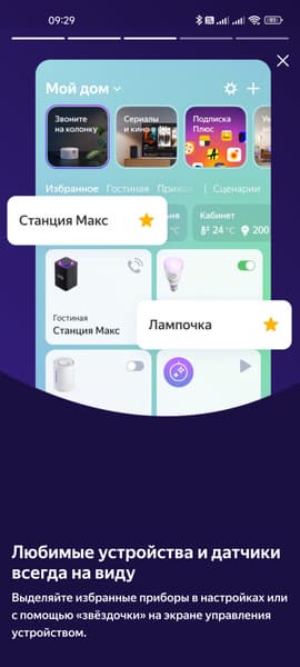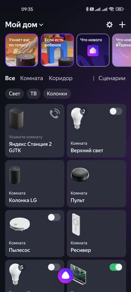 Как уже упоминалось выше, у экосистемы «умного» дома «Яндекса» наконец-то есть свое приложение — и пяти лет не прошло… Через браузер компании настройка тоже возможна, но там уже нет поддержки самых свежих функций, да и удобнее через отдельное приложение. В общем, устанавливаем, авторизуемся. И видим на главном экране все уже привязанные к аккаунту устройства. Сверху есть «плитка» из ссылок на материалы в формате «сториз», которые рассказывают про различные особенности нового ПО — есть смысл их почитать.
