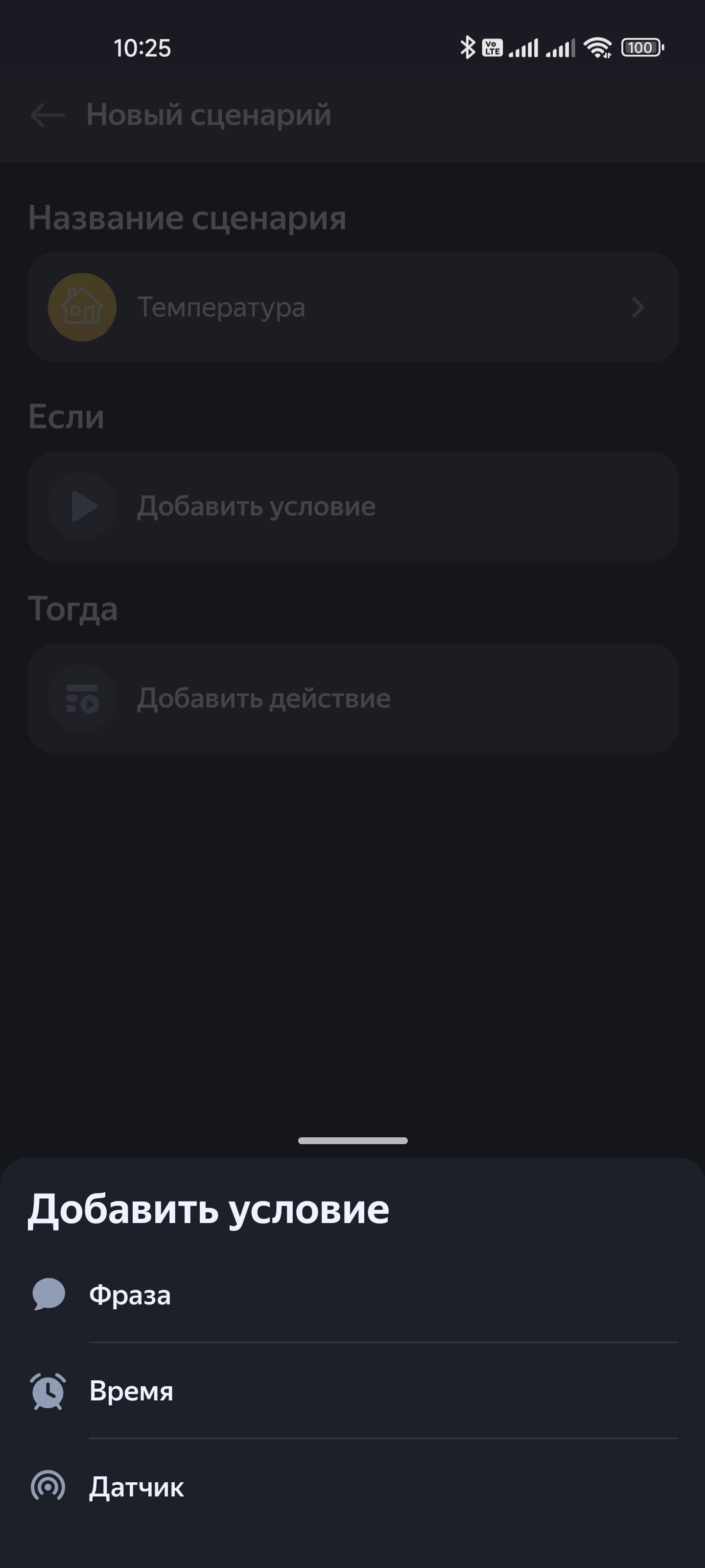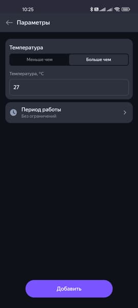 Но самое интересное тут, конечно, возможность использовать датчик в качестве триггера для сценариев. Переходим на страницу сценариев, жмем на кнопку добавления условия — выбираем датчик климата. Например, настроим срабатывание при температуре выше 27 градусов. Ну а дальше выбираем любое из устройств и говорим ему, что сделать — можно хоть свет включить, хоть телевизор выключить… Но логичнее, конечно, будет запустить кондиционер.
