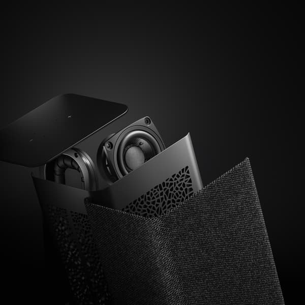 Под слоем ткани скрывается сетка с асимметричными отверстиями. Производитель называет ее «апериодическая решетка» и заявляет, что она вносит меньше искажений в звук, чем классические варианты. Широкополосные динамики диаметром 63,5 мм выведены на переднюю и заднюю панель, по бокам размещены пассивные излучатели.
