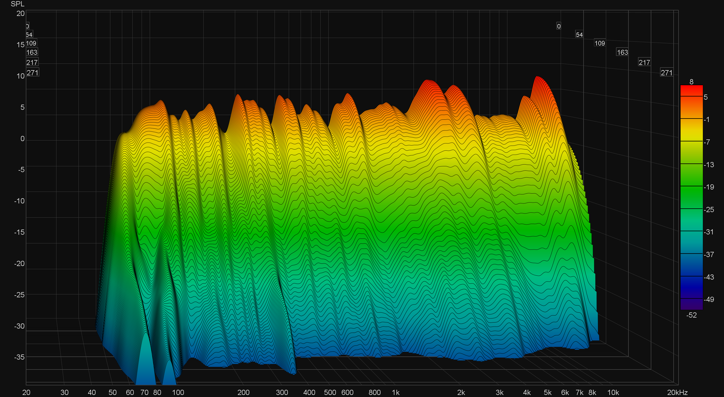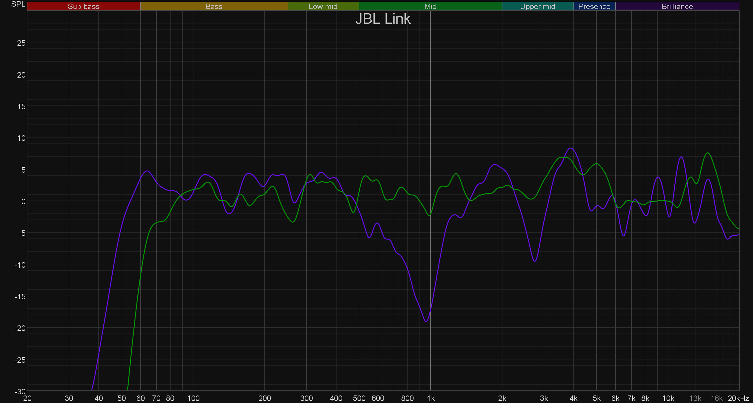 Как и заявлено производителем, воспроизведение баса стартует где-то от 65 Гц, для колонки такого размера с пластиковым корпусом это очень хороший показатель. Середина довольно-таки «ровная», в ВЧ-диапазоне есть ряд заметных пиков, но это не приводит к свойственным ему проблемам — никакого «цыканья» или «песка», все звучит довольно-таки комфортно. При этом нет гулкости, которую мы отмечали в звучании первой версии колонки, что заметно по графику кумулятивного затухания спектра (он же «водопад» или waterfall).