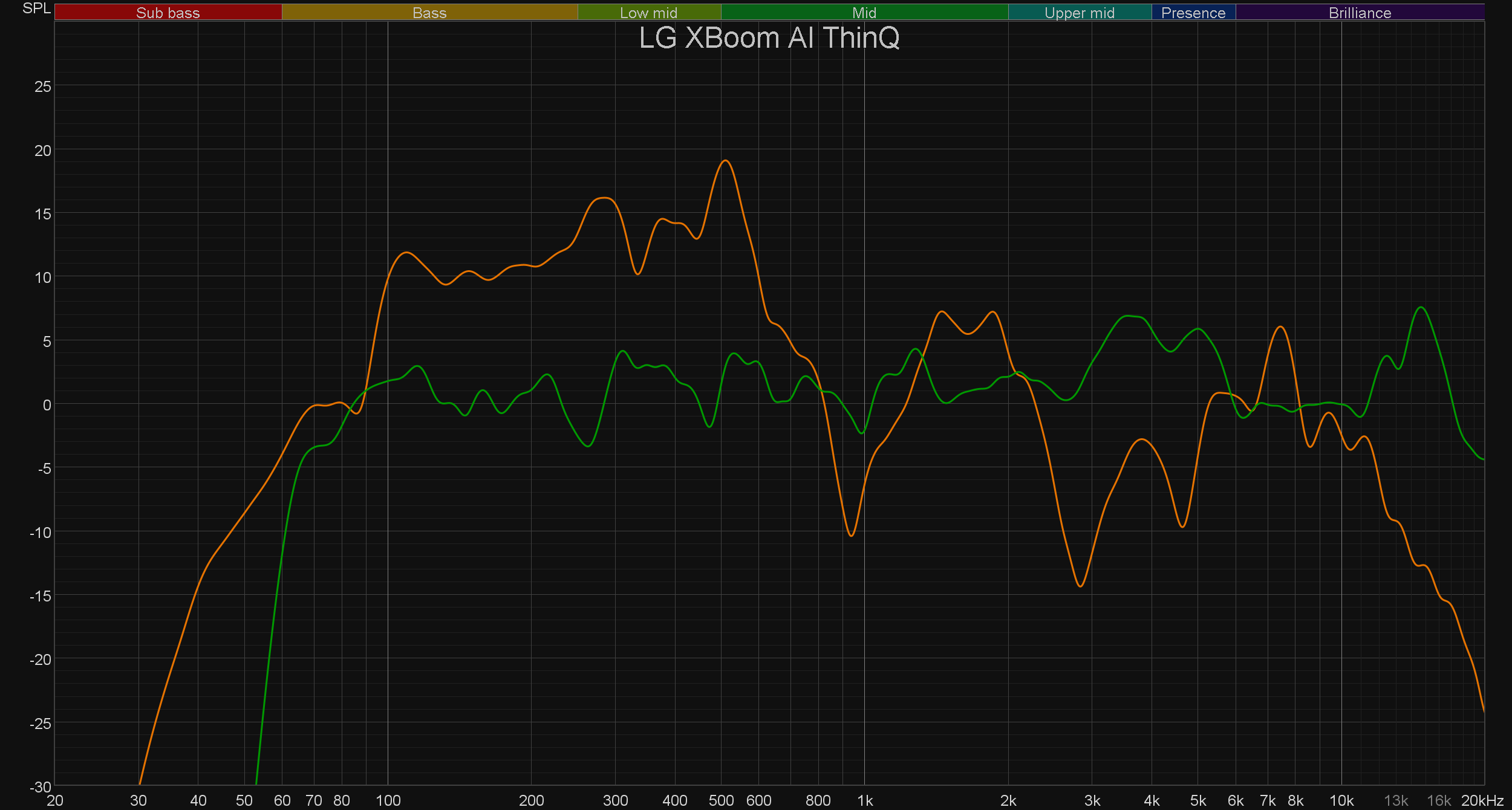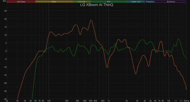 Корпус немного вибрирует, ну и работа пассивных излучателей заметна, но в целом все очень и очень даже неплохо. К сожалению, эквалайзер не работает при подключении посредством Bluetooth, а другого способа транслировать тестовый сигнал на колонку нет — потому посмотреть на эффективность его работы мы не сможем. Ограничимся субъективными впечатлениями: эквалайзер работает, подстроить звук под свои вкусы позволяет. Что же касается корректировки звучания под помещения, то чуда предсказуемо не происходит, но все же звучание чуть меняется и чаще всего — в лучшую сторону.