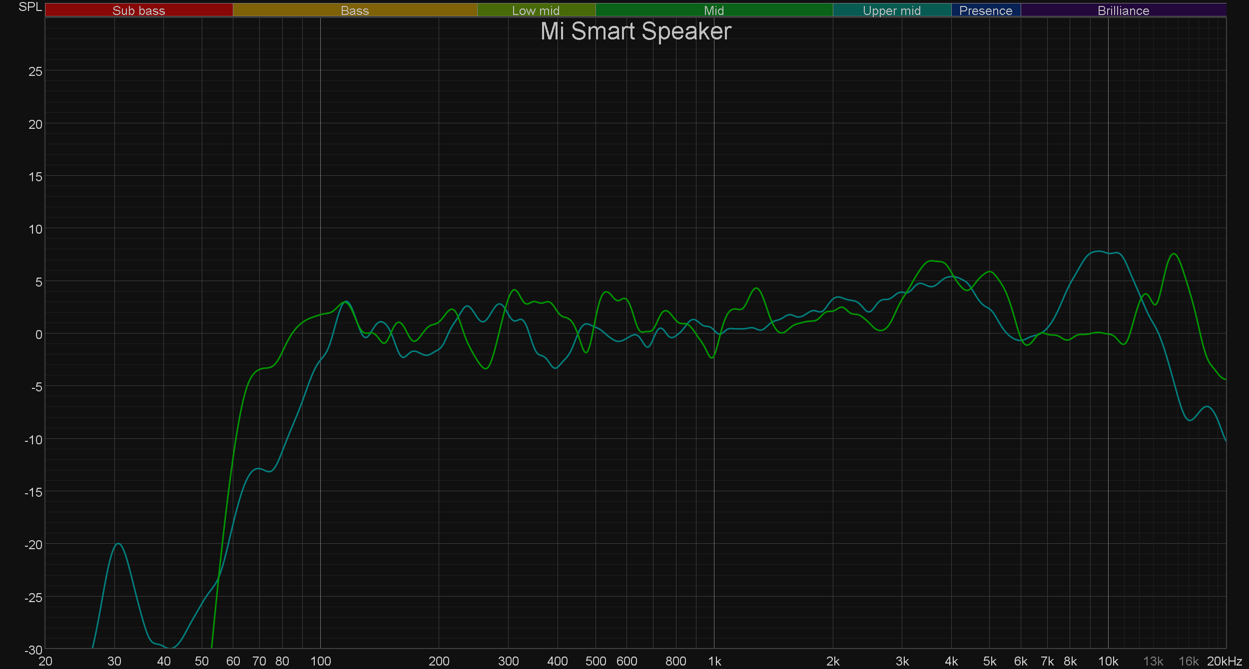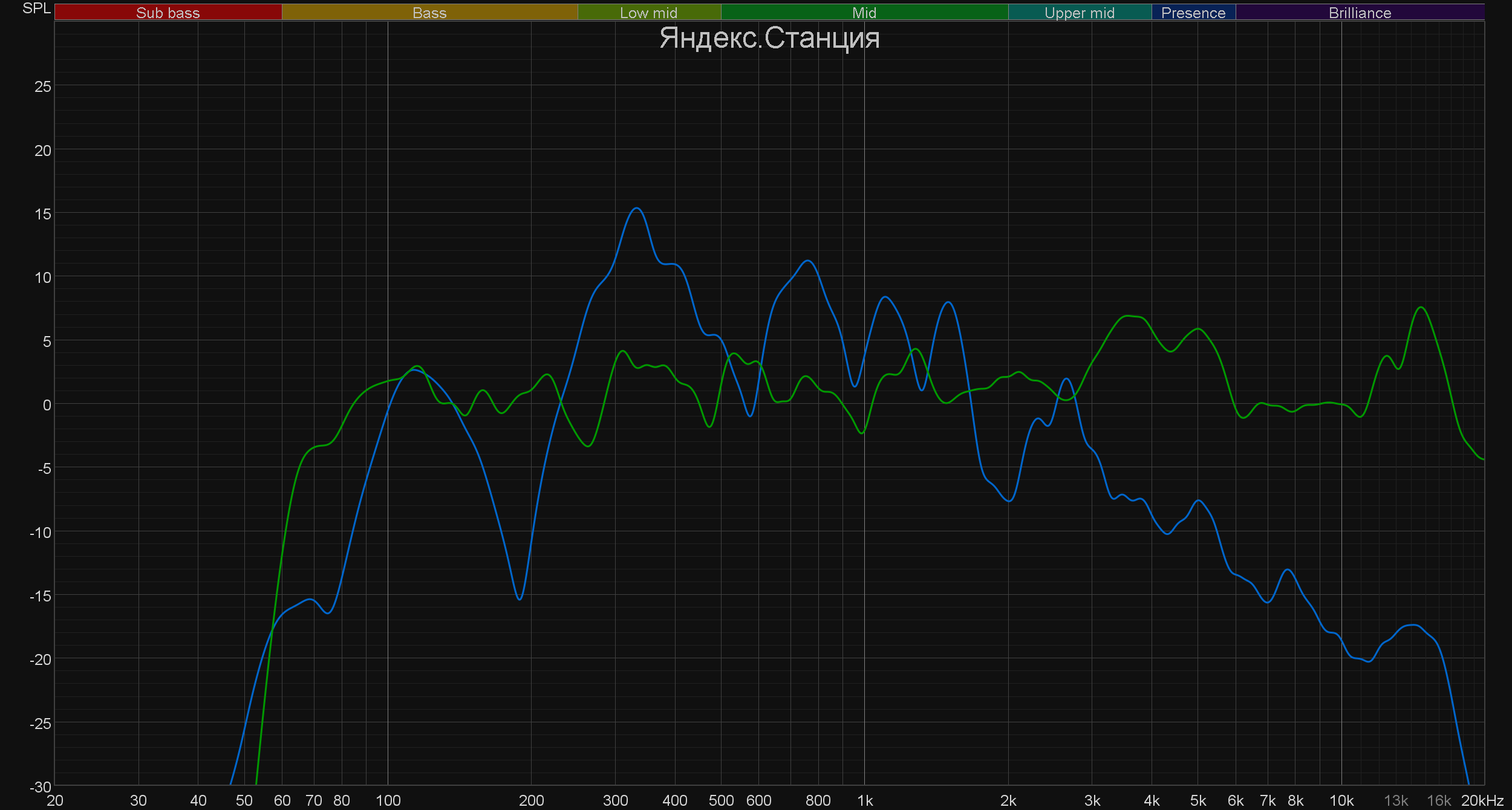 Ну и, конечно, сравним графики АЧХ тестируемого устройства и других смарт-колонок похожих габаритов — сначала тех, которые поддерживают Алису, а потом — и остальных. Первая иллюстрация отвечает на главный вопрос: «Улучшилось ли качество звука во второй версии по сравнению с первой?». Улучшилось, причем крайне заметно. Ну а дальше просто смотрим на картинки, вряд ли там нужны какие-либо комментарии.