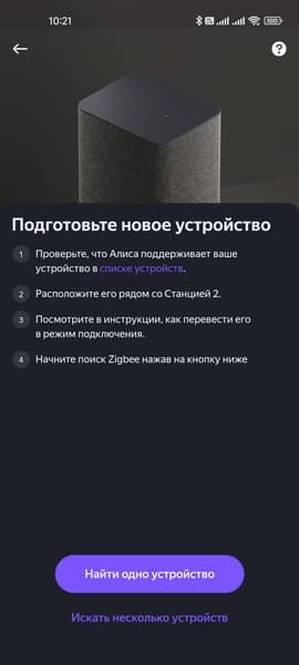 Для подключения к центральному устройству у большинства рассмотренных приборов есть специальная маленькая кнопка, которую нужно нажать и удерживать несколько секунд. «Умную» розетку же надо сначала подключить к розетке обыкновенной, а потом удерживать кнопку включения до сигнала индикатора. Ну а дальше возвращаемся в приложение. Подключение по протоколу Zigbee осуществляется не через общее меню добавления устройств, а через вкладку колонки «Яндекс Станция 2» — это нужно иметь в виду.