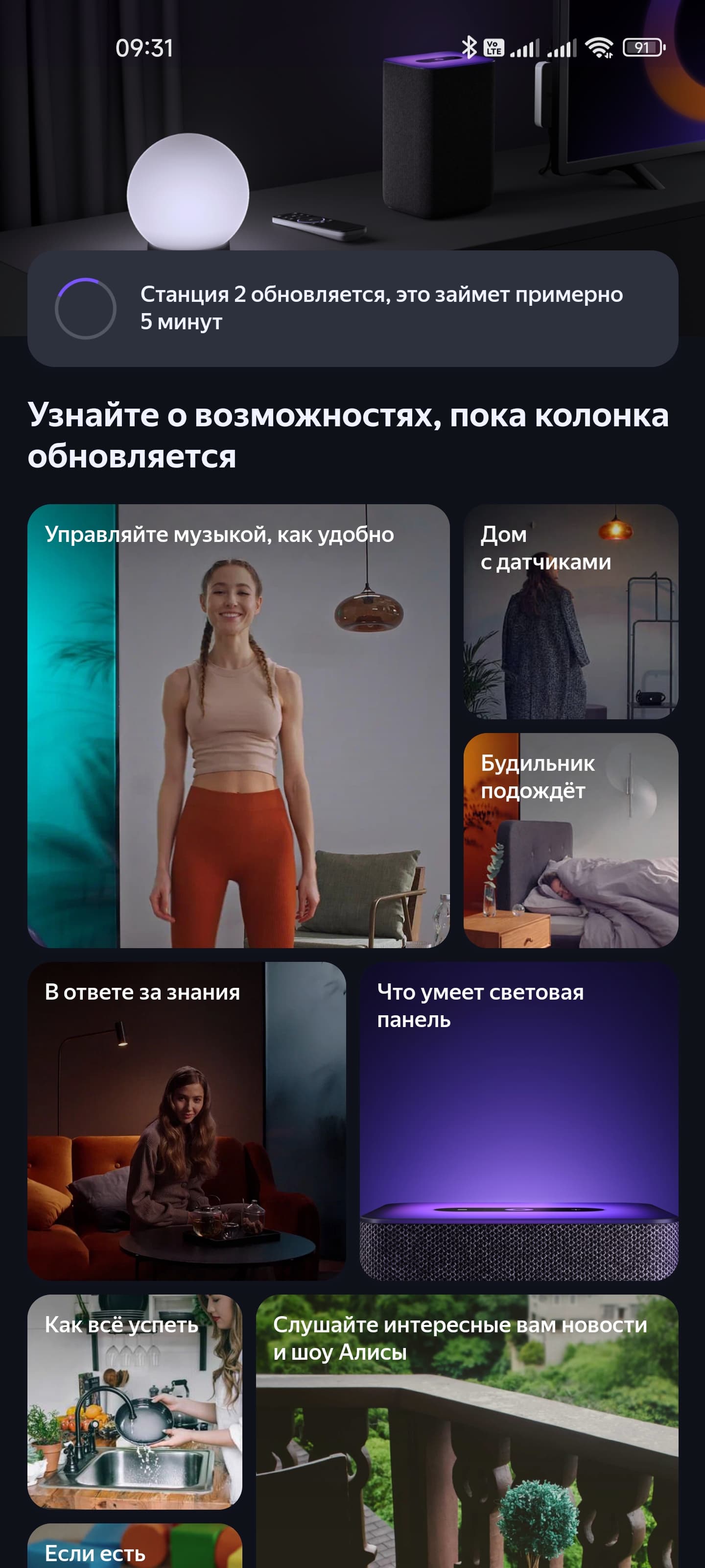 Готово. Несколько минут «Станция» может обновляться, мы же пока снова смотрим истории про то, что появилось новенького и как всем этим пользоваться — сделаны они красиво и познавательно. Ну а потом возвращаемся на главный экран, где видим «Яндекс Станцию 2» в списке подключенных.