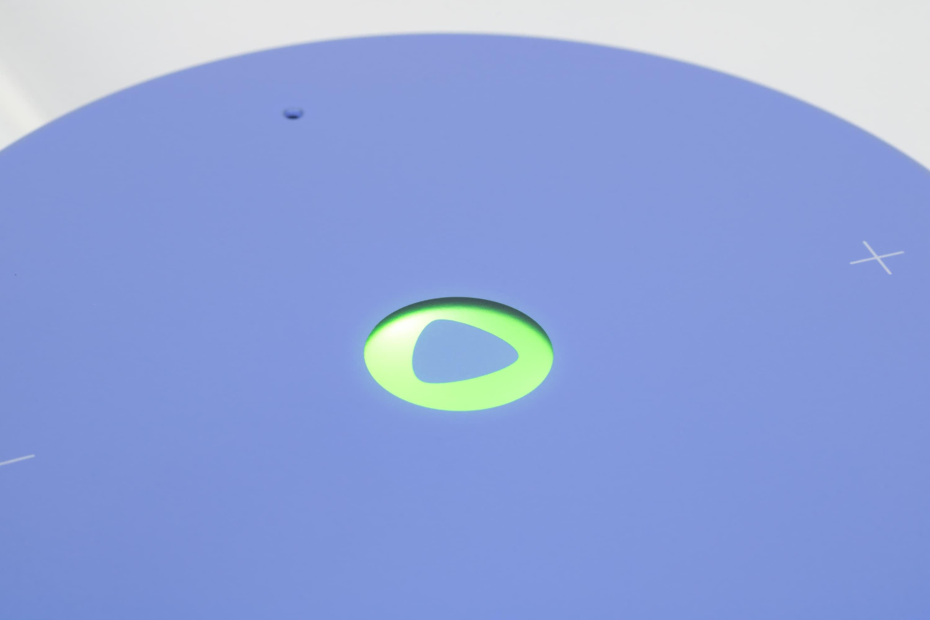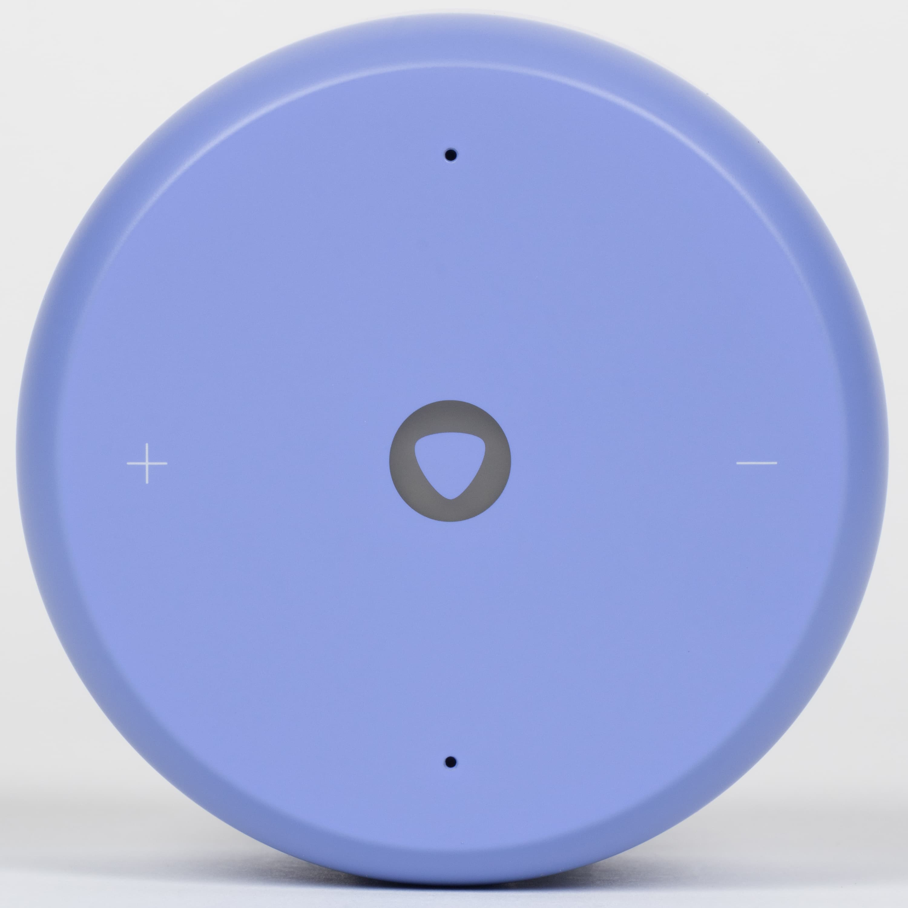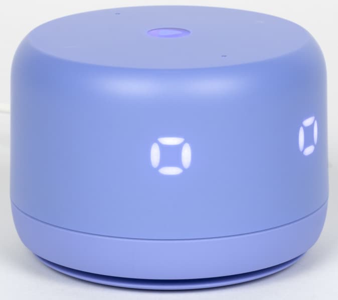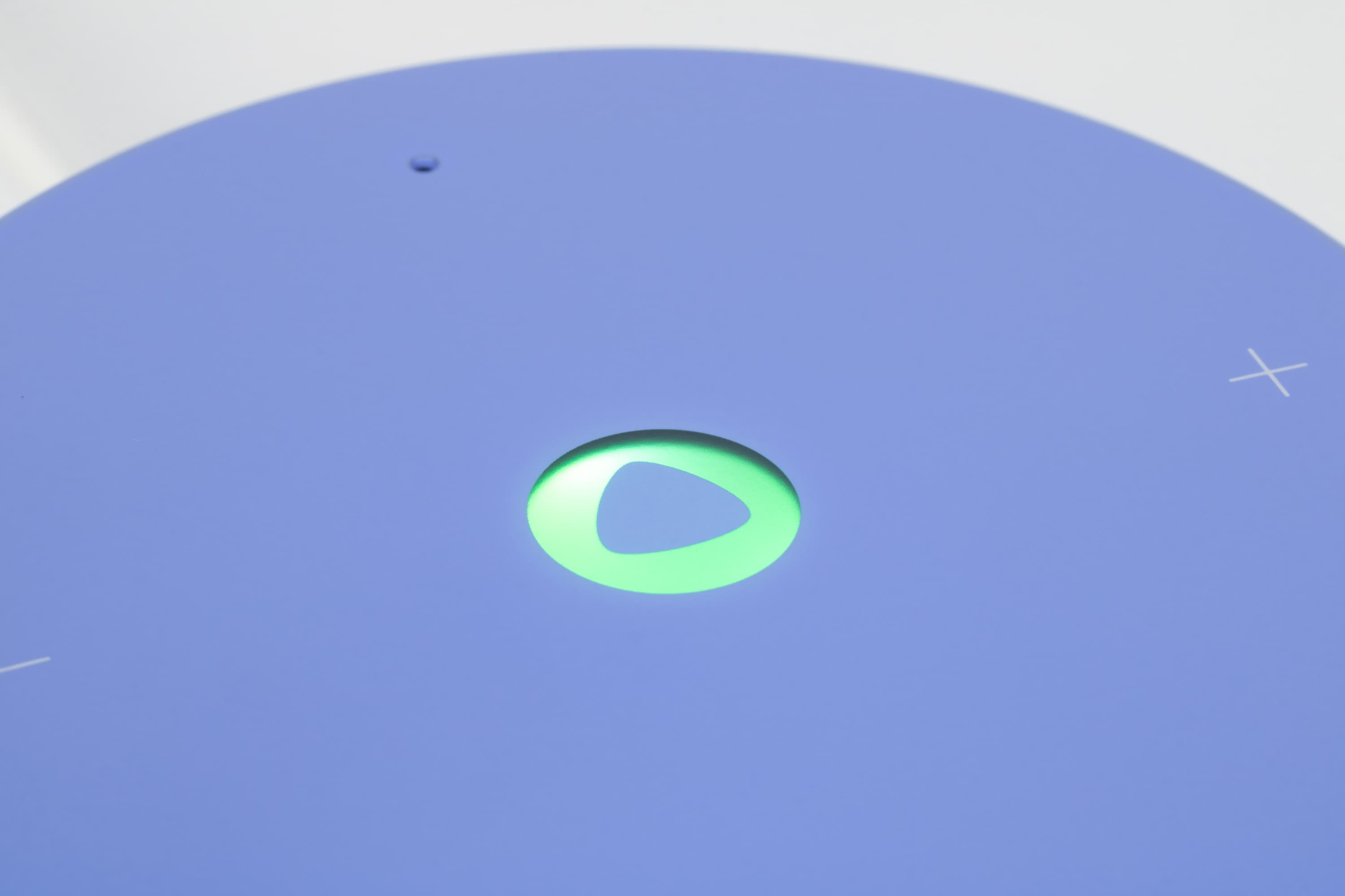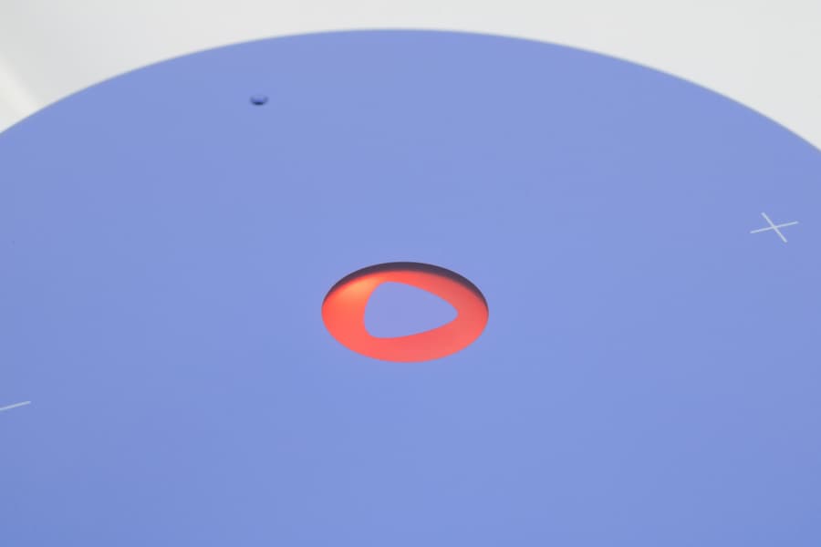 Индикатор светится фиолетовым, когда ассистент реагирует на запрос, и красным при отключении микрофона. Во время регулировки громкости он меняет цвет от зеленого на минимуме до красного на максимуме. Если нажать на него, когда Алиса что-то говорит, она сразу замолчит.