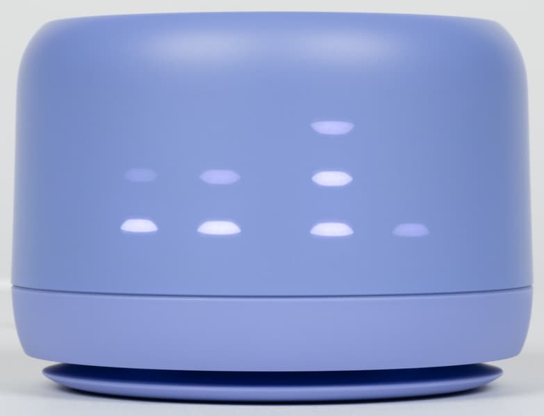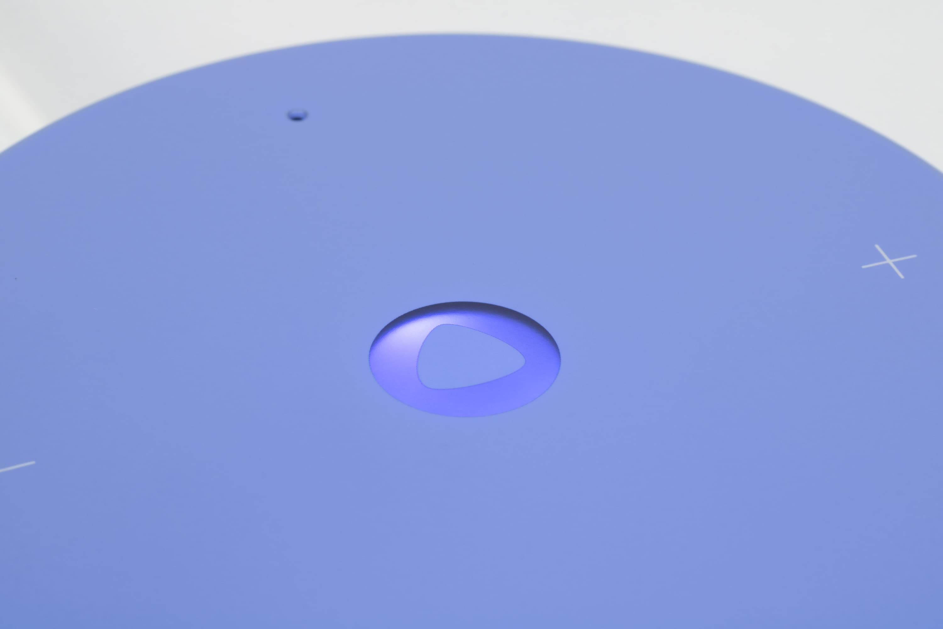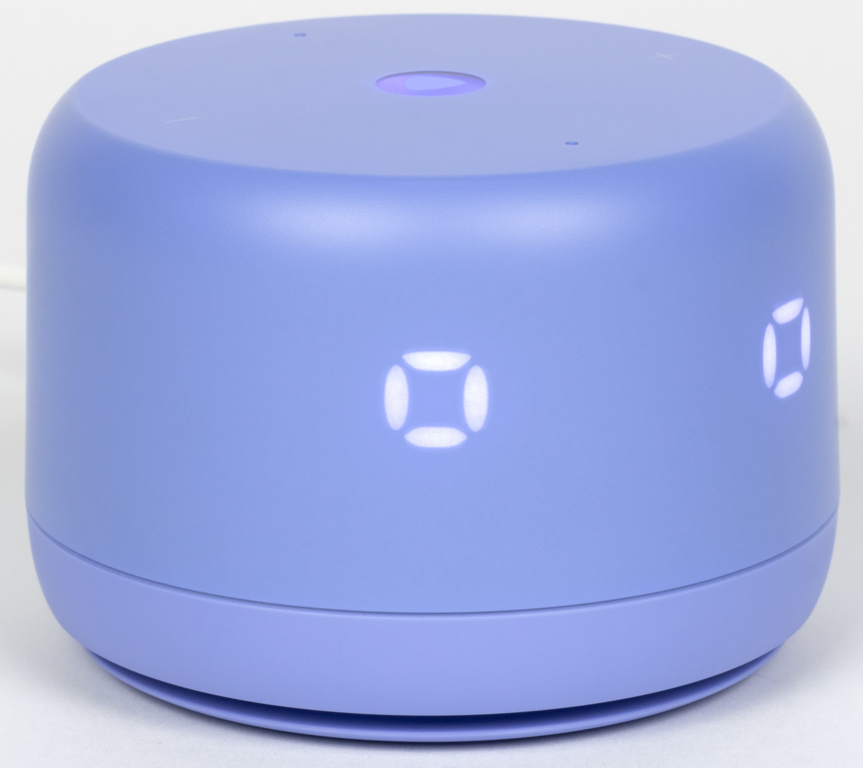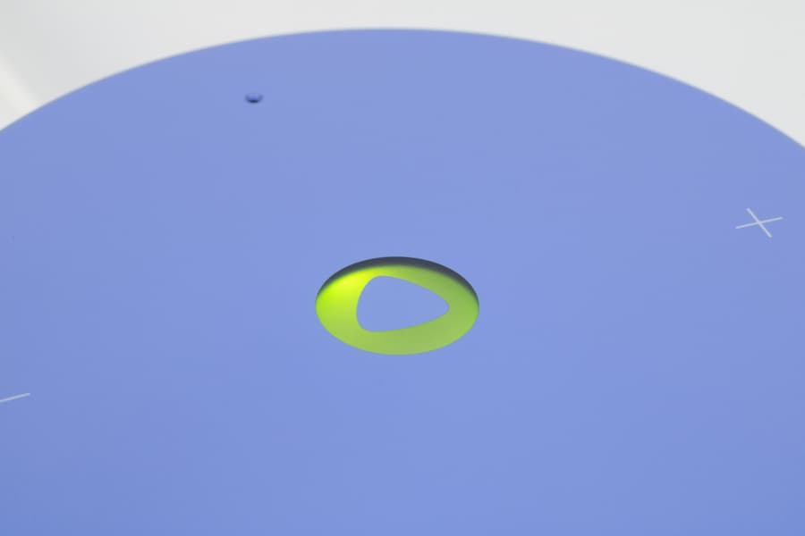 Индикатор светится фиолетовым, когда ассистент реагирует на запрос, и красным при отключении микрофона. Во время регулировки громкости он меняет цвет от зеленого на минимуме до красного на максимуме. Если нажать на него, когда Алиса что-то говорит, она сразу замолчит.
