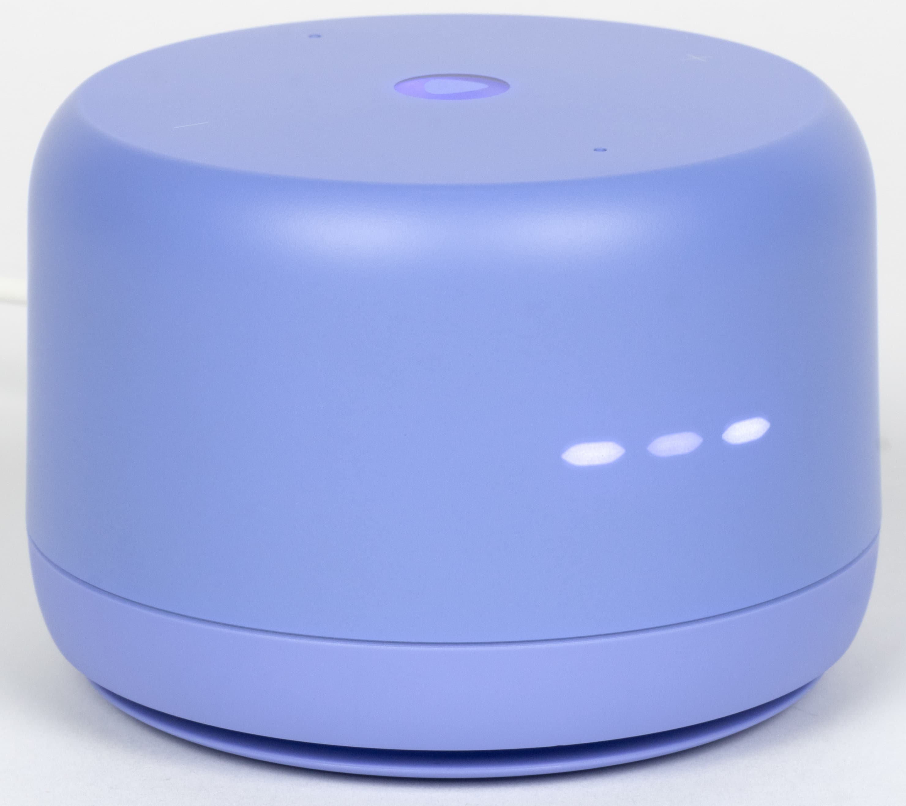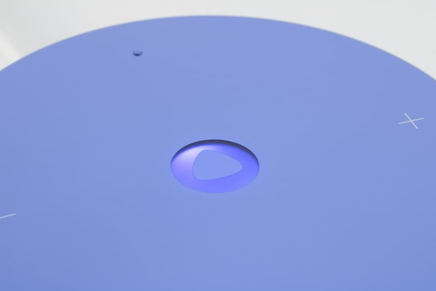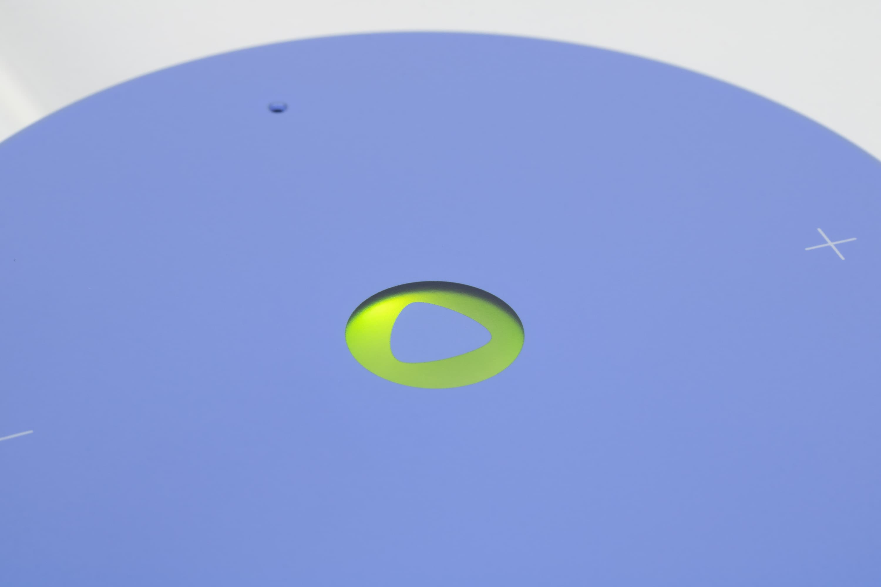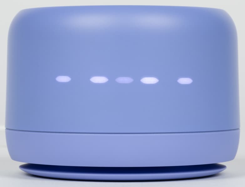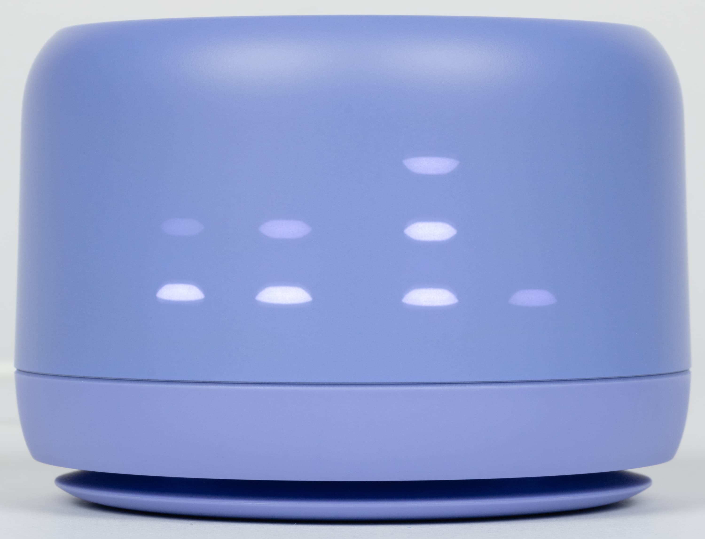 Индикатор светится фиолетовым, когда ассистент реагирует на запрос, и красным при отключении микрофона. Во время регулировки громкости он меняет цвет от зеленого на минимуме до красного на максимуме. Если нажать на него, когда Алиса что-то говорит, она сразу замолчит.