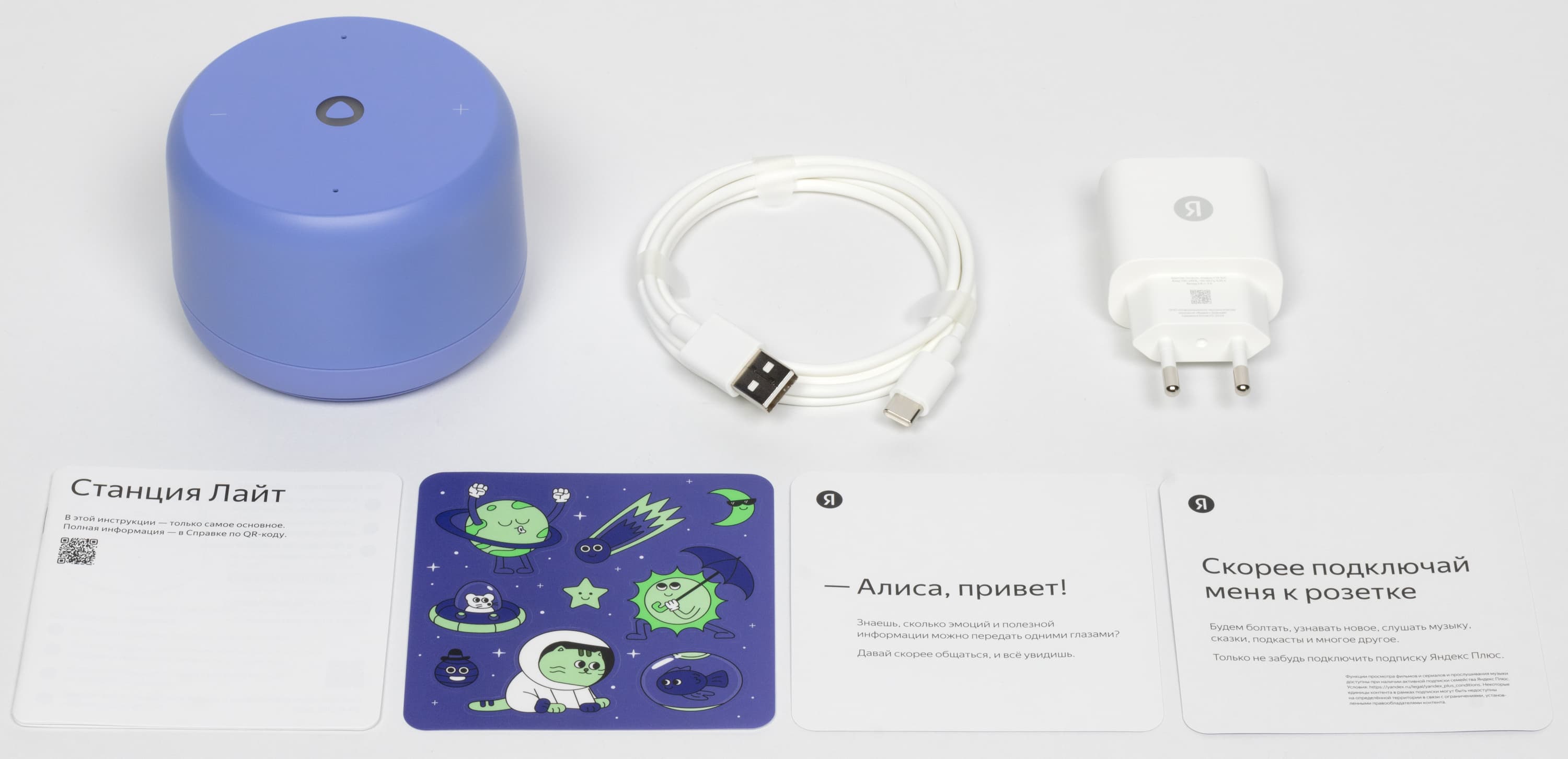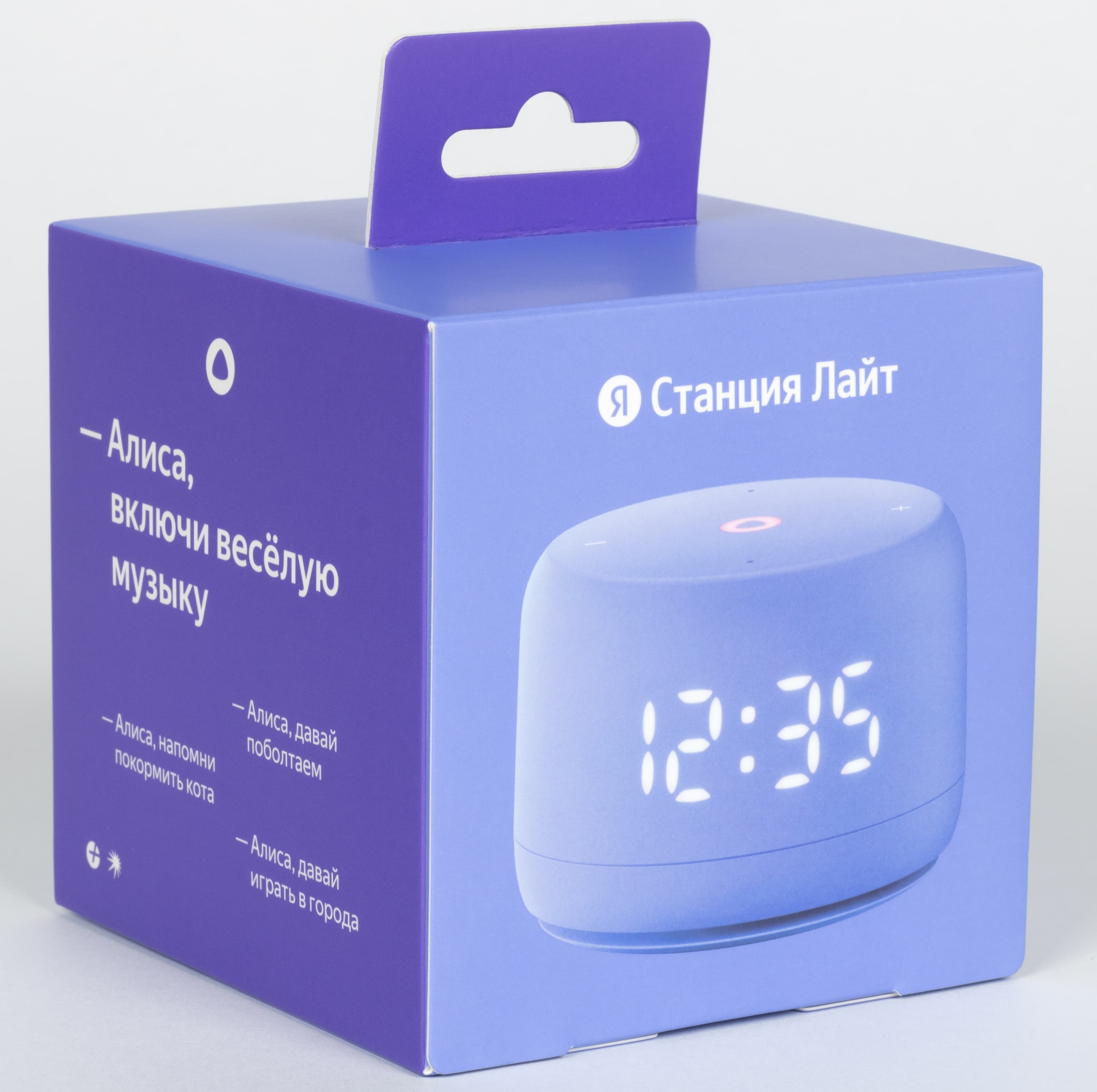 Поставляется «Яндекс Станция Лайт 2» в картонной коробке, окрашенной в цвет колонки внутри. На упаковку нанесены изображение устройства и его краткие характеристики, а также примеры команд голосовому ассистенту Алисе. Внутри колонка и аксессуары к ней надежно удерживаются с помощью картонного ложемента.