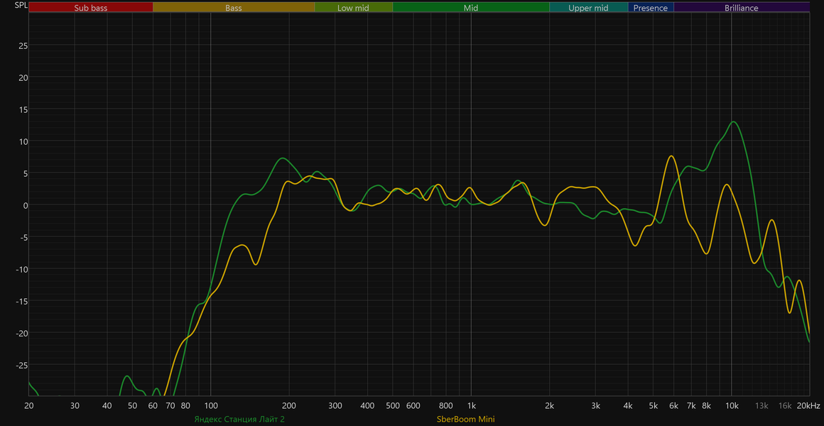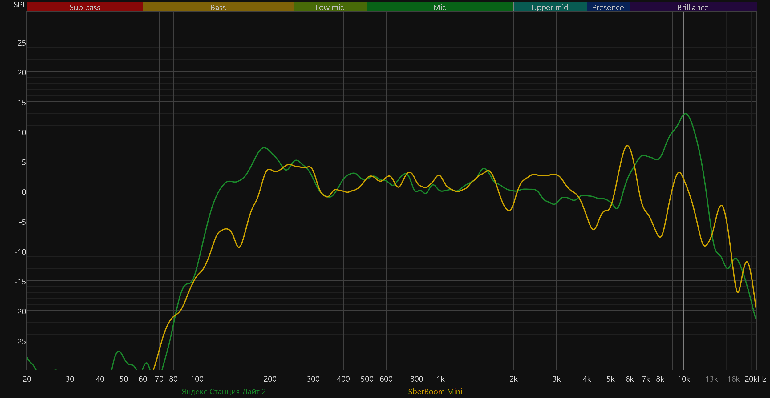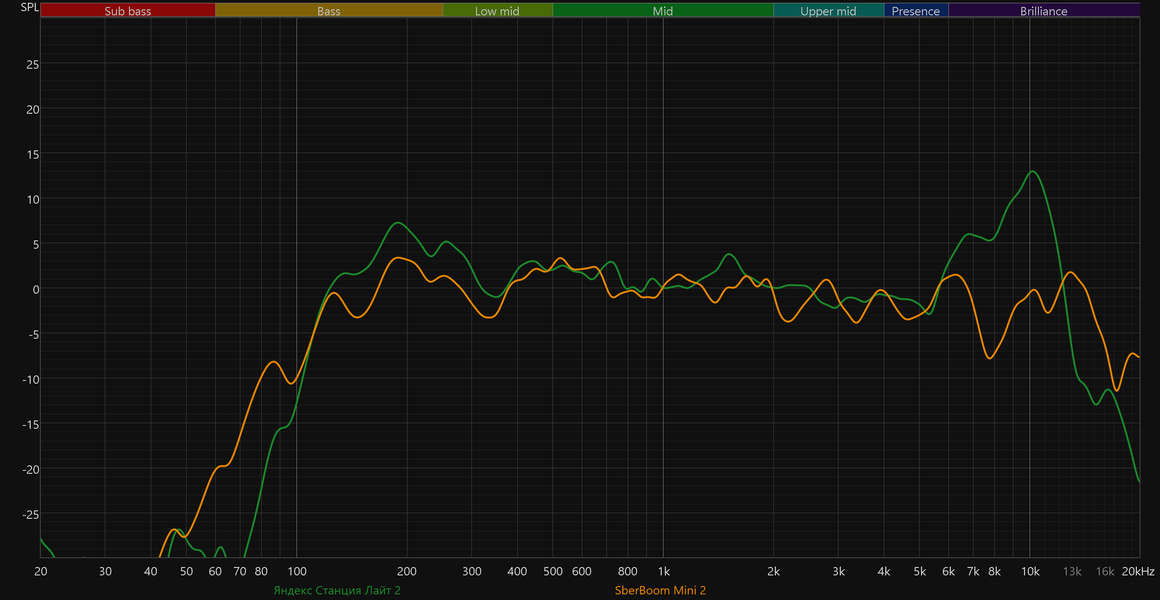 Со вышедшей недавно обновленной SberBoom Mini 2 практически паритет, если не брать в расчет упомянутый выше акцент на ВЧ. А вот предыдущая SberBoom Mini чуть проигрывает по объему низких частот.