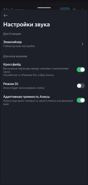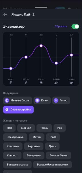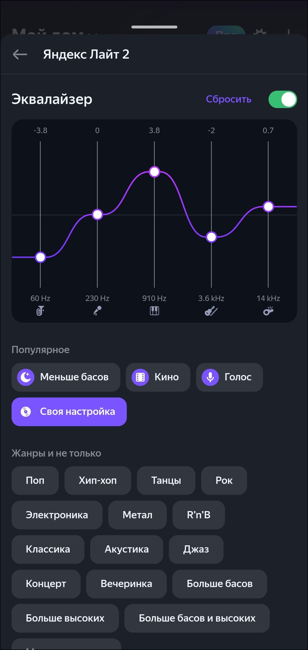 Посмотрим на настройки «Станции Лайт 2» в приложении. Режим «Не беспокоить» позволяет отключать все уведомления, запрещать входящие звонки, а также отключать экран с часами по расписанию. Колонку можно использовать в качестве радионяни, причем доступ к ней гибко настраивается. Например, можно разрешить слышать происходящее в детской комнате бабушкам и дедушкам — в общем тем, кто в данный момент присматривает за ребенком. Недавно был запущен кроссфейд — плавный переход между играющими в «Яндекс.Музыке» композициями, при котором песни перетекают друг в друга без пауз. Он также активируется через приложение. Ну и, наконец, есть пятиполосный эквалайзер с множеством пресетов на все случаи жизни. Сразу заметим, что при подключении источника посредством Bluetooth он не работает.