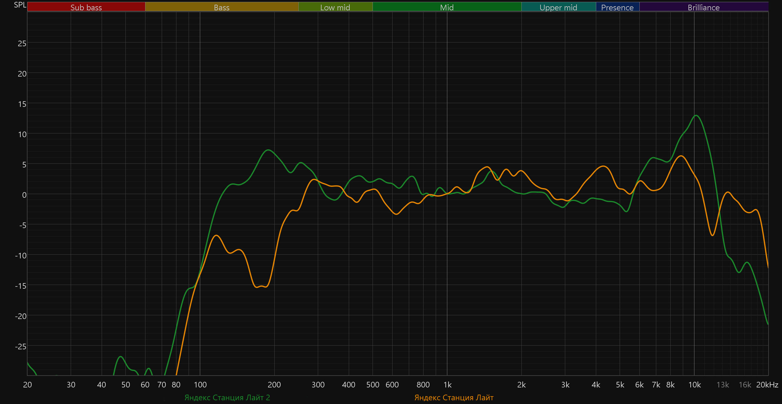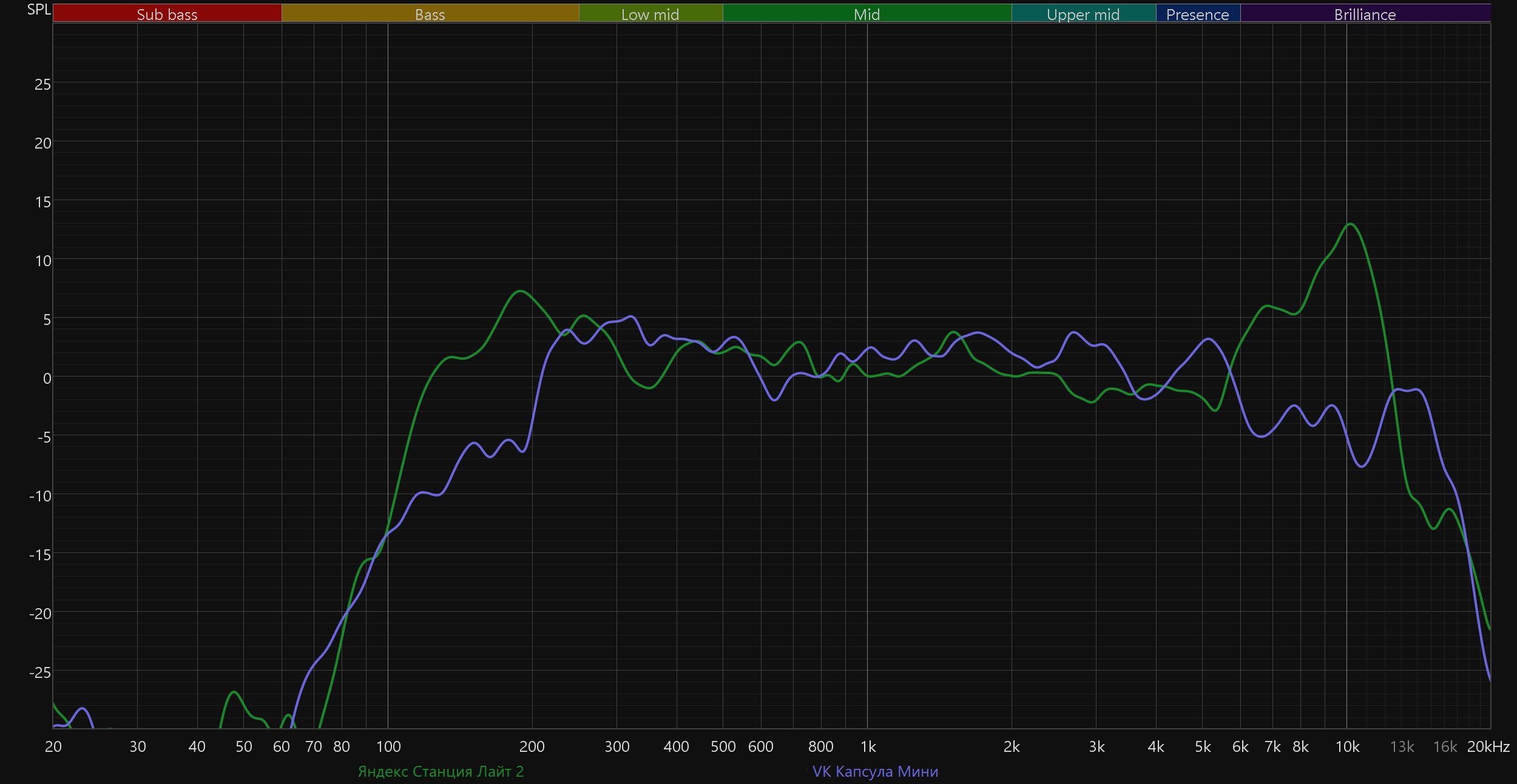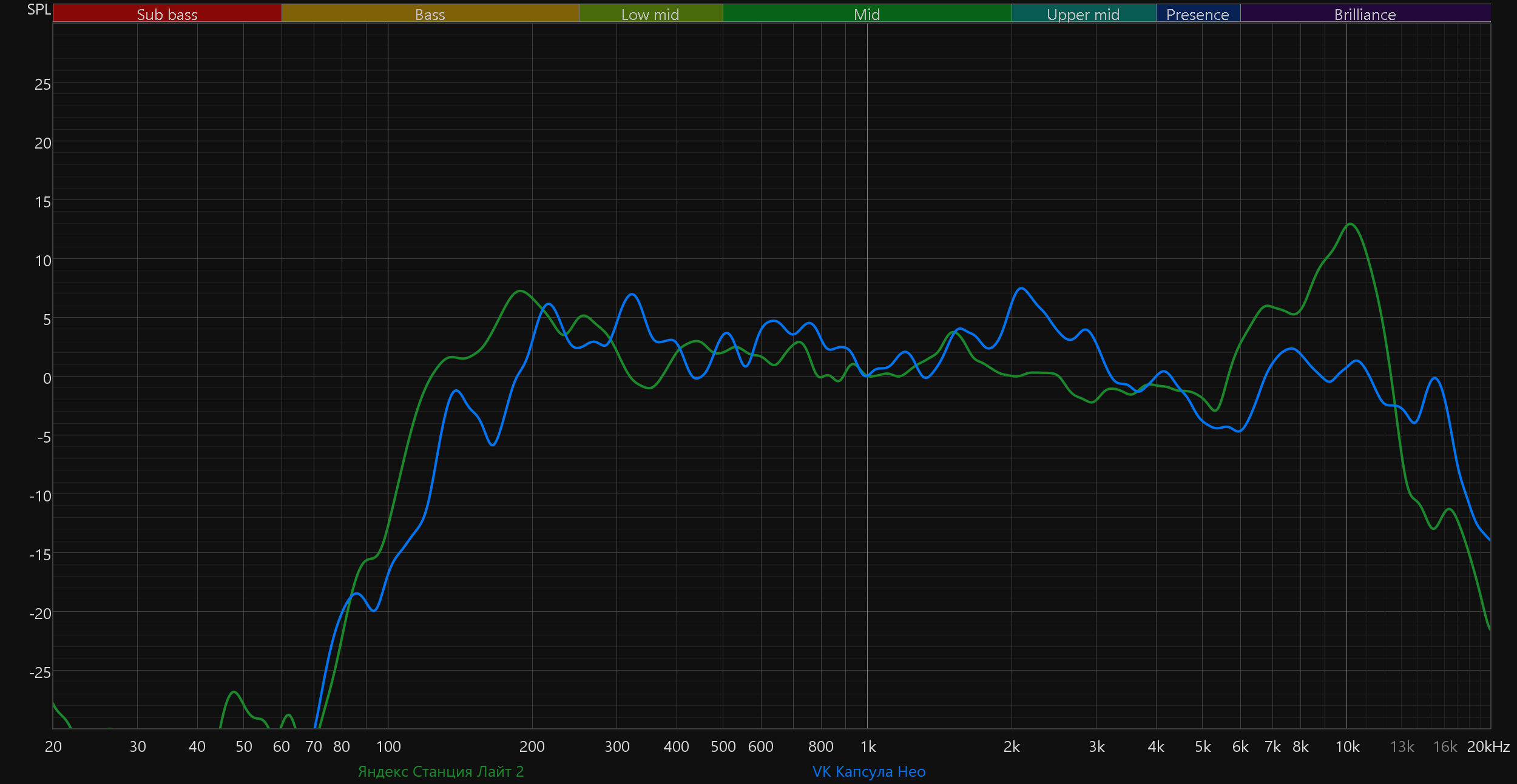 Ну и, наконец, две смарт-колонки VK. Обе не дотягивают по низким частотам, а «VK Капсула Нео» еще и не способна обеспечить столь же «ровную» середину, несмотря на некоторое внешнее сходство.