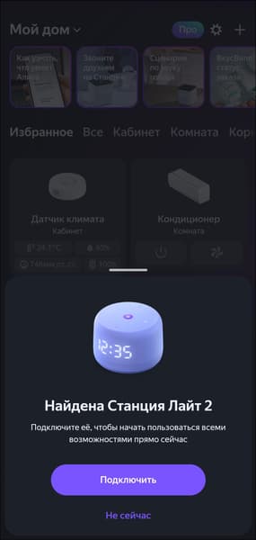 Процесс подключения колонки мы неоднократно показывали — он давно не менялся. Все инструкции голосовая помощница Алиса проговаривает вслух, достаточно им следовать, и всё получится. После первого включения колонки приложение самостоятельно обнаруживает ее и предлагает добавить в систему.