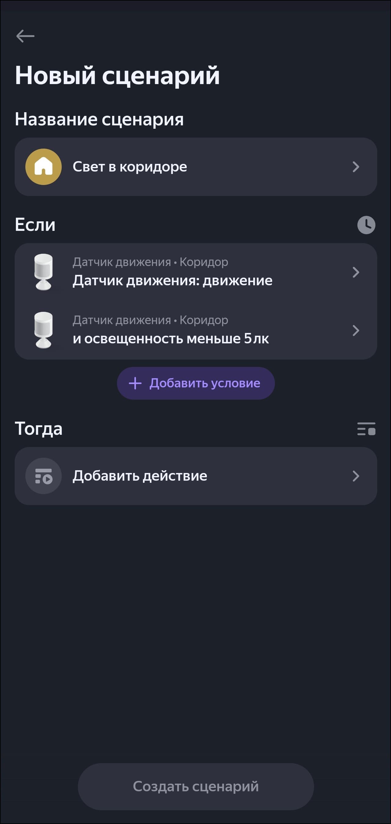 Готово, теперь когда кто-то проходит по темному коридору, на минуту включается неяркая подсветка. Вроде бы простейшая задача, но еще совсем недавно предлагаемая «Яндексом» система «умного дома» решить ее не могла. К счастью, эти времена позади.