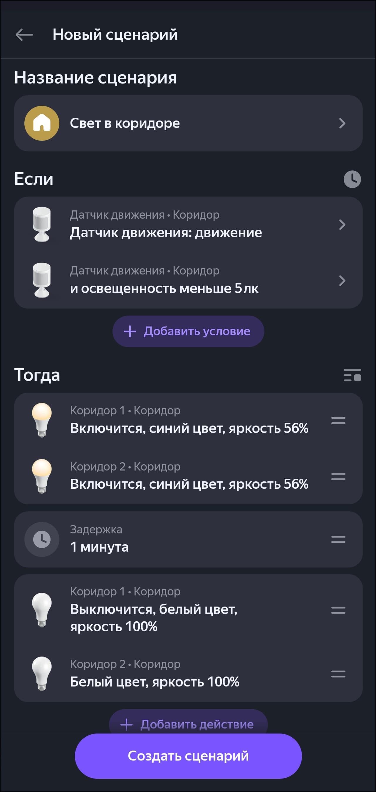 Возьмем простой пример. У нас есть коридор, в котором нужно включать свет по срабатыванию датчика движения, но только в том случае, если датчик освещенности сообщает о том, что для этого достаточно темно. Добавляем в систему датчики движения и освещенности (два датчика в одном корпусе), создаем два условия: если освещенность ниже определенного порога и если сработал датчик движения. Далее создаем действие — две лампы включаются и неярко светят синим цветом, слегка подсвечивая помещение. Создаем задержку — лампы светят минуту, потом отключаются и возвращают прежние уровень яркости и цвет, чтобы при следующем включении по команде не пришлось менять их в «ручном режиме».