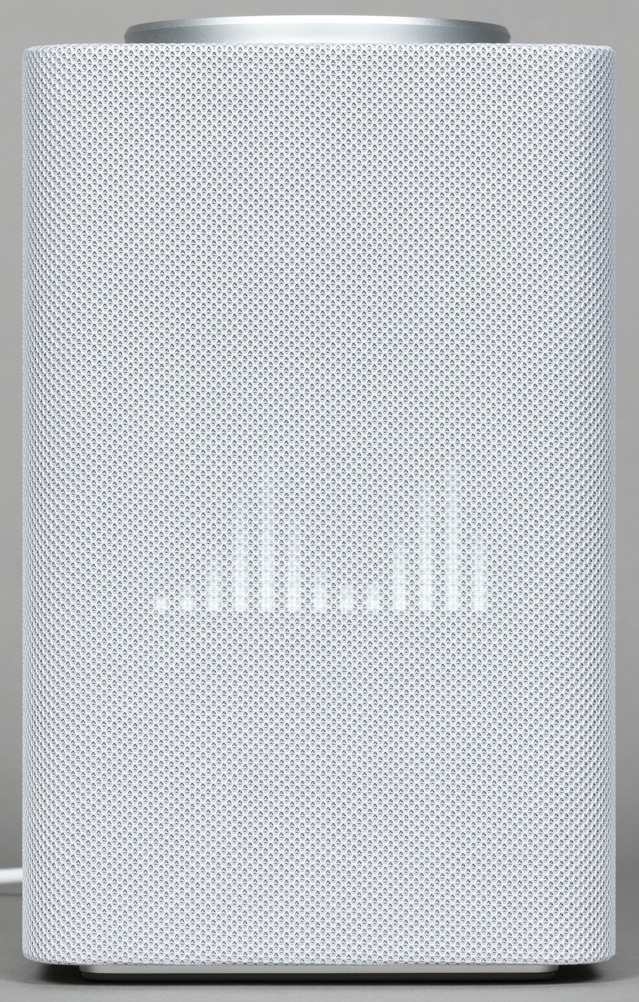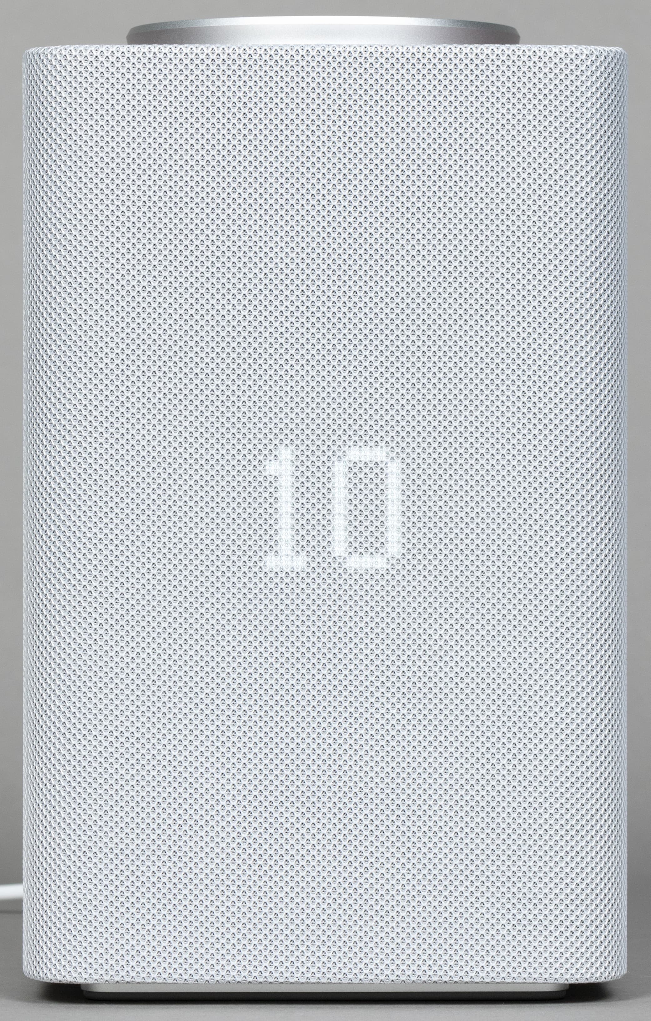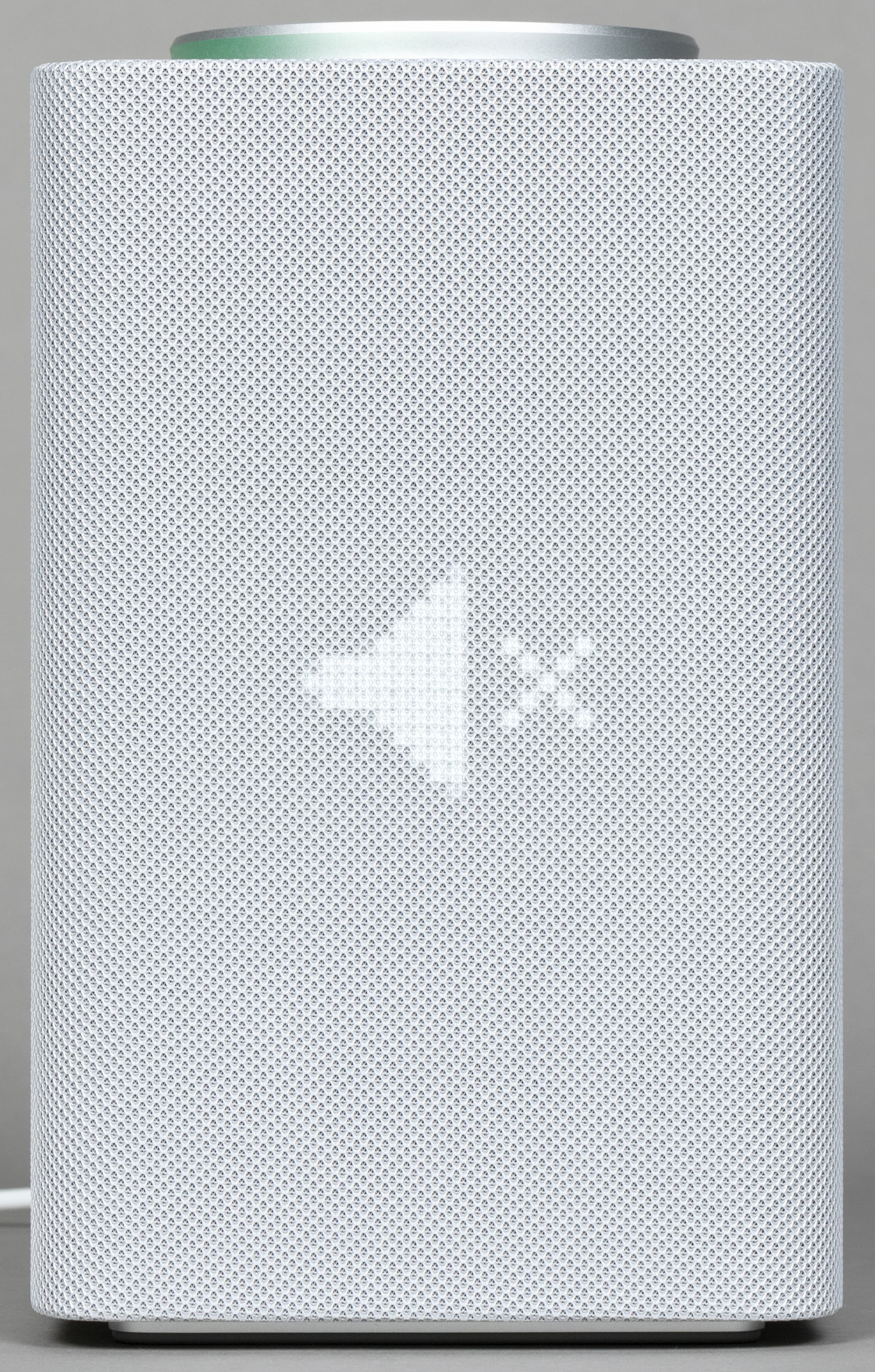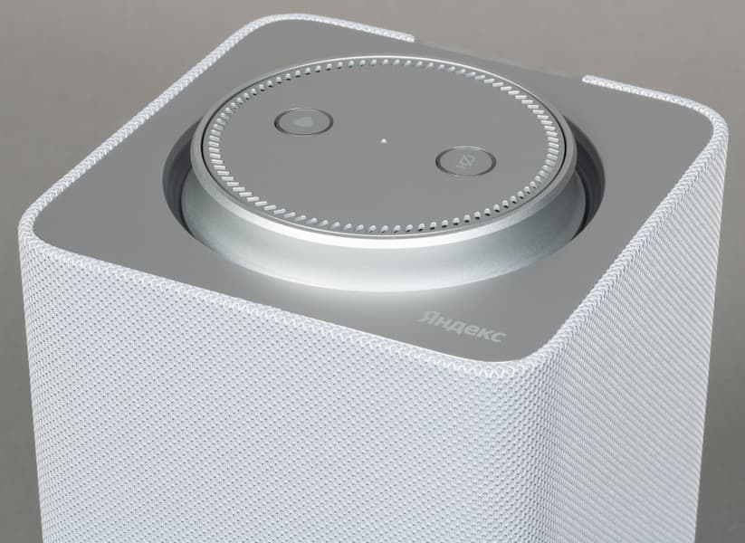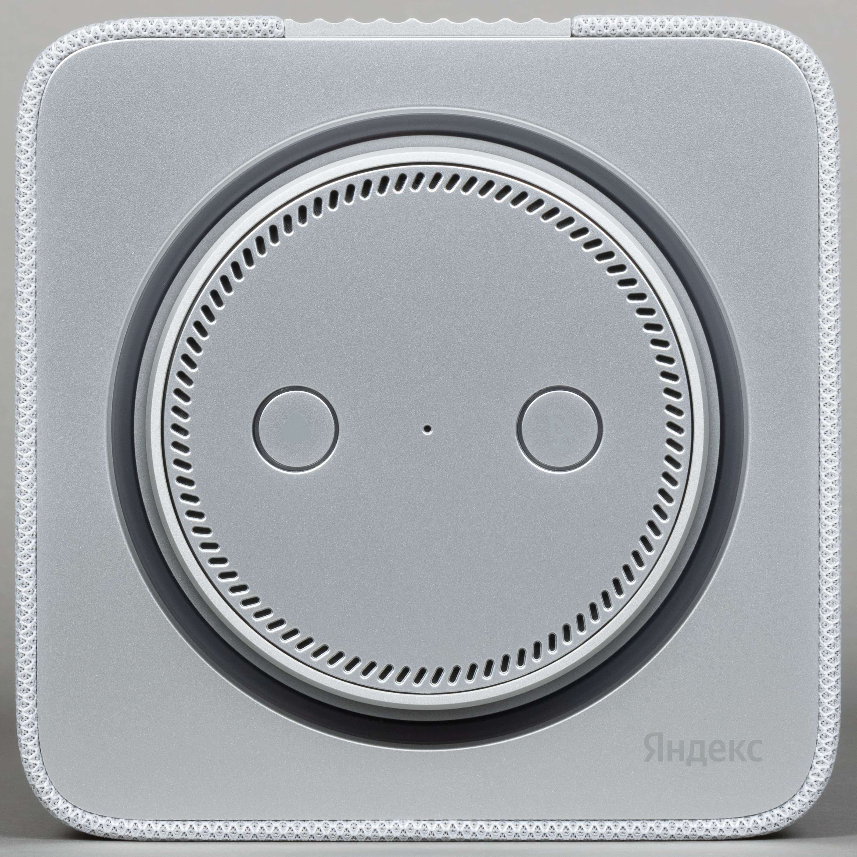 Сверху находится небольшая круглая панель управления: поворотное кольцо регулировки звука и две кнопки. За перфорацией по периметру размещены микрофоны, служащие для «общения» с голосовым ассистентом.