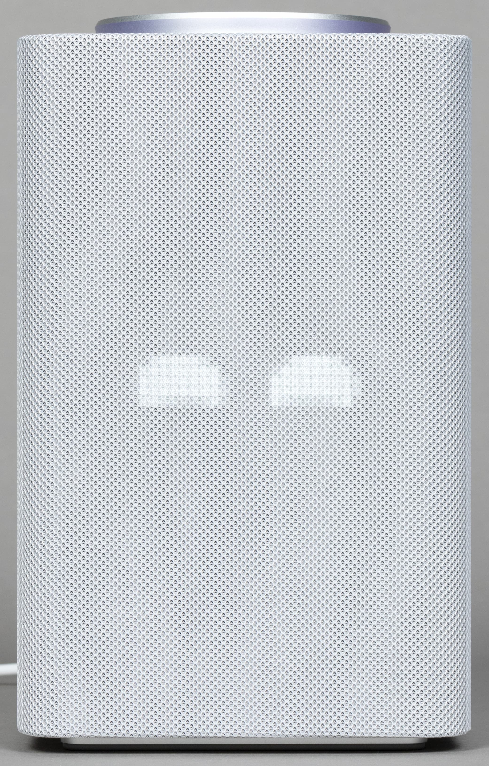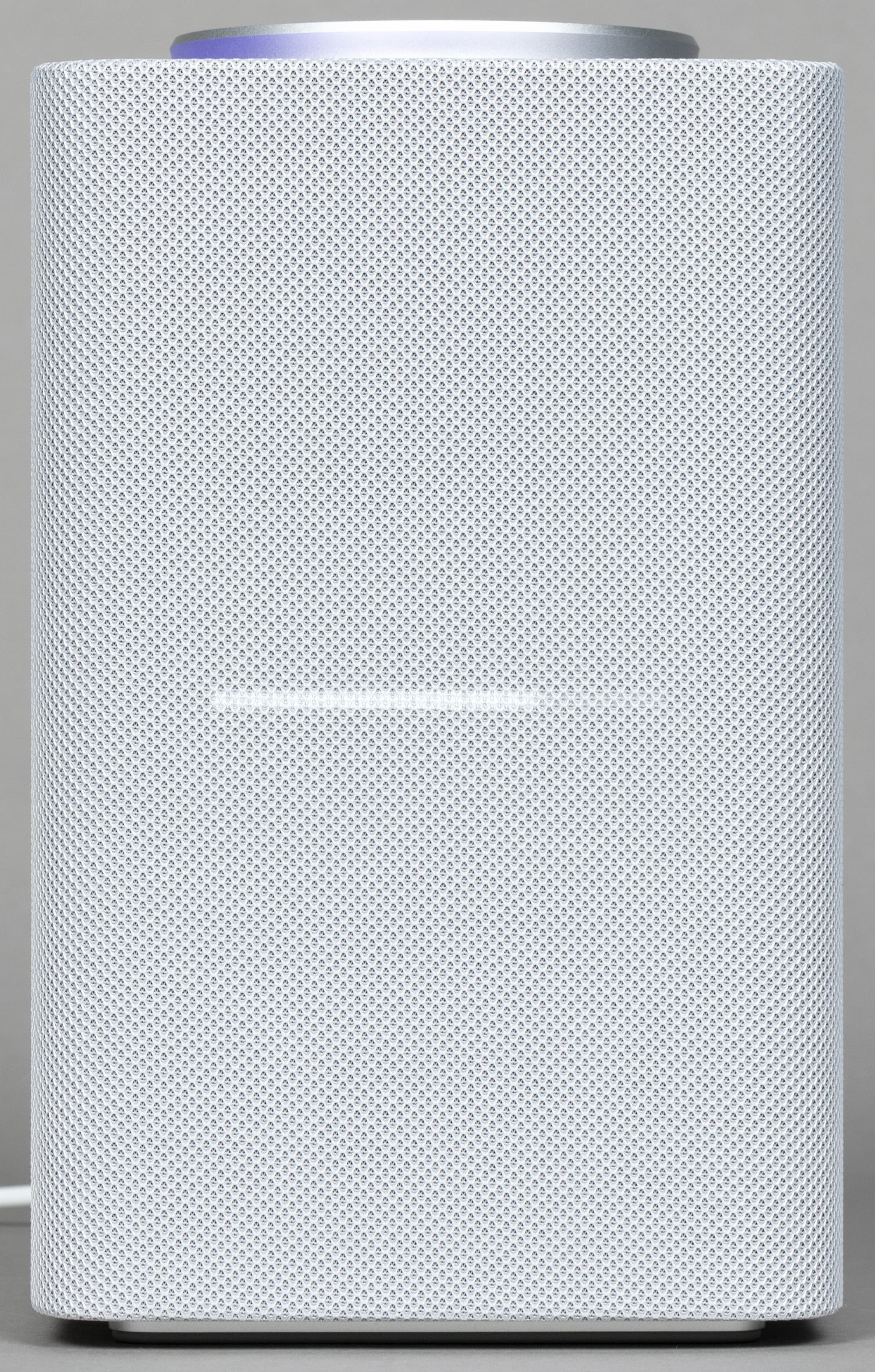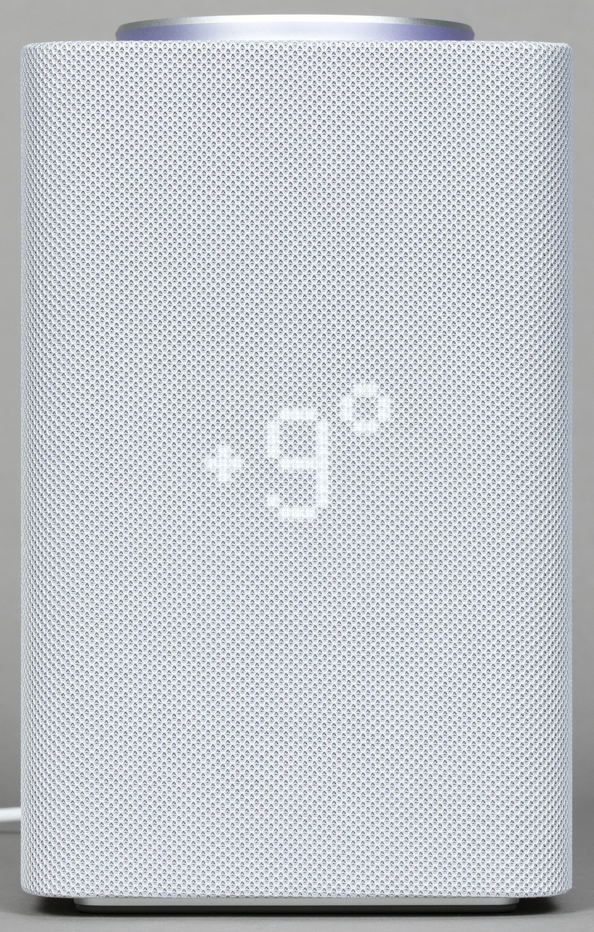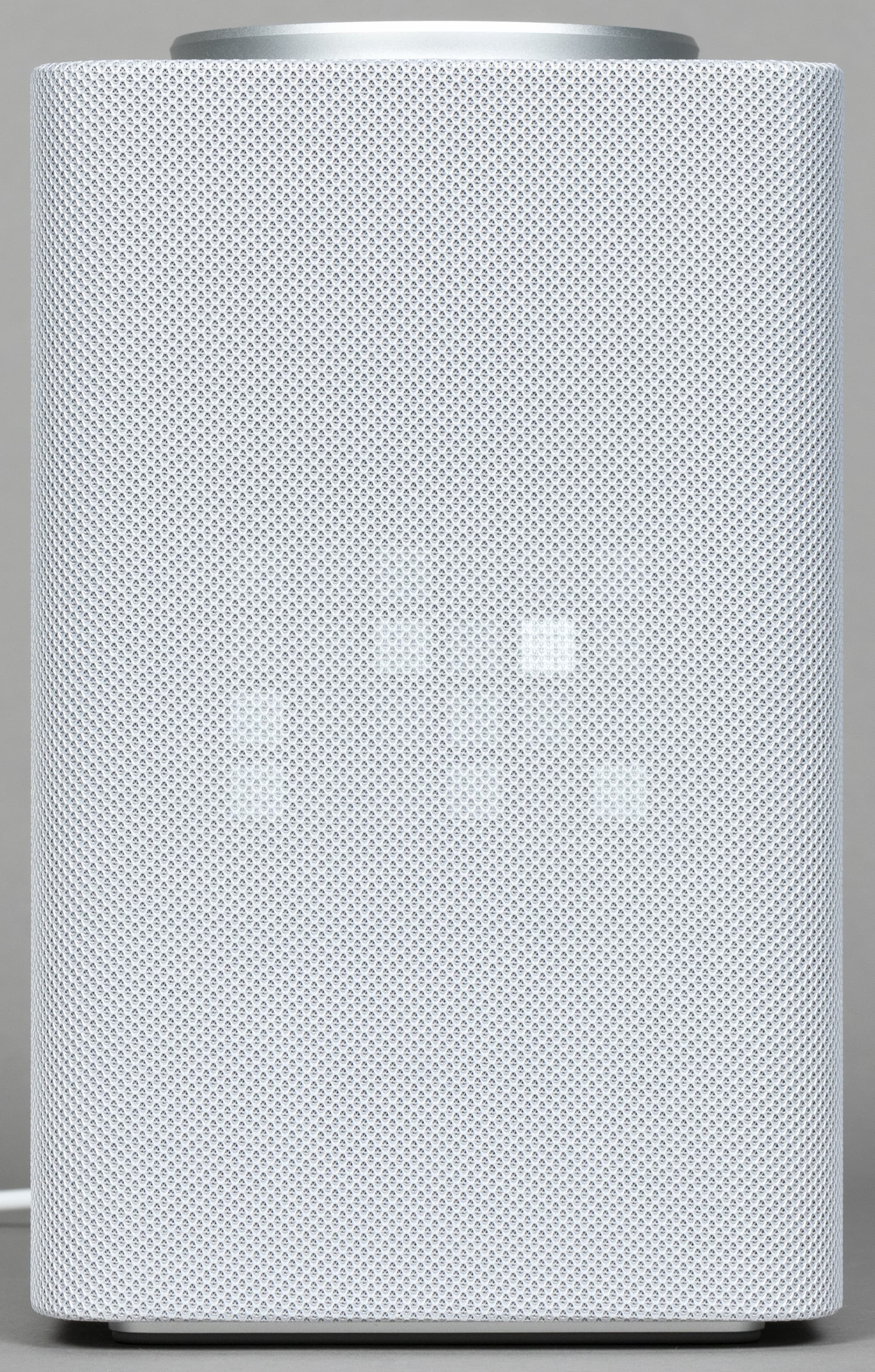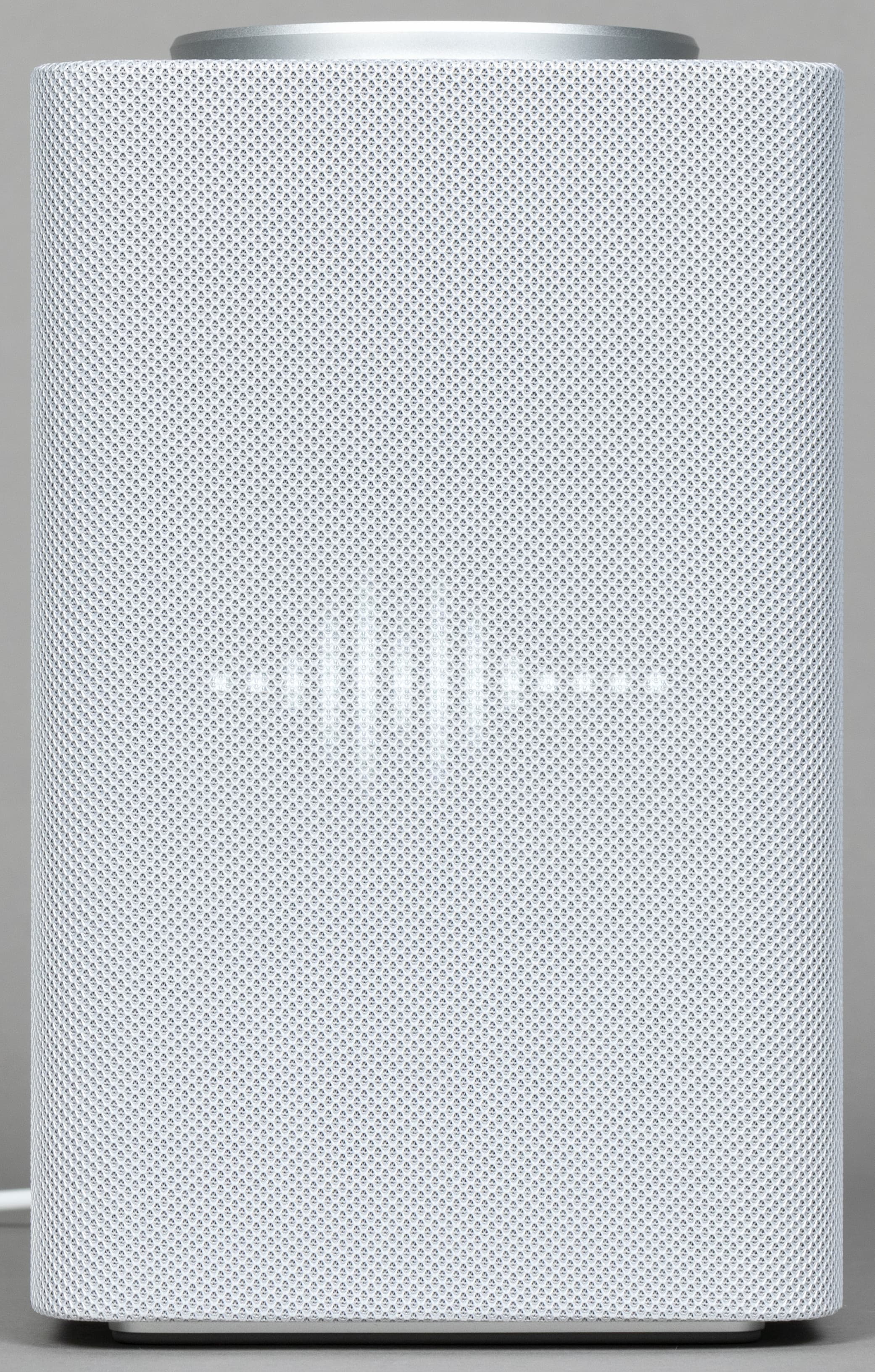 Сверху находится небольшая круглая панель управления: поворотное кольцо регулировки звука и две кнопки. За перфорацией по периметру размещены микрофоны, служащие для «общения» с голосовым ассистентом.
