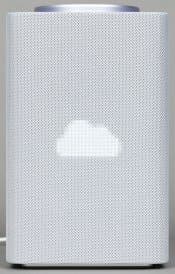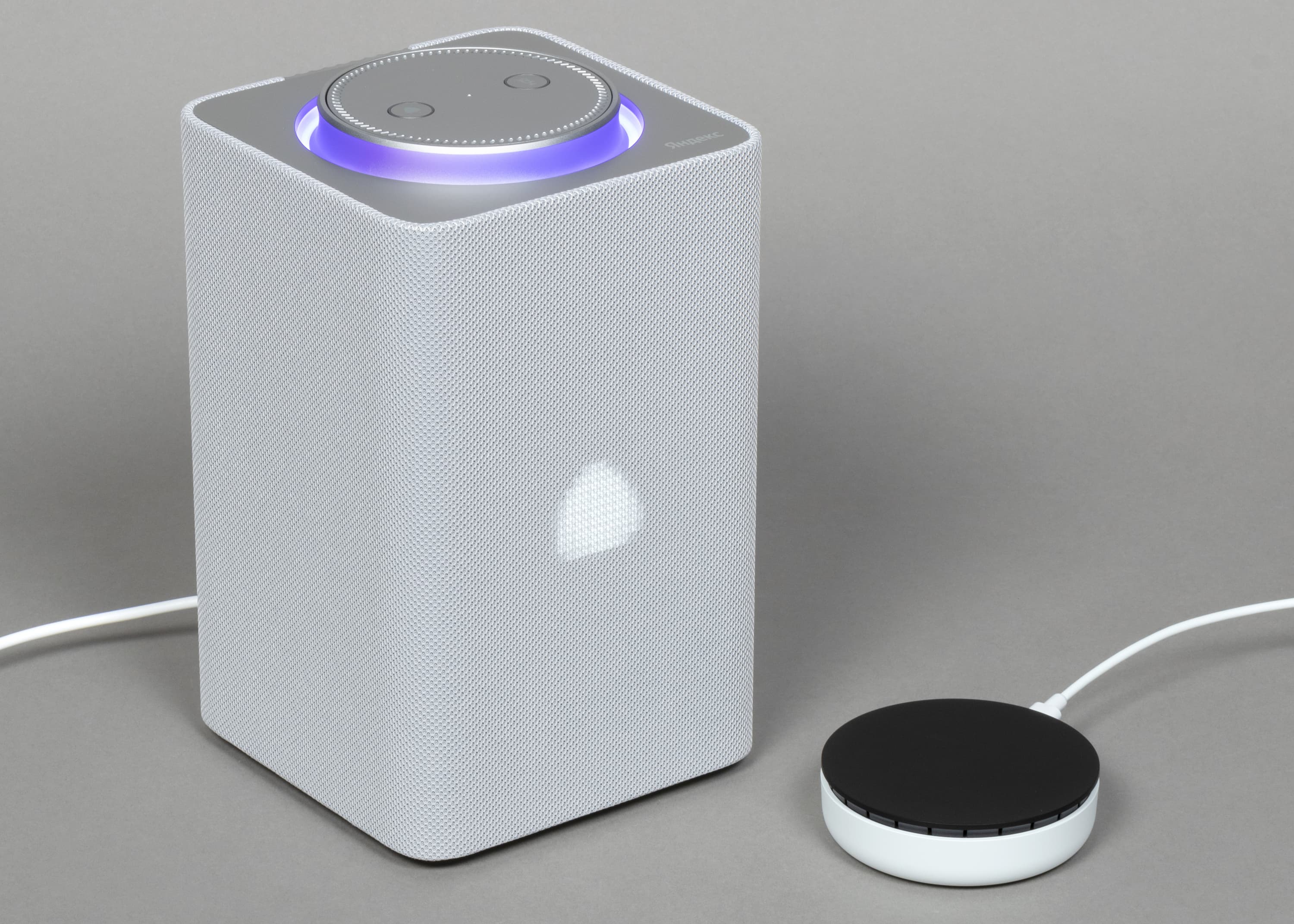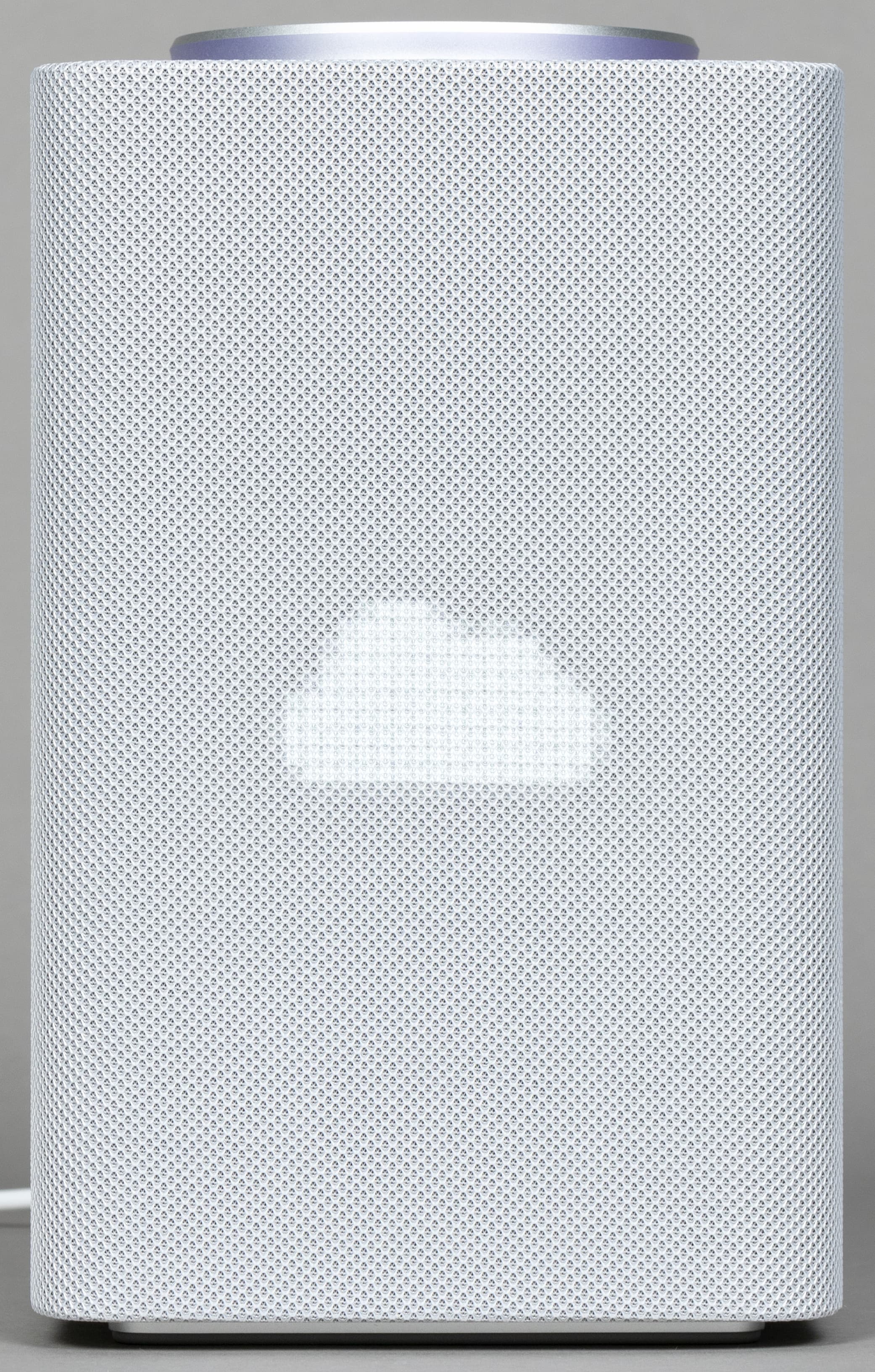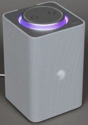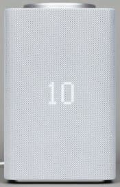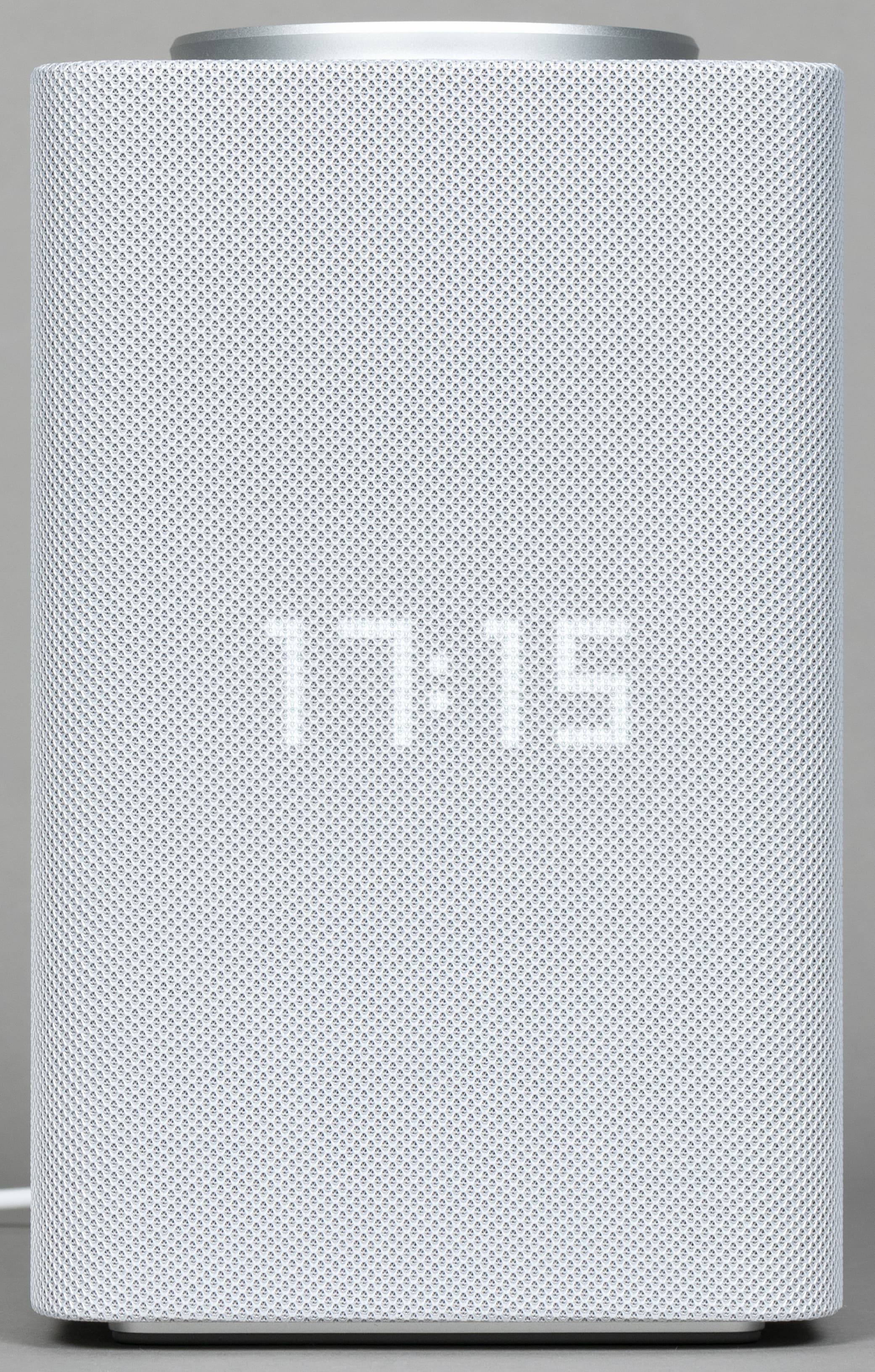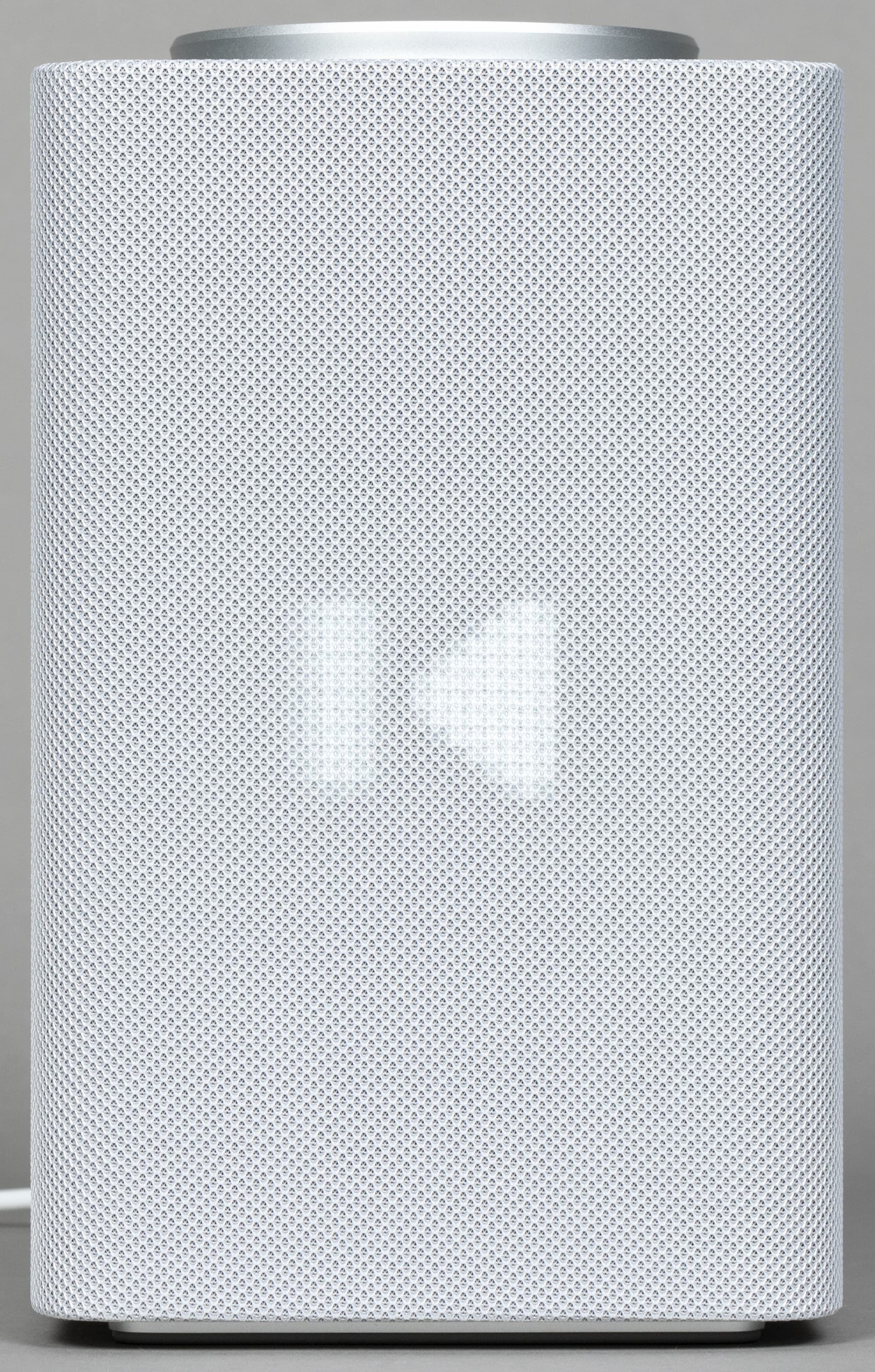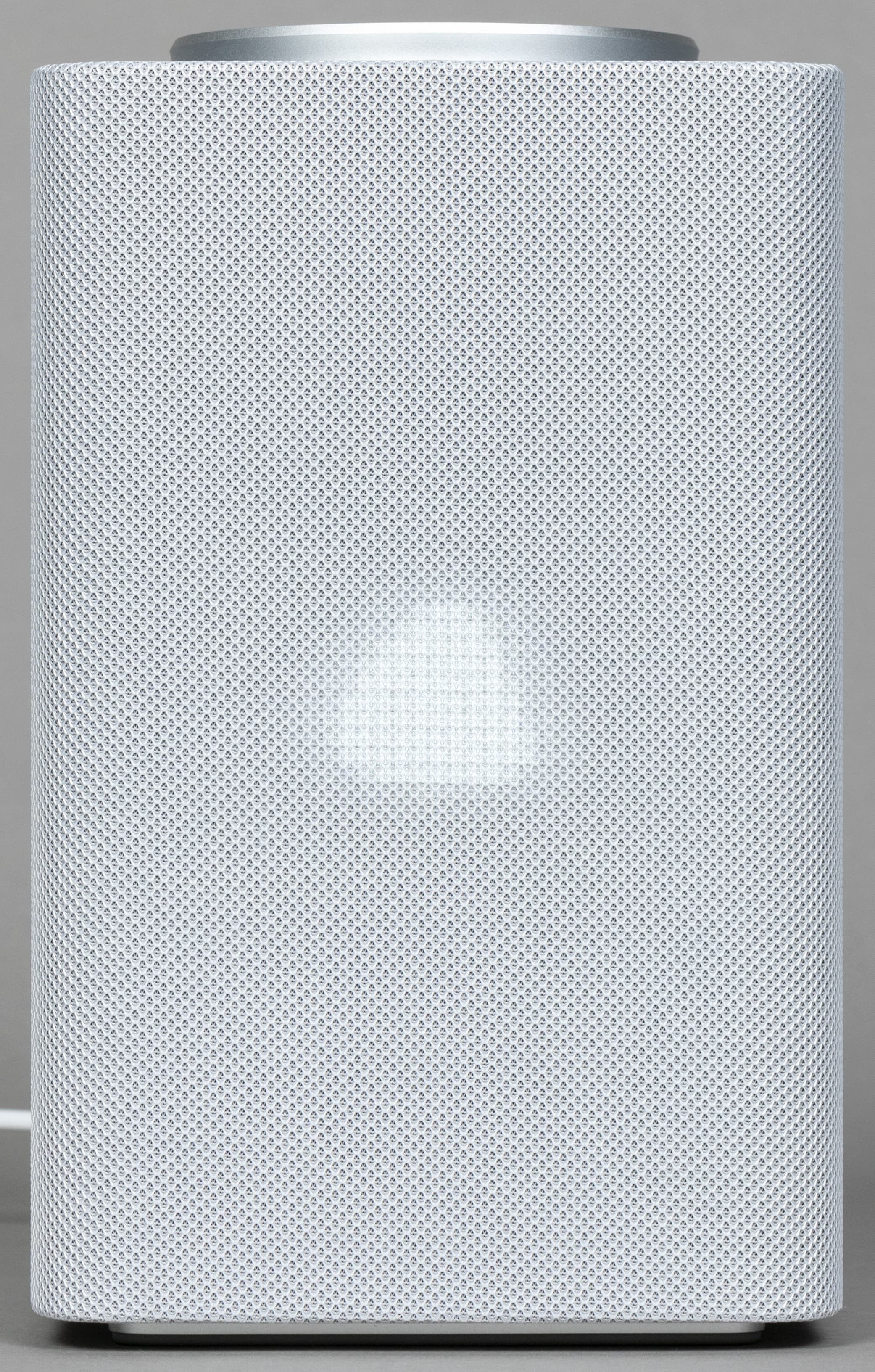Сверху находится небольшая круглая панель управления: поворотное кольцо регулировки звука и две кнопки. За перфорацией по периметру размещены микрофоны, служащие для «общения» с голосовым ассистентом.