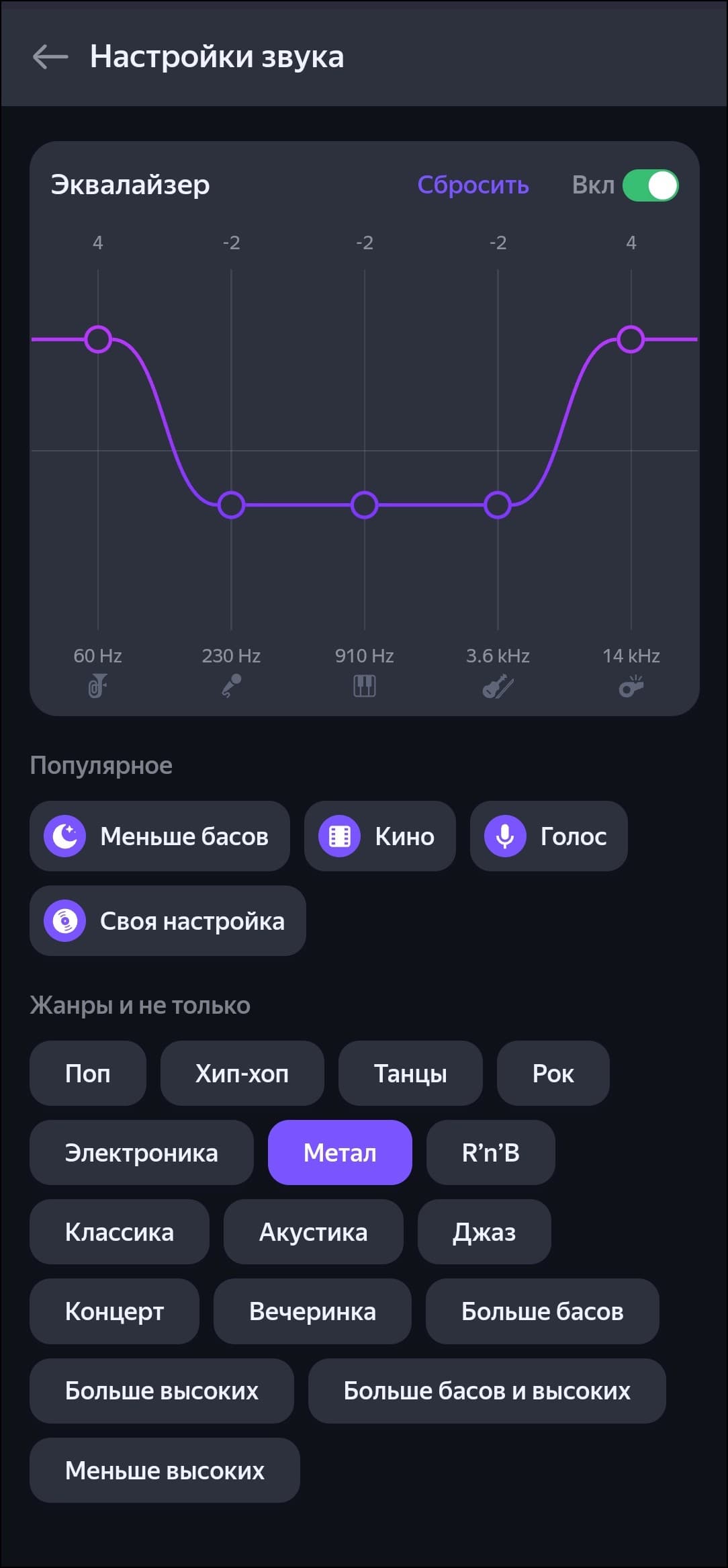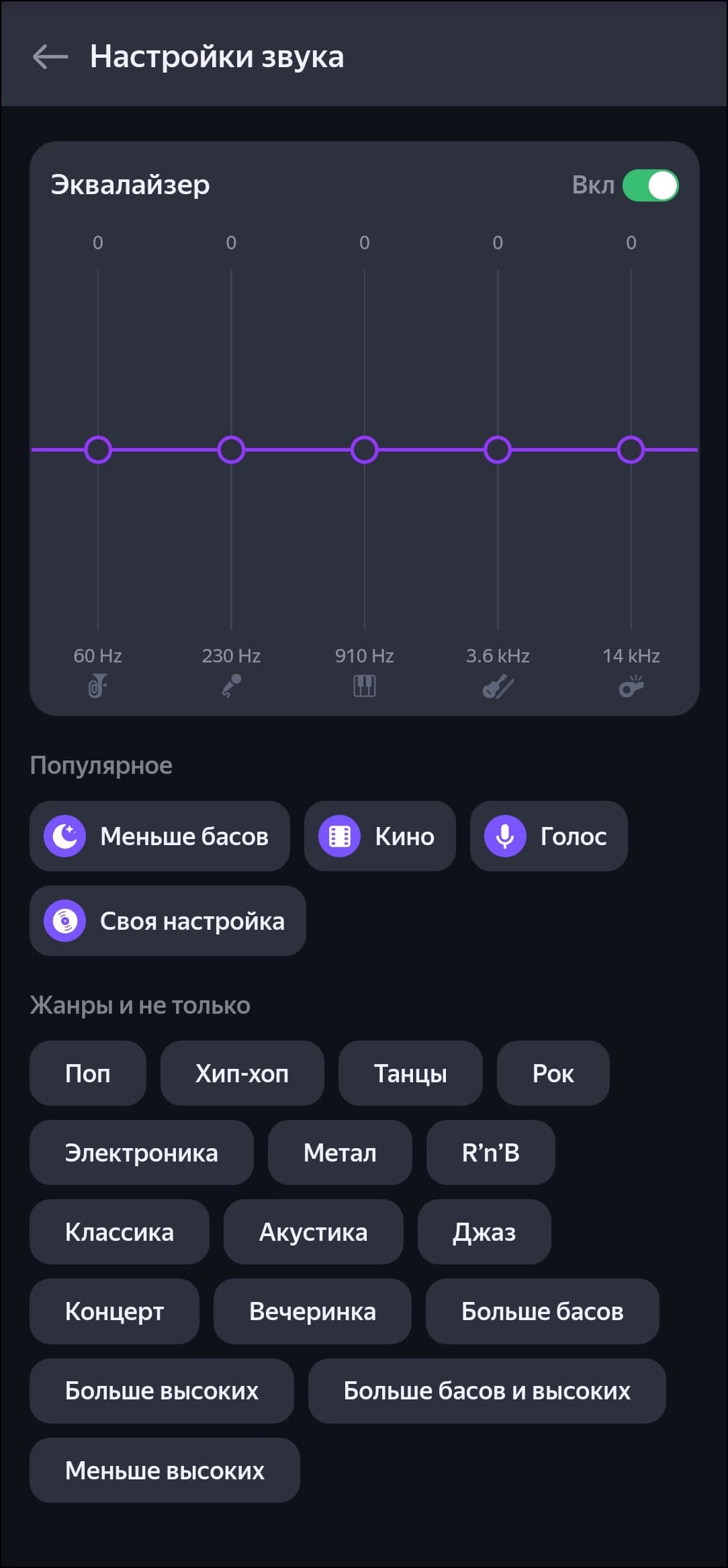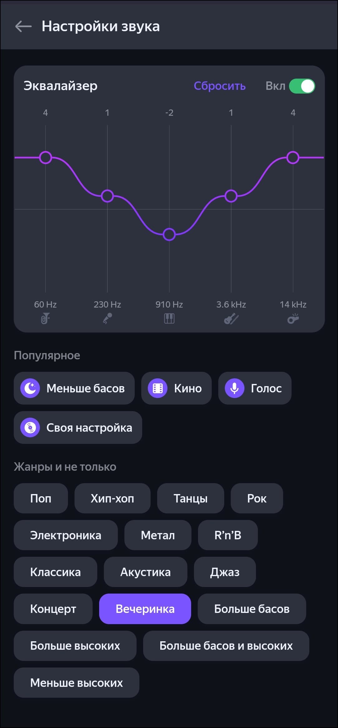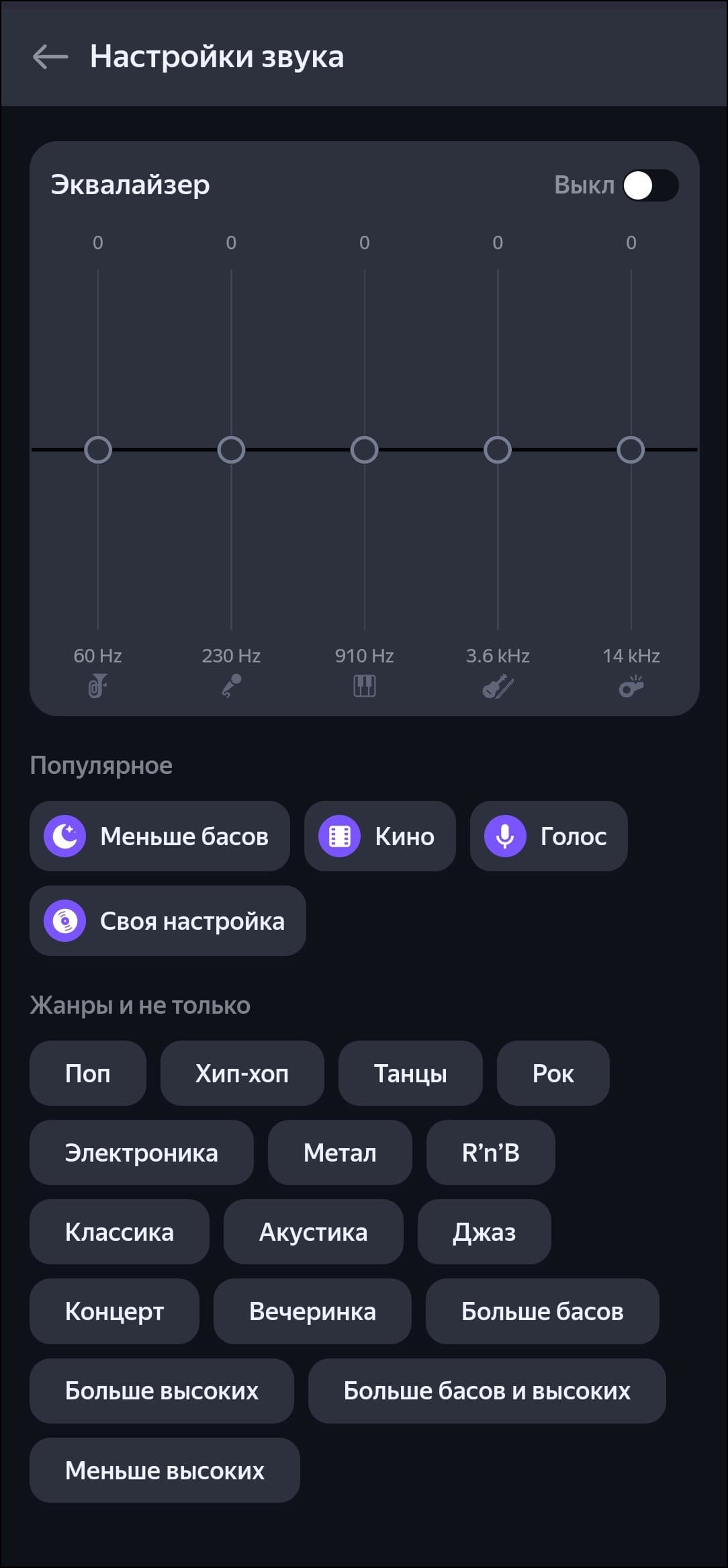 В «Станции 2» мы увидели замечательный эквалайзер, есть он и у героини сегодняшнего обзора. Ранее Яндекс анонсировал еще и систему автоматической коррекции под помещение, но позже выяснилось, что качество работы у нее... спорное. В общем, от него отказались. Ну и хорошо, зато есть пять полос и куча пресетов на все случаи жизни.