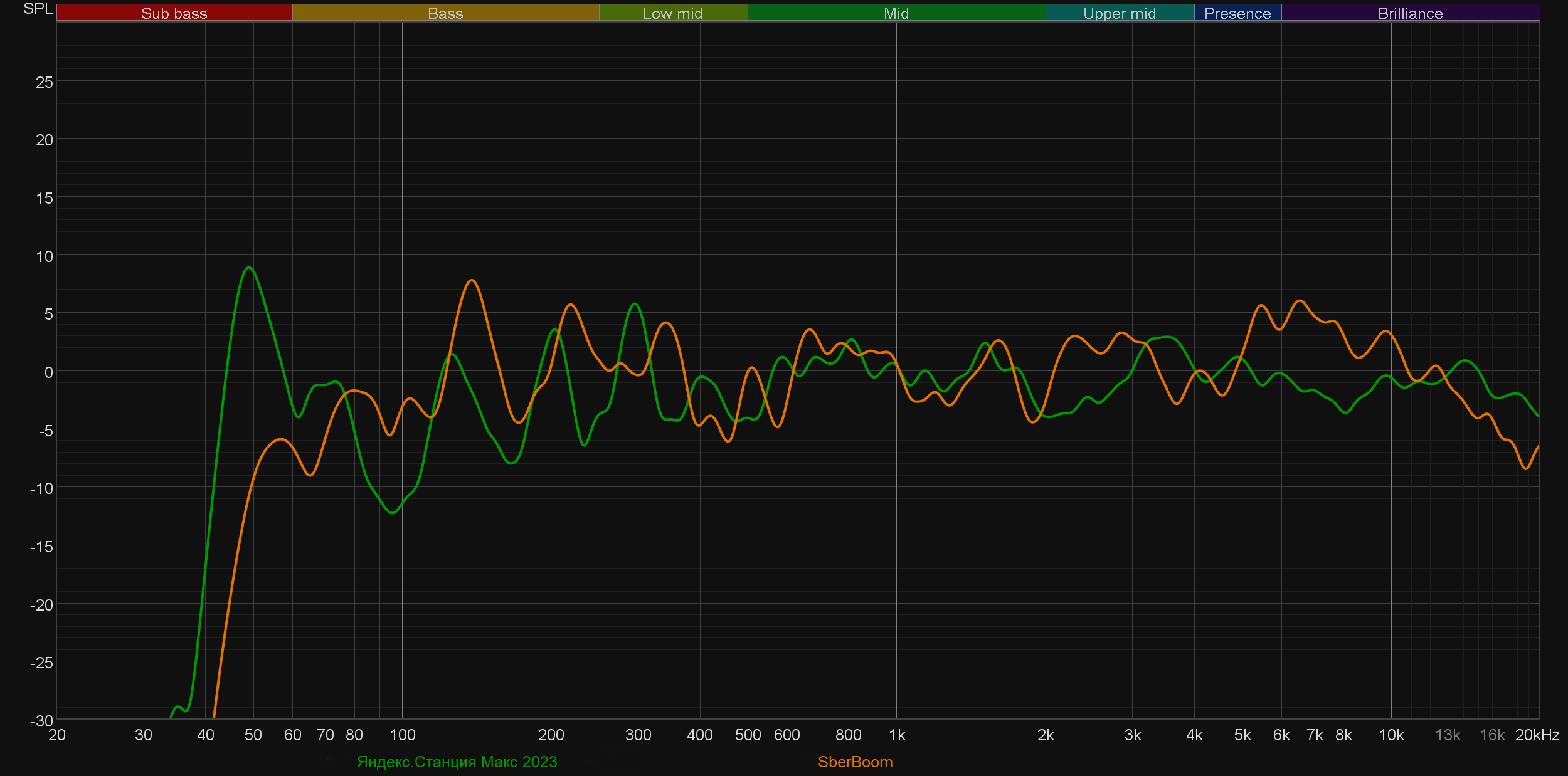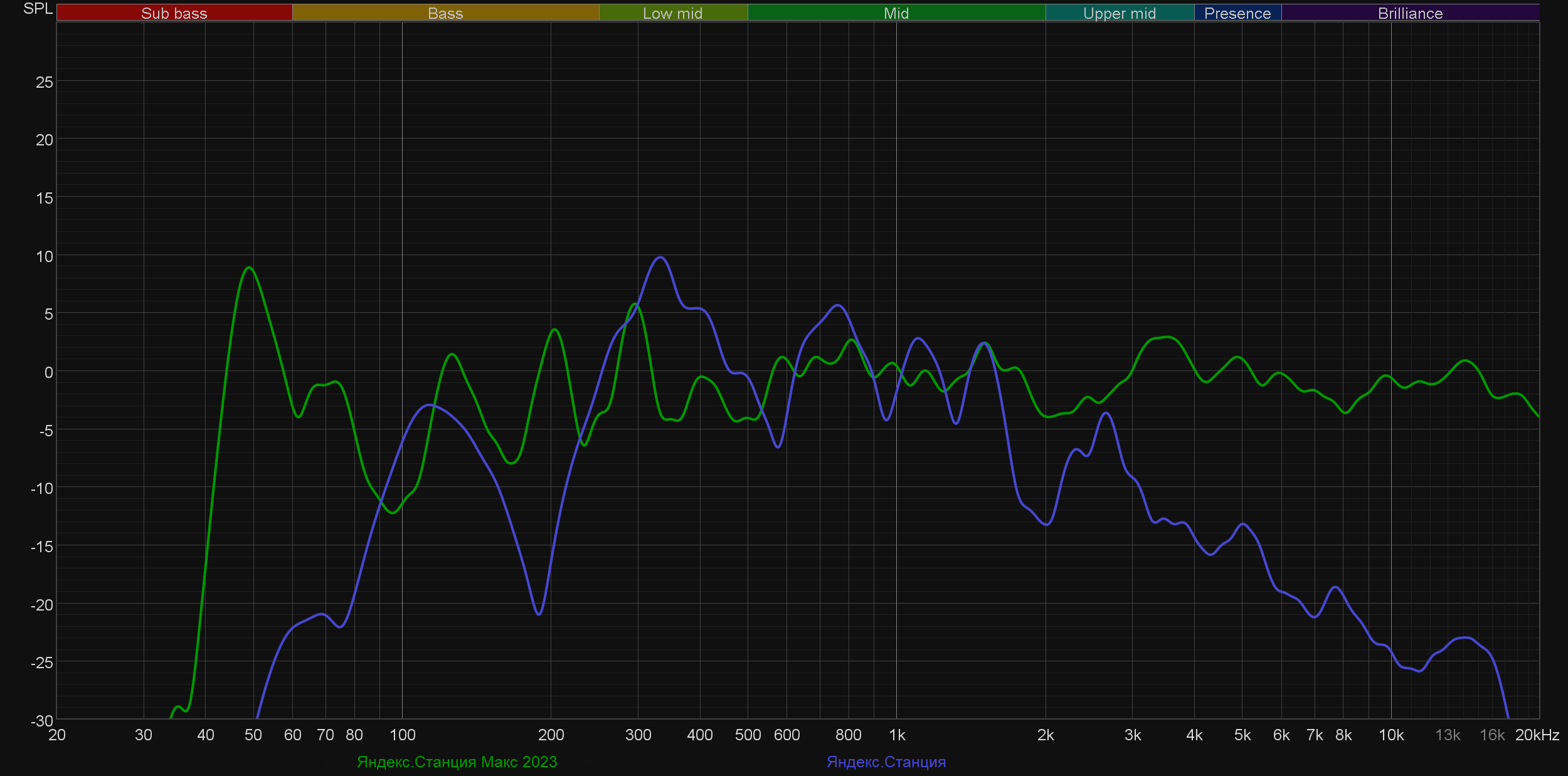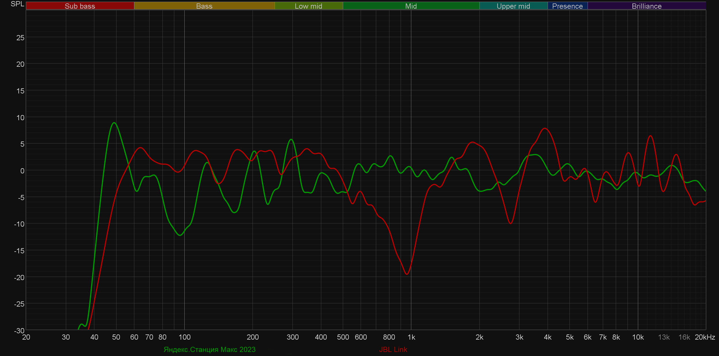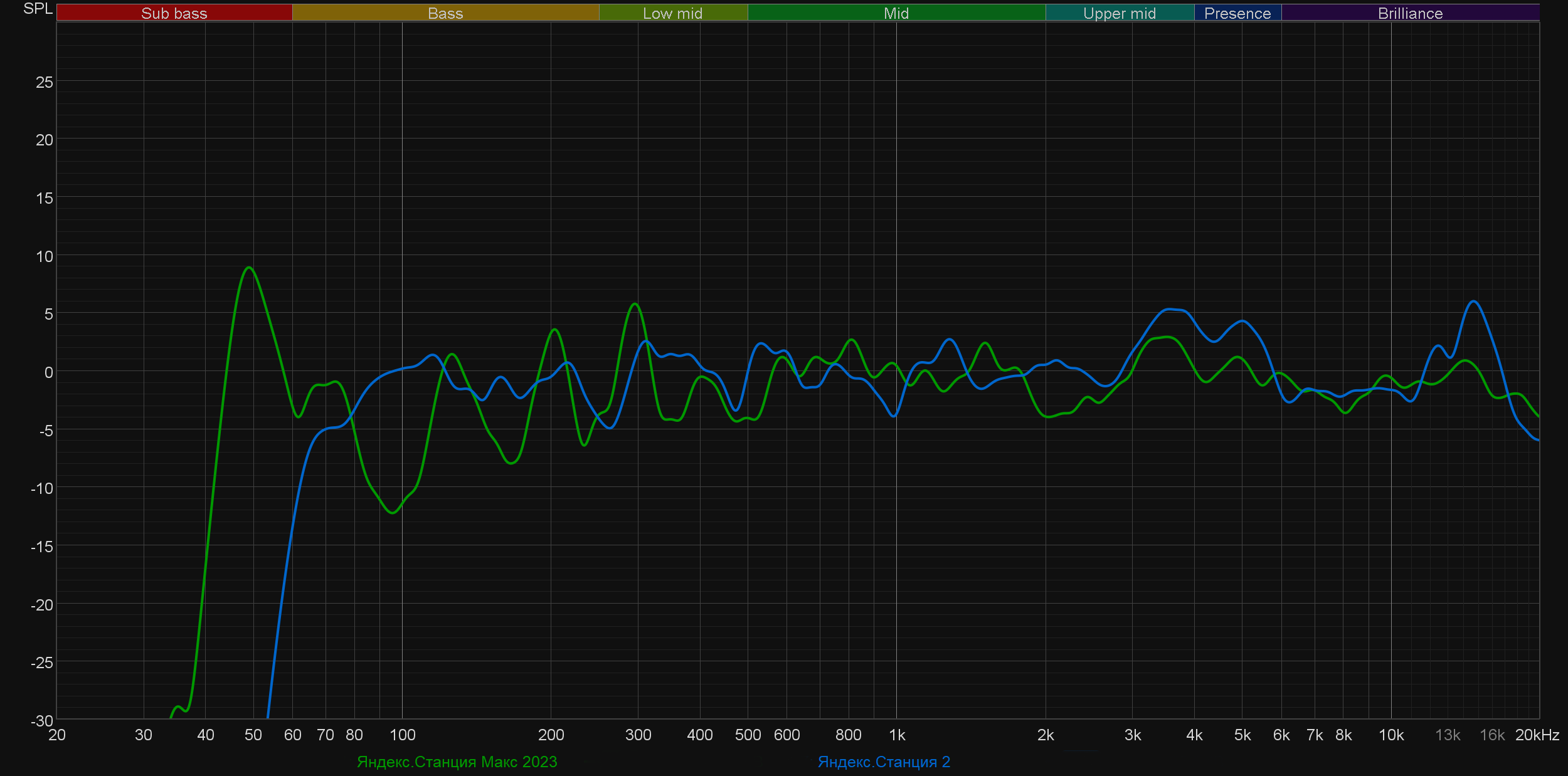 Ну и под конец сравним графики АЧХ тестируемого устройства и других смарт-колонок похожих габаритов — сначала тех, которые поддерживают Алису, а потом — и остальных. По иллюстрациям всё понятно, вряд ли там нужны какие-либо комментарии.