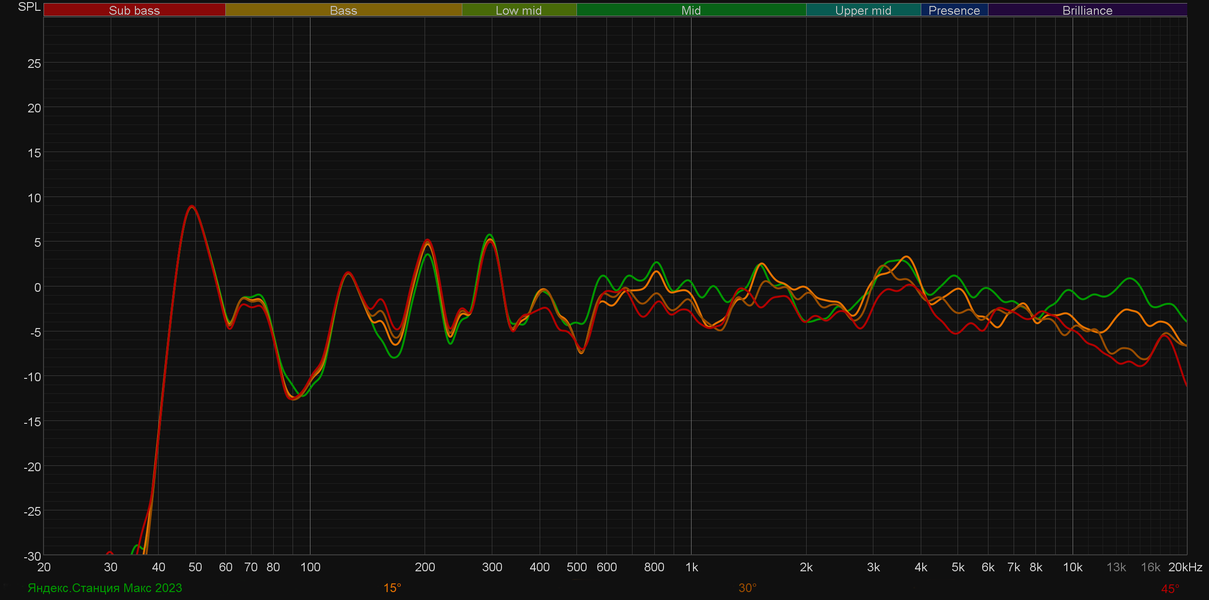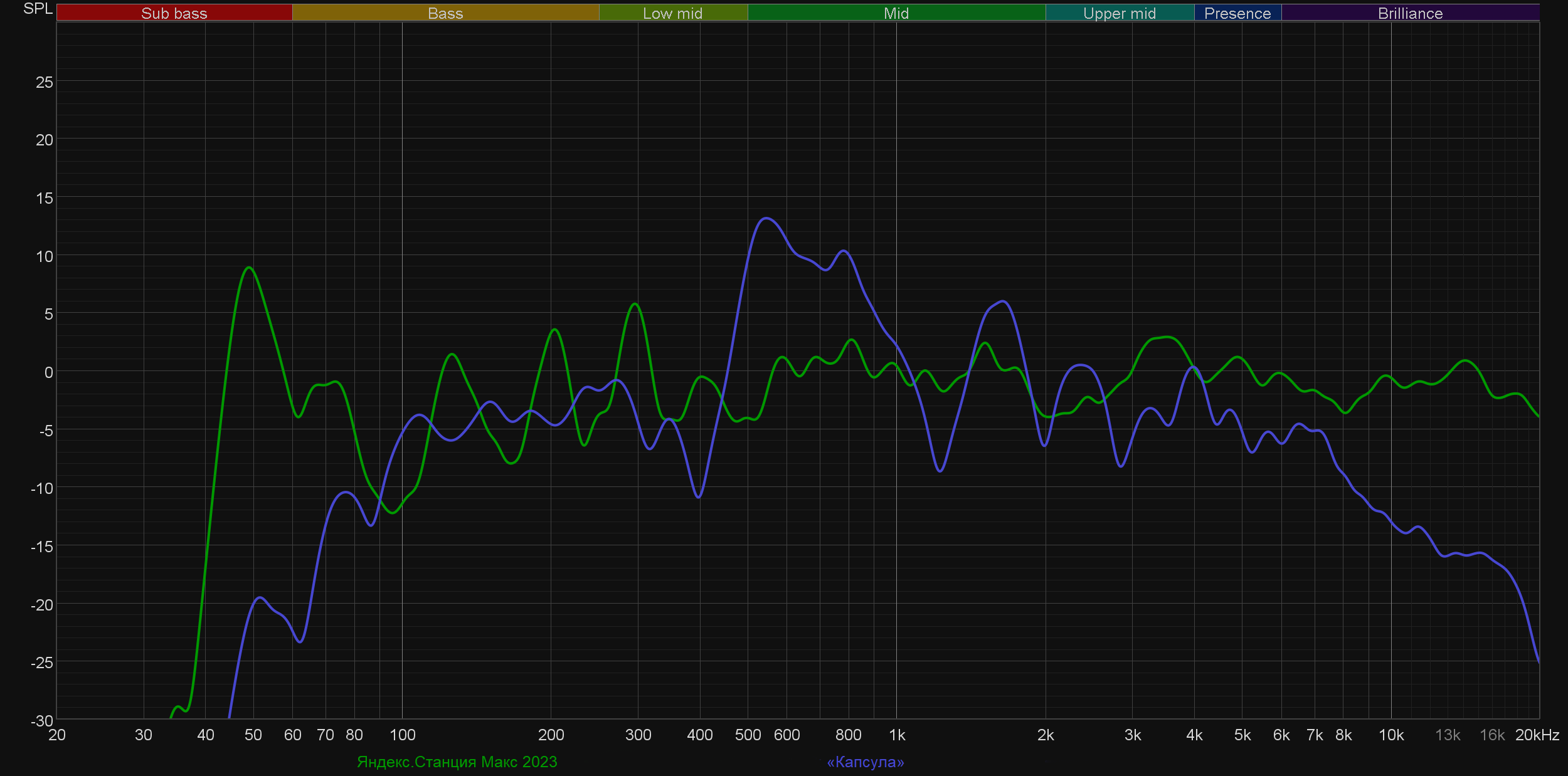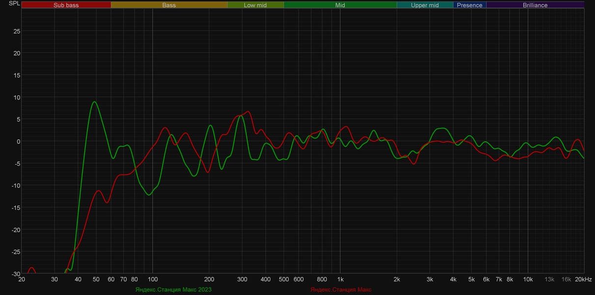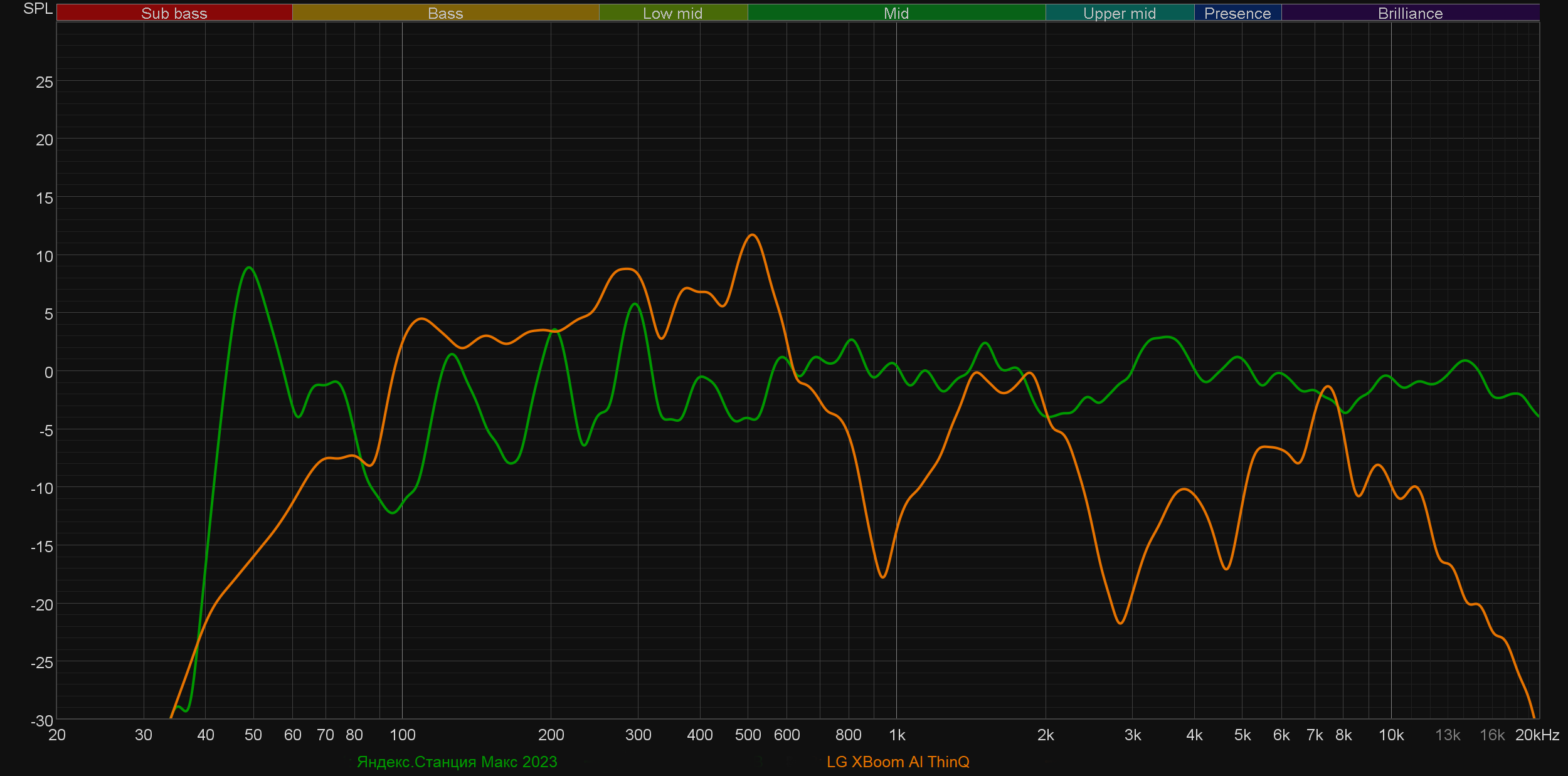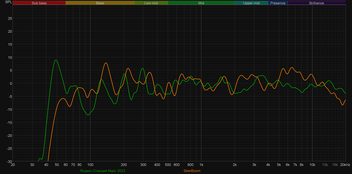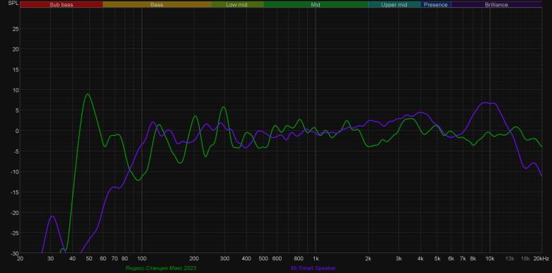 Ну и под конец сравним графики АЧХ тестируемого устройства и других смарт-колонок похожих габаритов — сначала тех, которые поддерживают Алису, а потом — и остальных. По иллюстрациям всё понятно, вряд ли там нужны какие-либо комментарии.