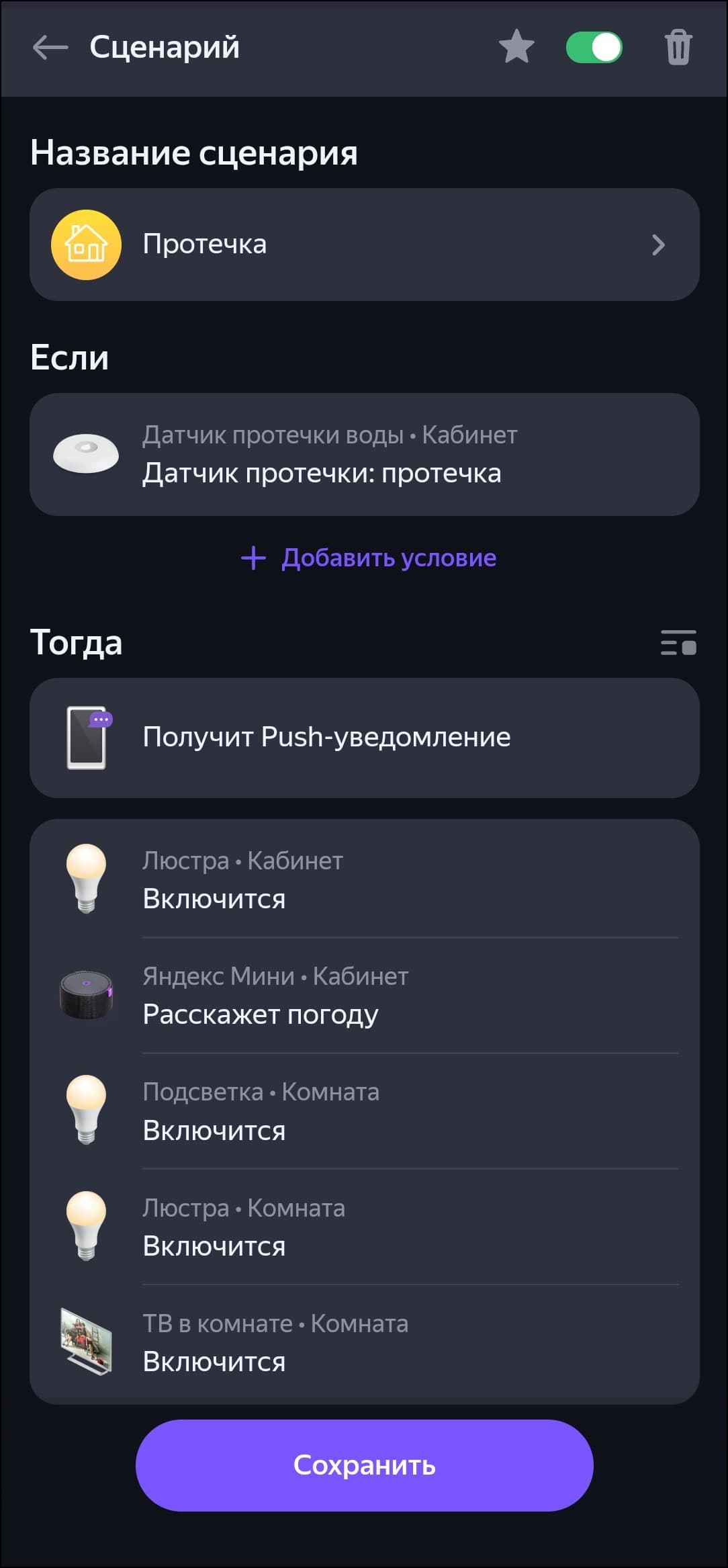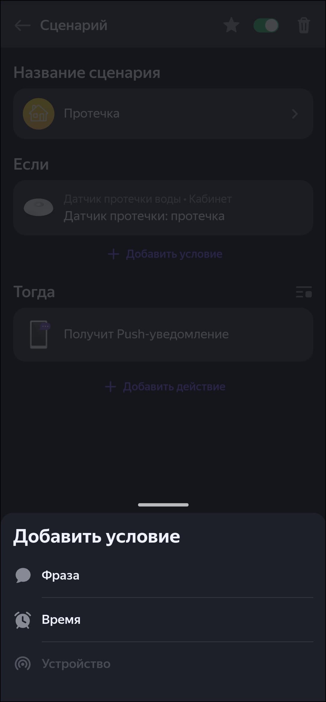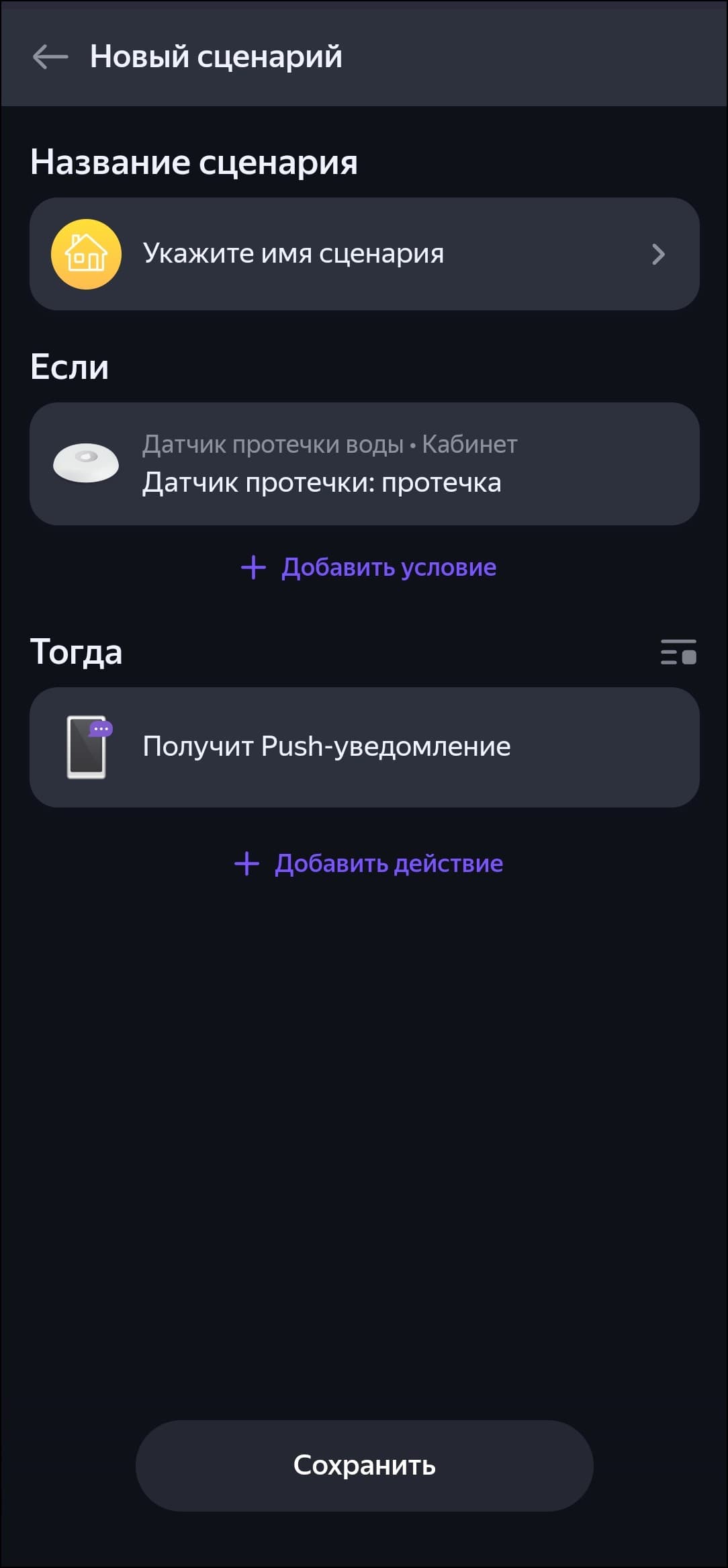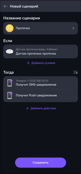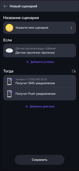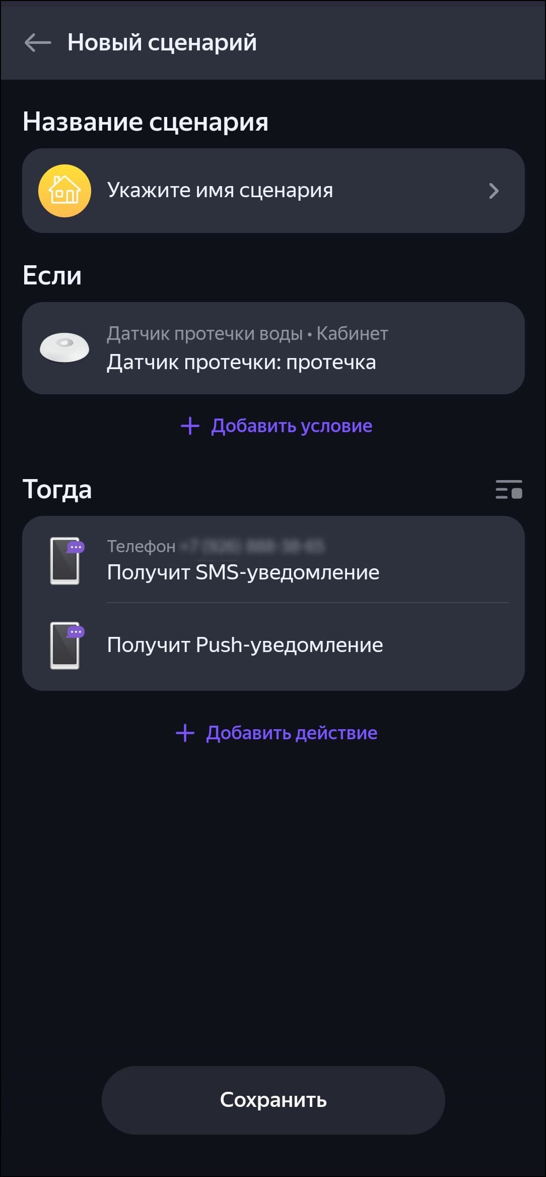Проверяем — всё работает: пуш и SMS приходят буквально в течение нескольких секунд после погружения датчика в воду. Дополнительно можно добавить множество действий для других устройств — отключение всех смарт-розеток в помещении с протечкой, например. Список дополнительных условий пока, к сожалению, ограничен временем и какой-нибудь фразой. То есть срабатывание датчика по ночам, например, настроить не проблема. А вот, скажем, включать свет при открытии двери только в том случае, если на улице темно, уже не выйдет — для этого понадобится обрабатывать данные сразу от двух датчиков — открытия и освещенности, а так система пока делать не умеет.