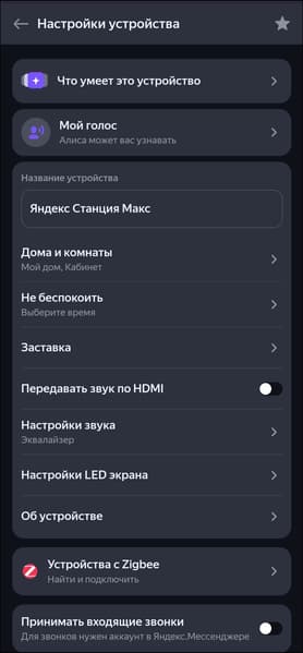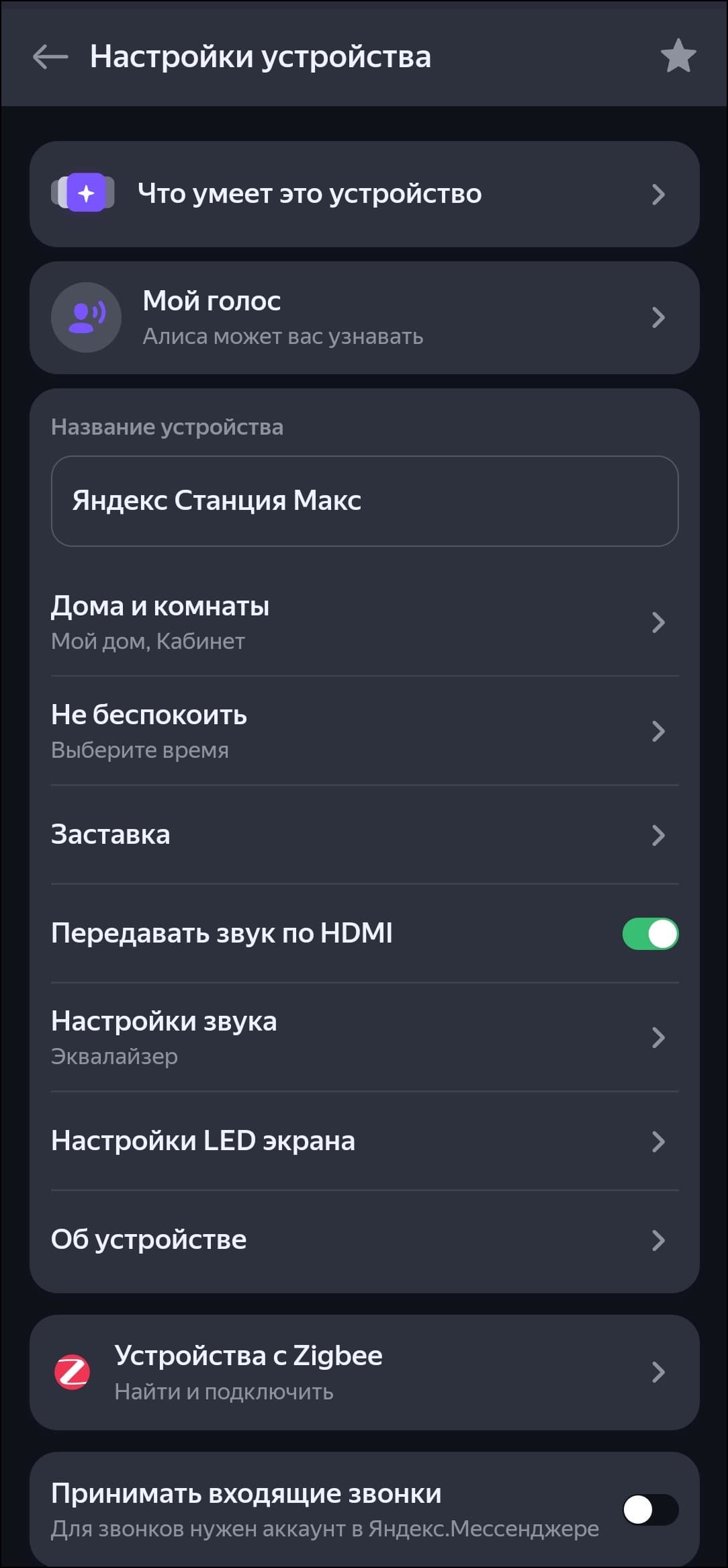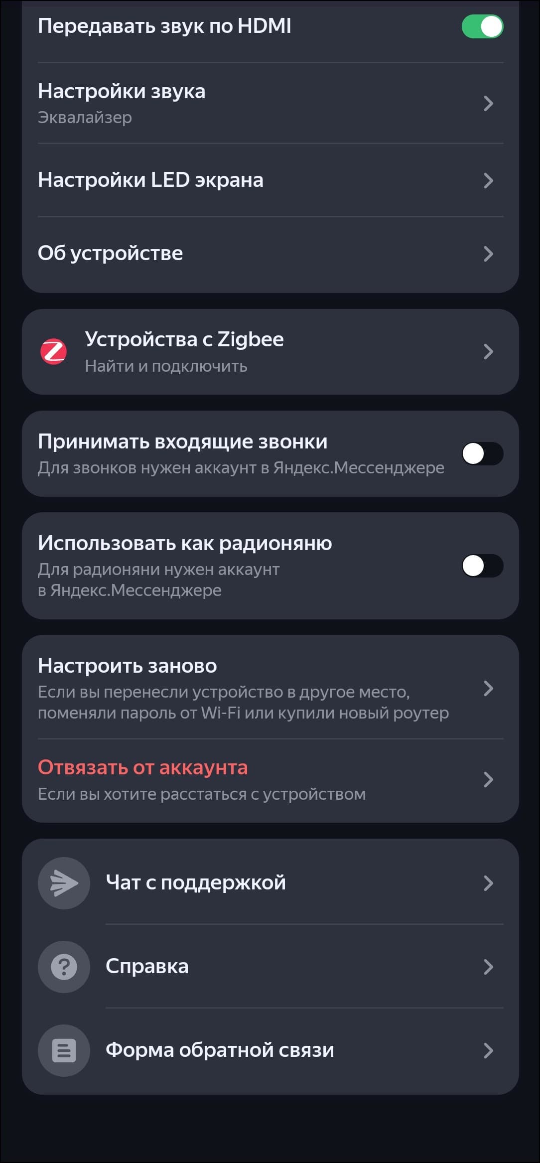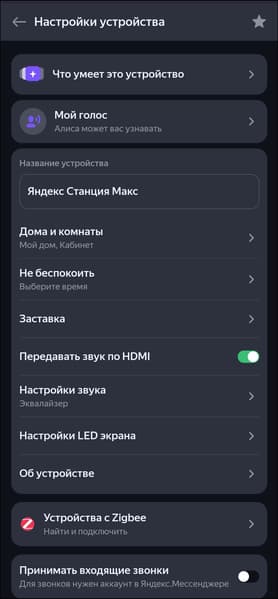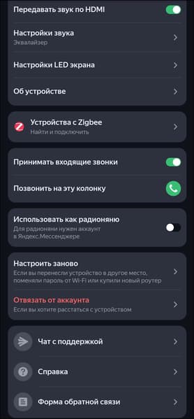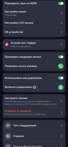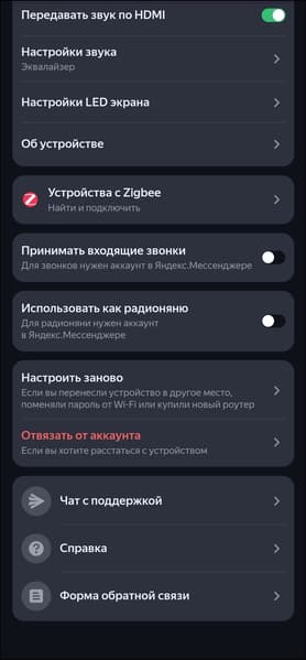 Одно из ключевых отличий обновленной «Станции Макс» от предшественницы — это возможность передачи аудио через HDMI. Если активировать ее в приложении, звук будет передаваться на подключенный телевизор и воспроизводиться им, если выключить — играть будет сама колонка.