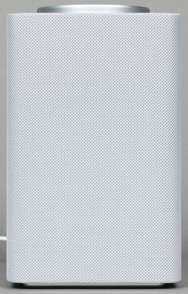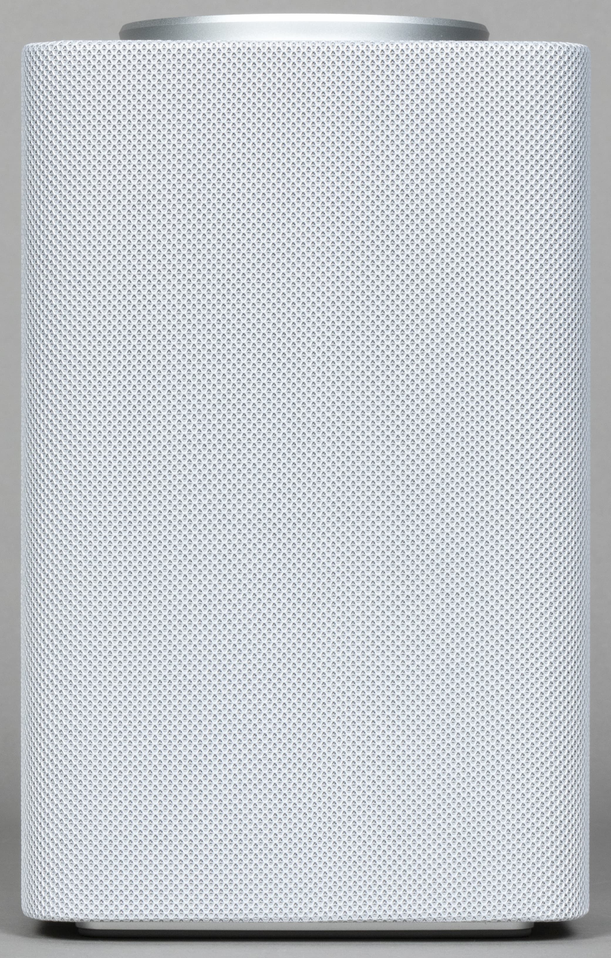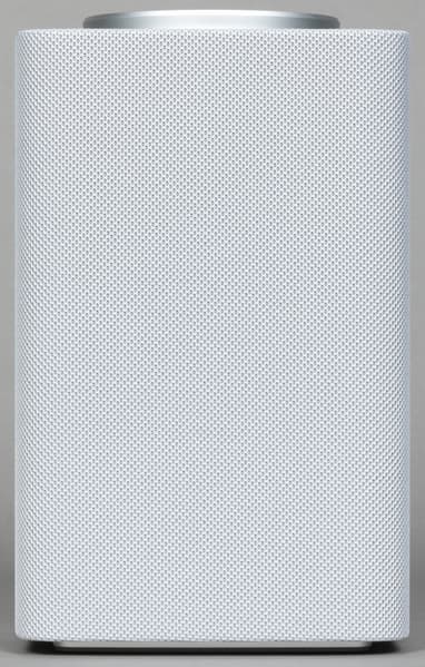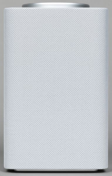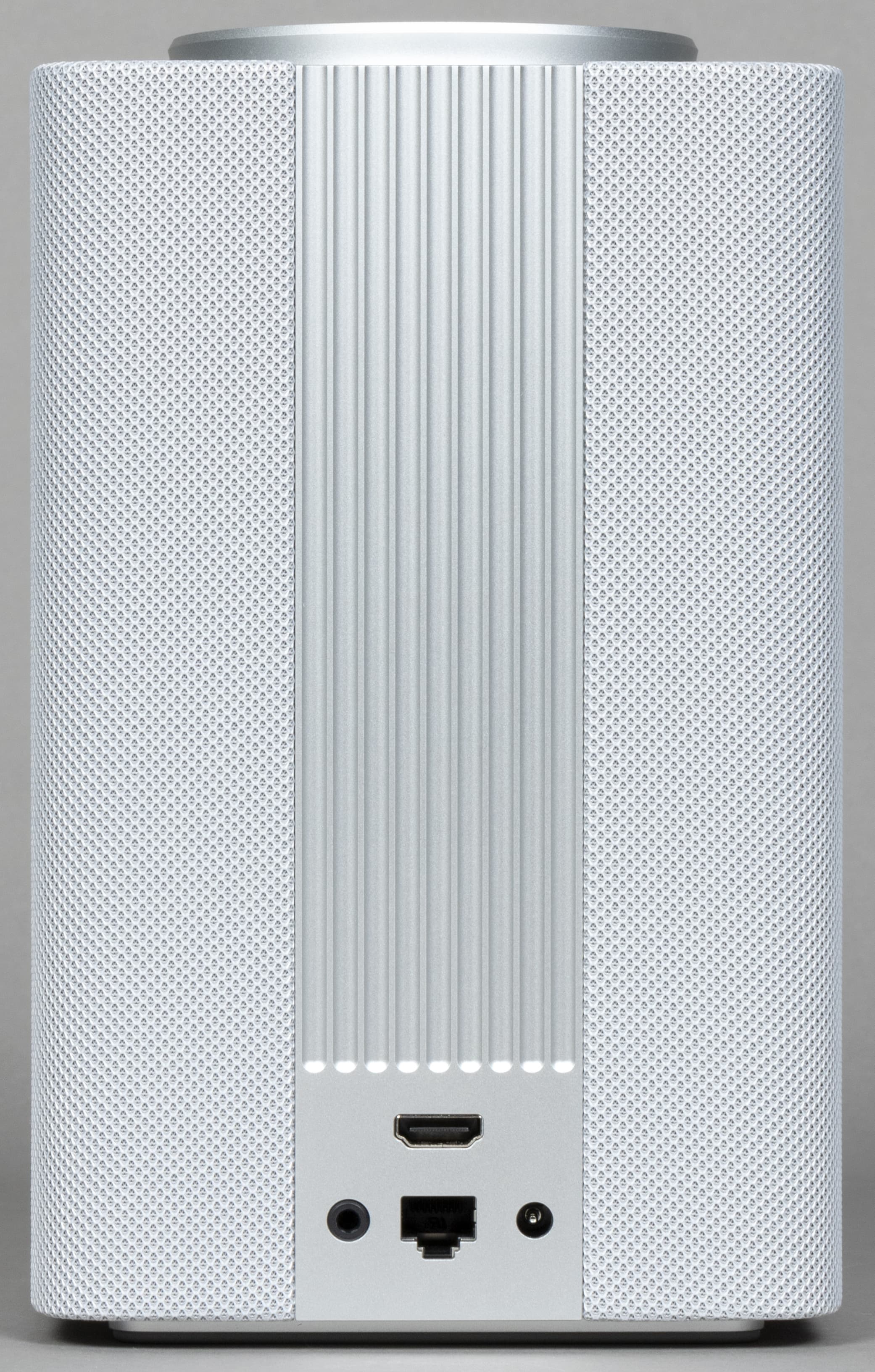 По периметру вся колонка обтянута приятной на ощупь тканью, на задней панели размещены радиатор системы охлаждения и разъемы для подключения. На передней панели под тканью находится экран, который не заметен в выключенном состоянии.