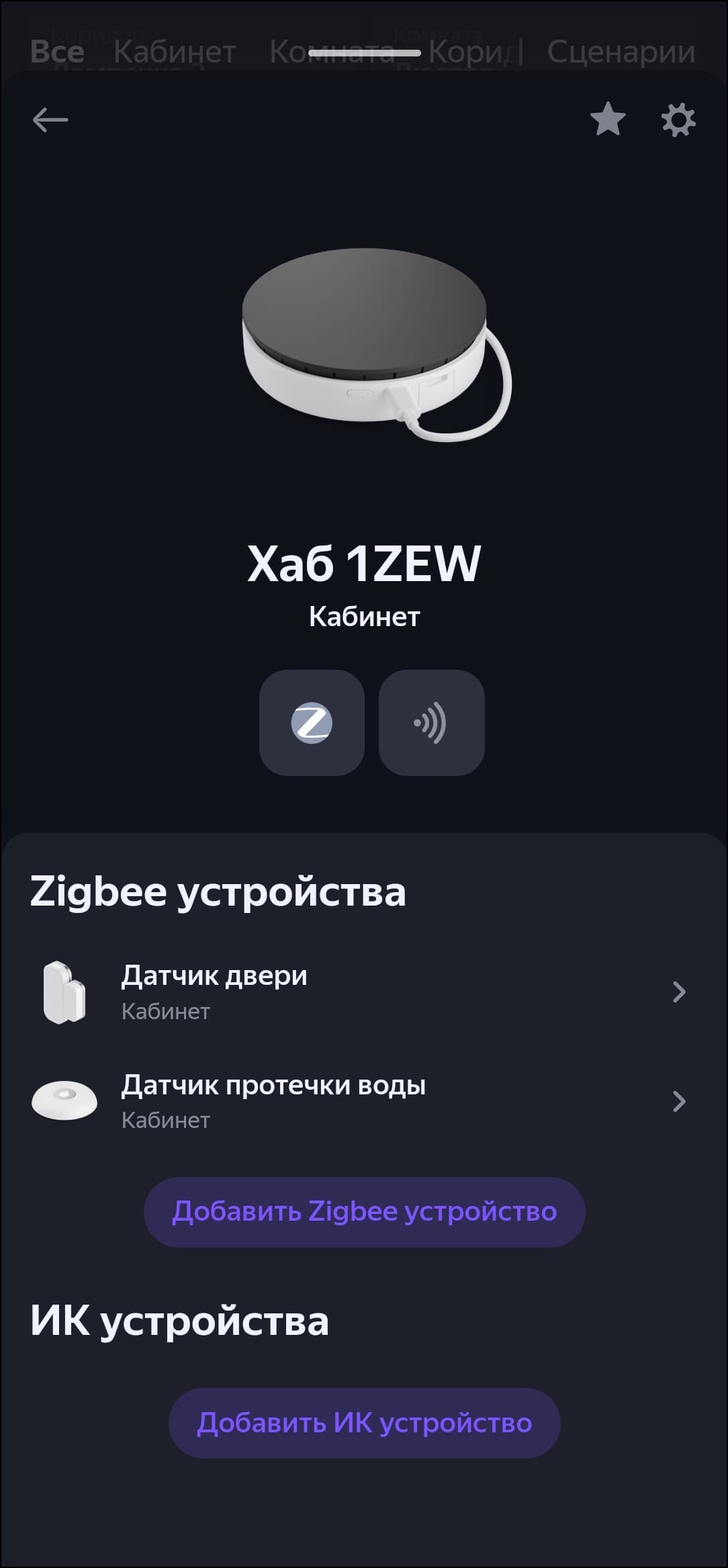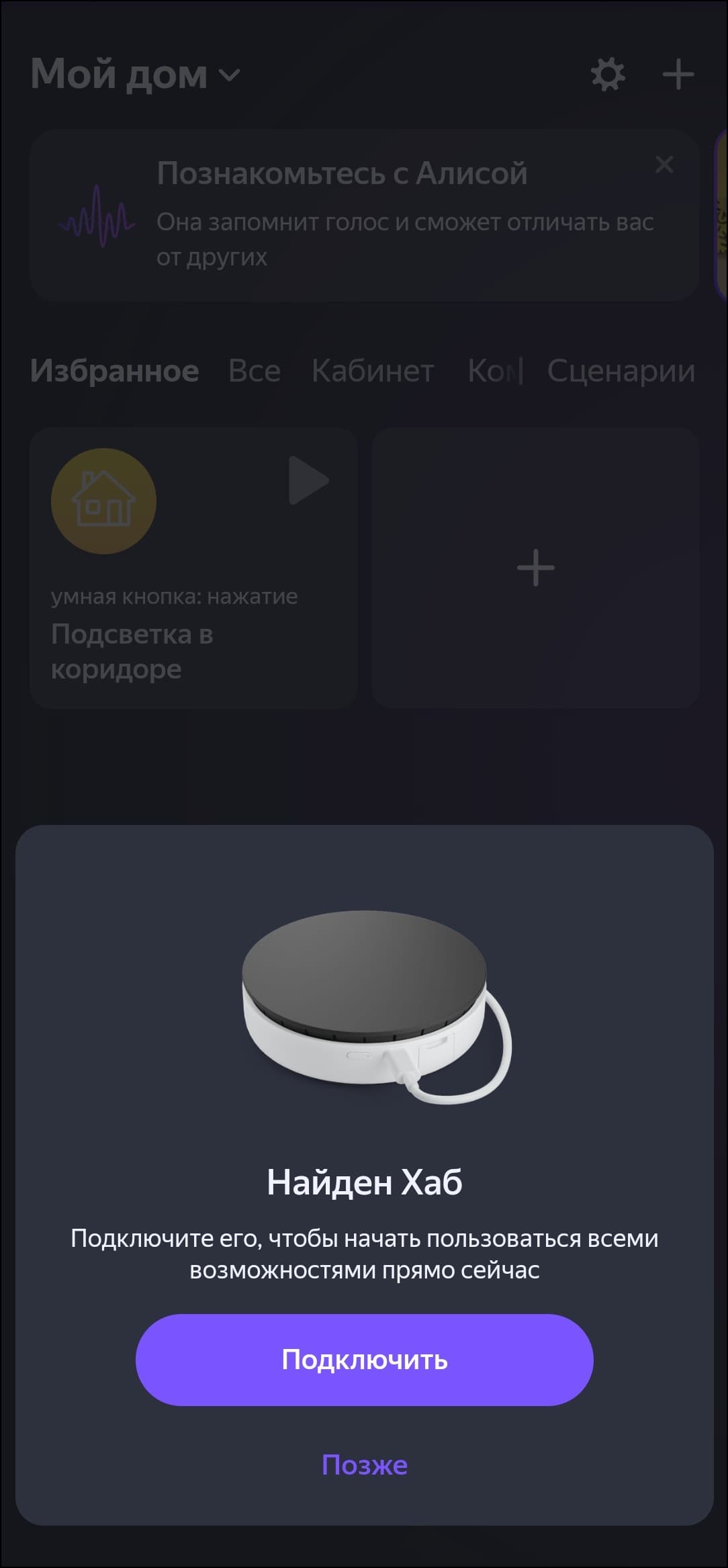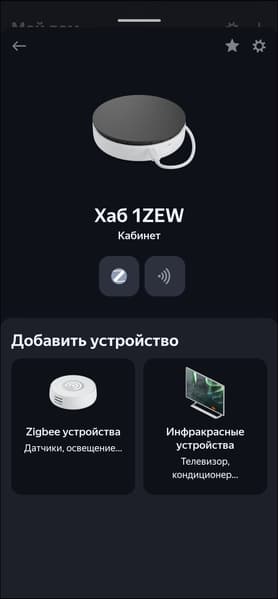С поддерживающей Zigbee колонкой хаб особо не нужен, но раз уж он оказался в наших руках — его первым и подключим. В целом, лишним он в системе не будет — и в качестве ИК-пульта поработать может, и при смене и перемещении колонок не надо будет менять настройки остальной системы.
