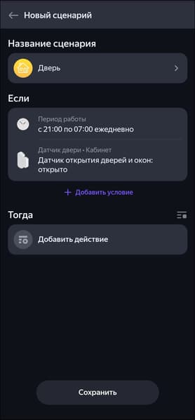 Добавляем датчик в раздел «если», в качестве триггера для запуска выбираем его срабатывание. Первым делом нужно настроить оповещения.