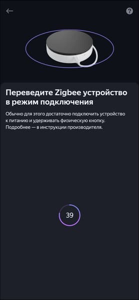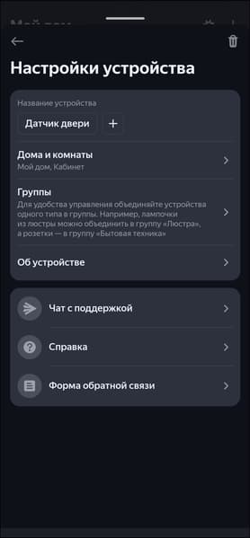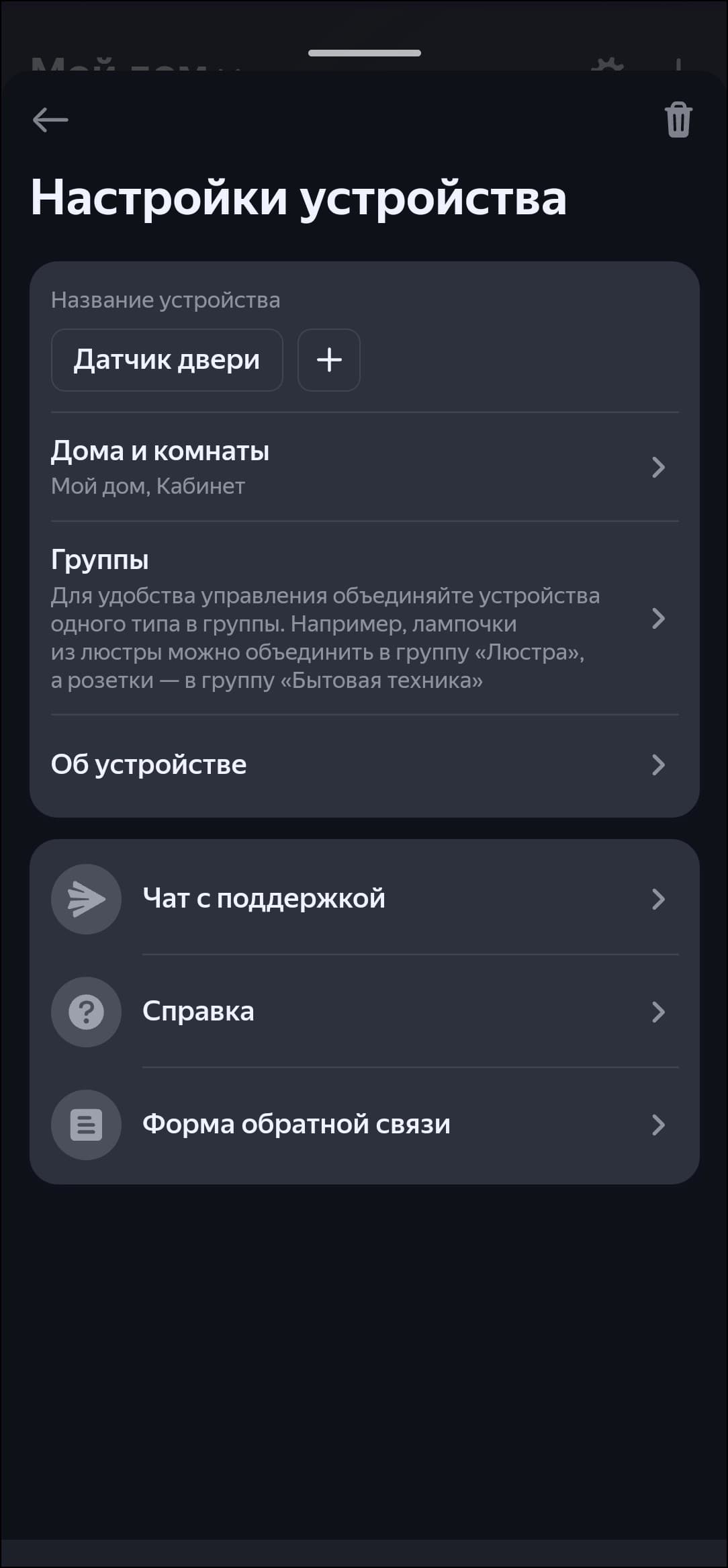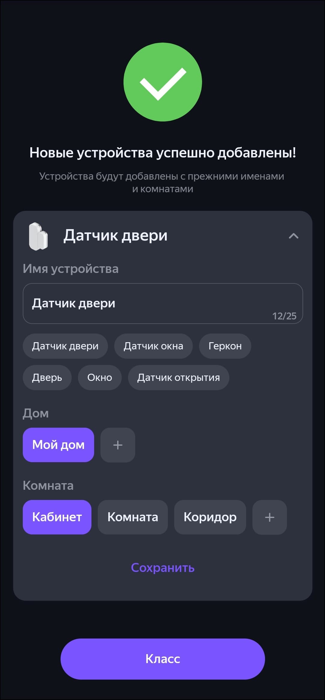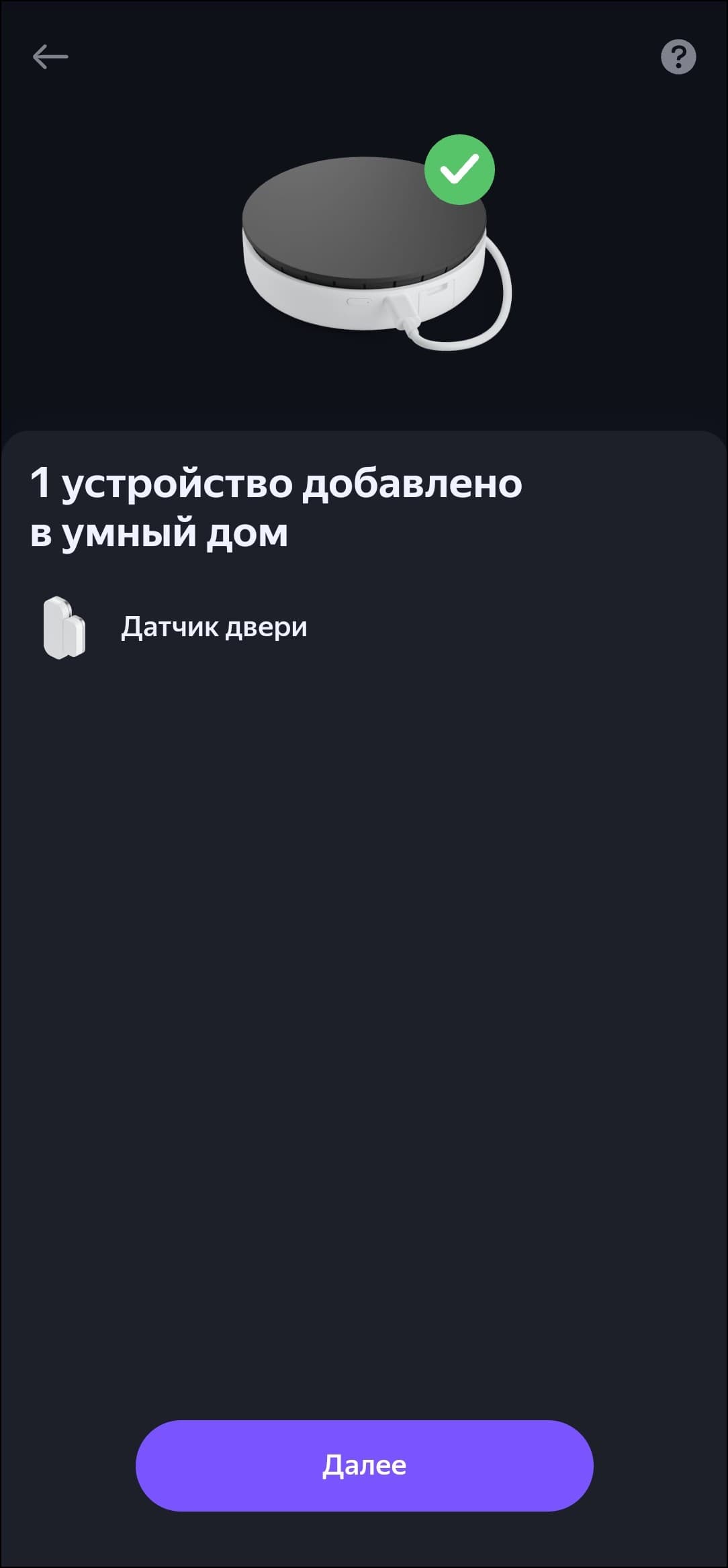 Еще один датчик, которого мы не видели ранее — это датчик открытия двери или окон, его и подключим следующим. Процесс тот же: выбираем устройство с поддержкой Zigbee (Хаб или колонку), к которому хотим его подключить, выбираем опцию добавления, нажимаем кнопку... Остается выбрать дом и комнату.
