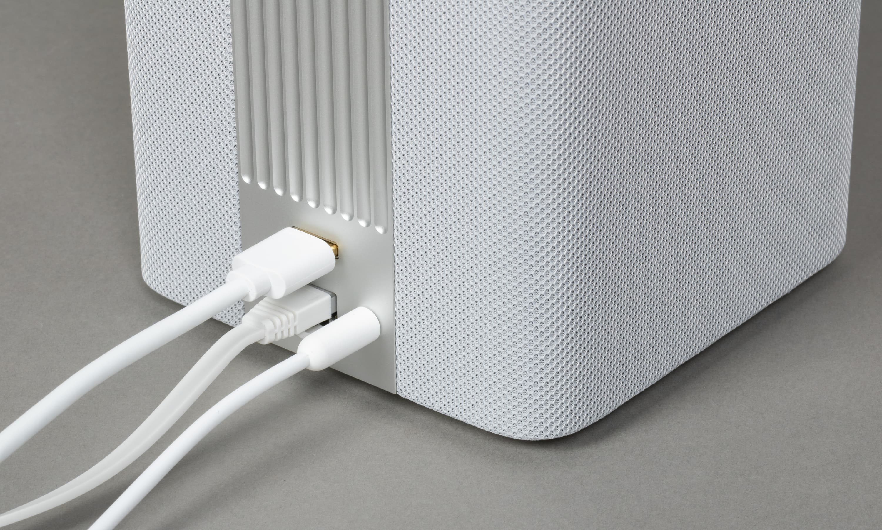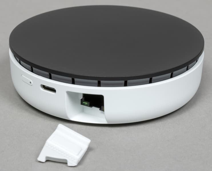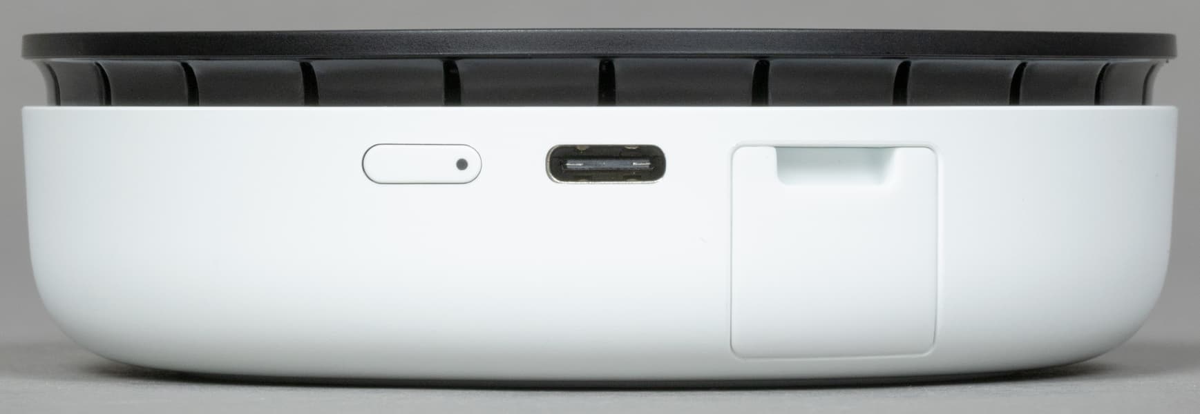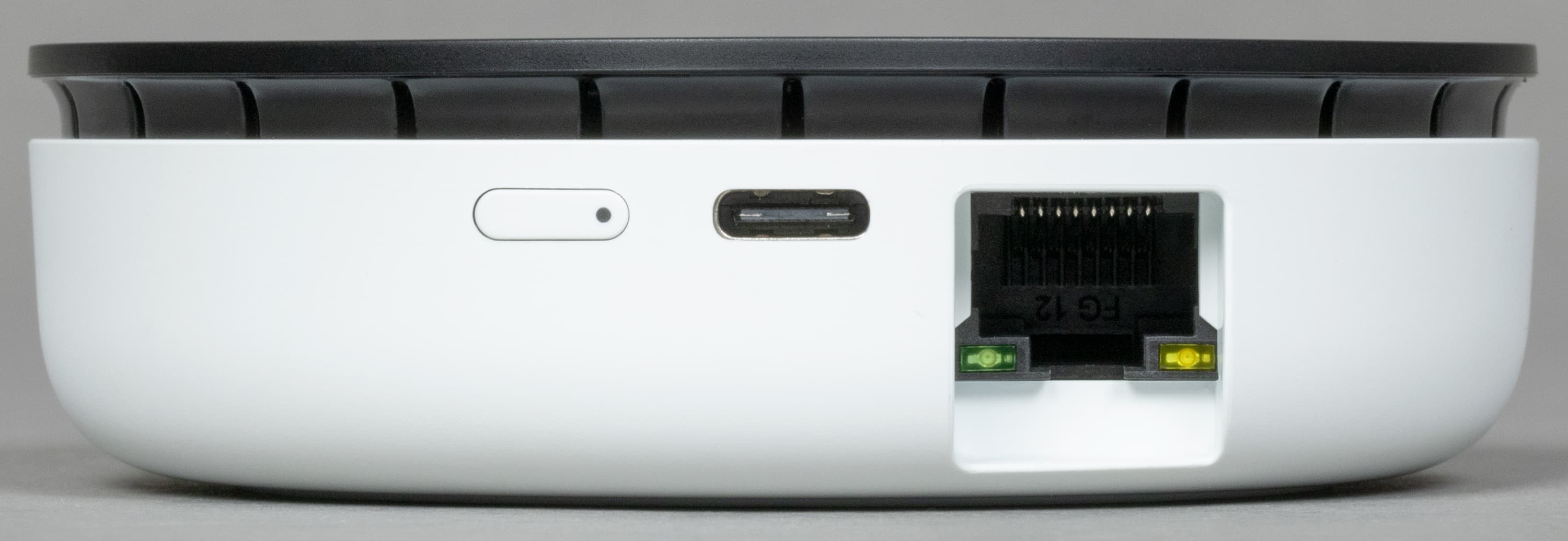 На боковой части корпуса размещены кнопка сопряжения с маленьким светодиодным индикатором, порт USB Type C для подключения питания и Ethernet-разъем, прикрытый специальной силиконовой заглушкой.