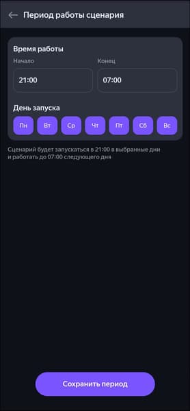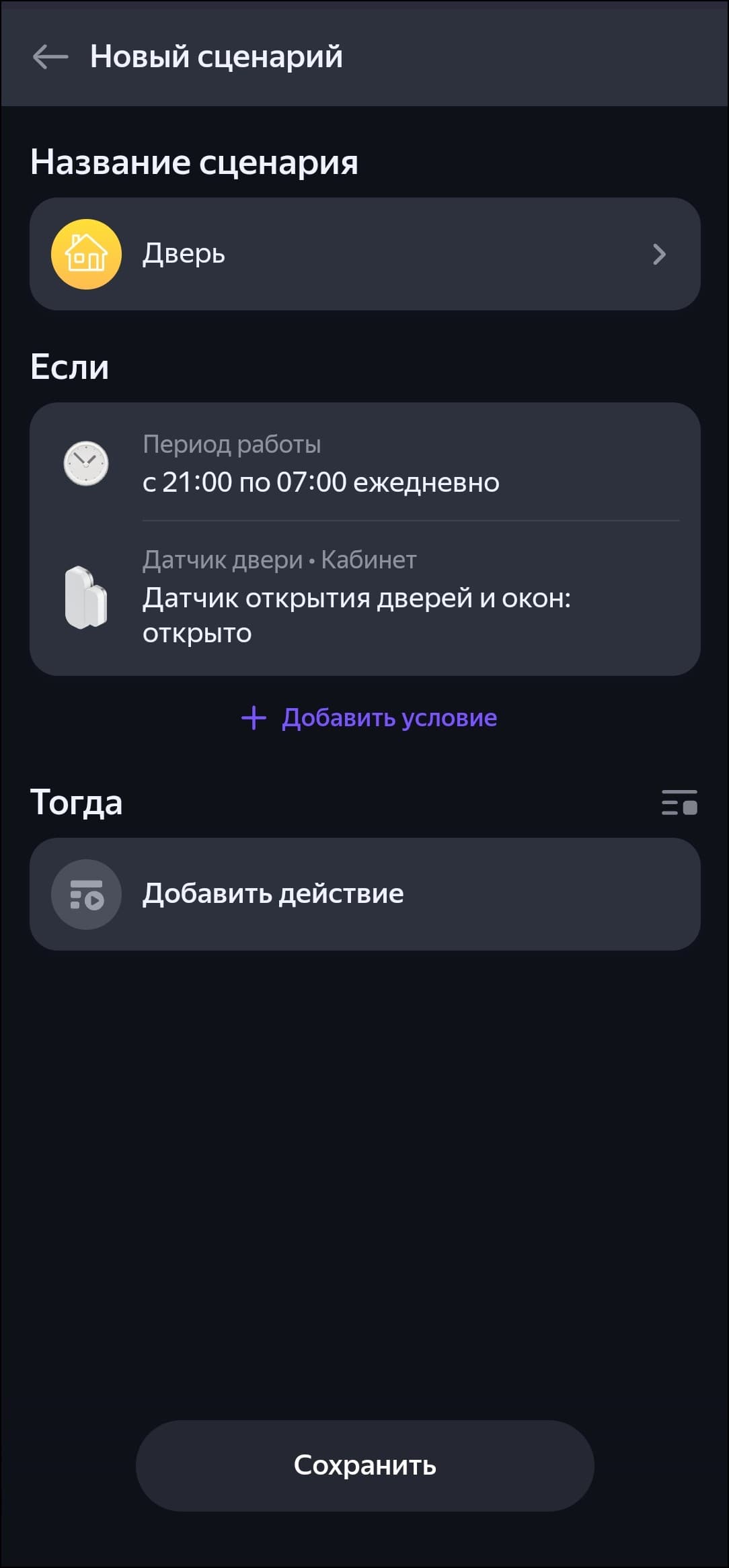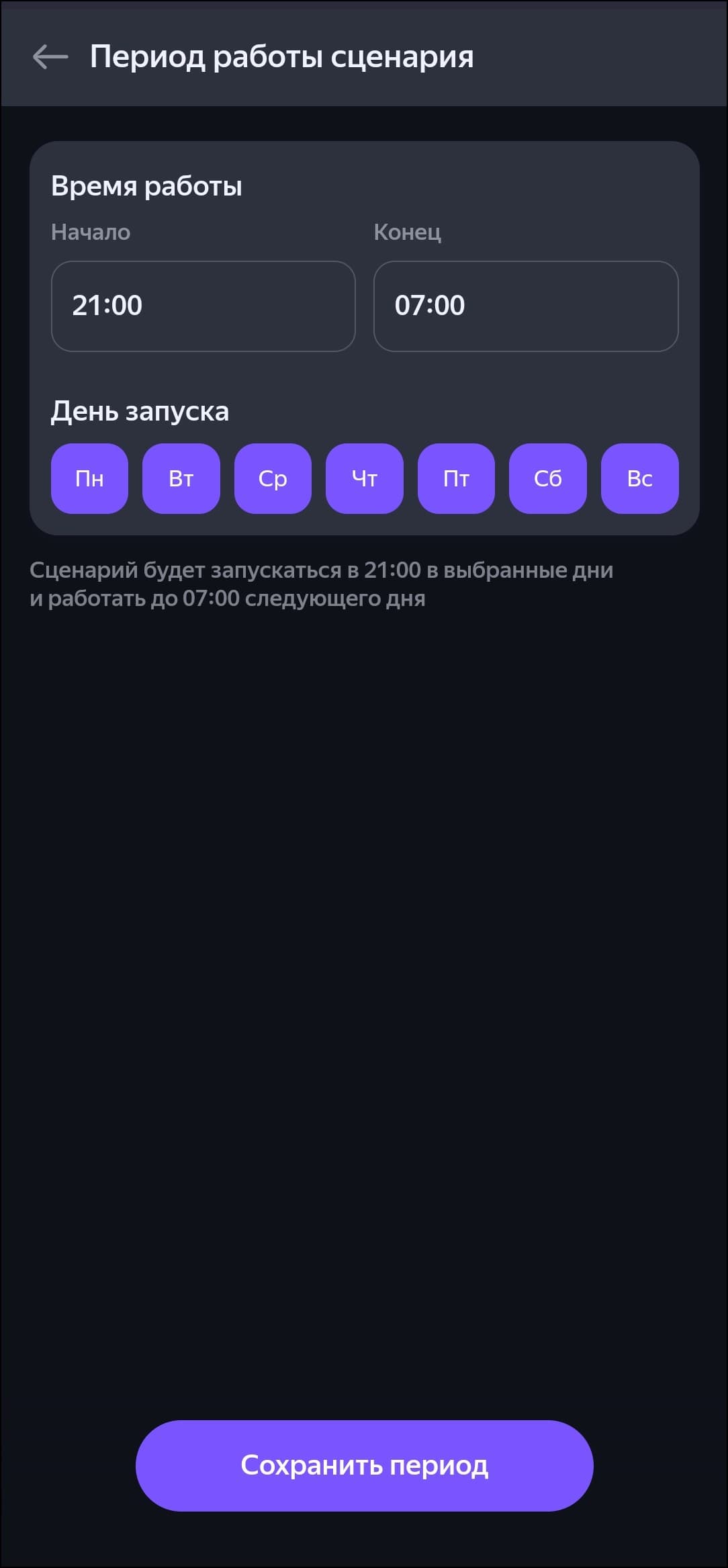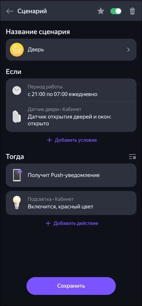 На этот раз добавим время: пусть оповещения приходят только вечером и ночью — с 21:00 по 7:00. Снова всё прекрасно работает, оповещения появляются, лампочка зажигается...