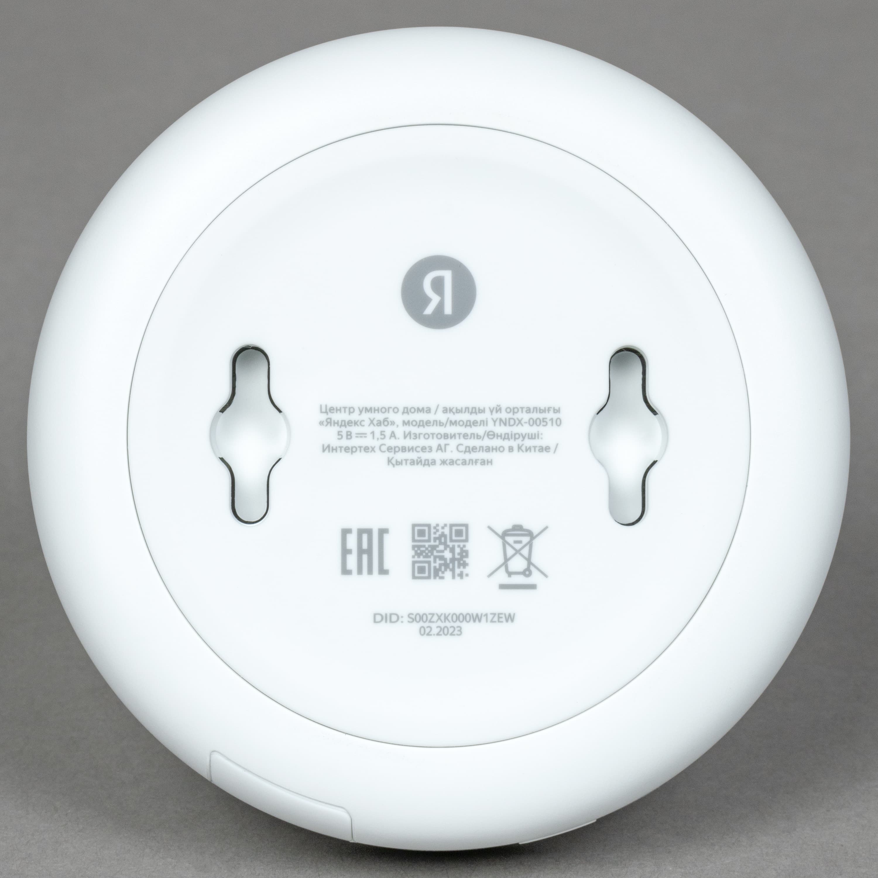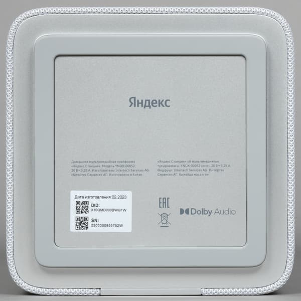 На дне размещена силиконовая накладка, обеспечивающая надежное размещение колонки на горизонтальной поверхности и поглощающая часть нежелательных вибраций при ее работе. По центру нанесена вспомогательная информация — от серийного номера до логотипов систем сертификации.