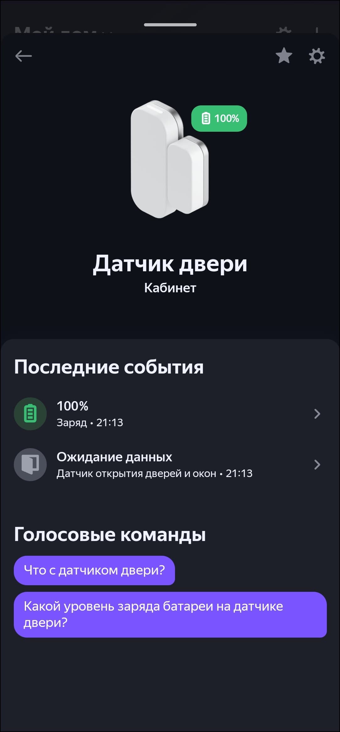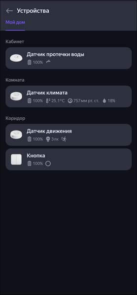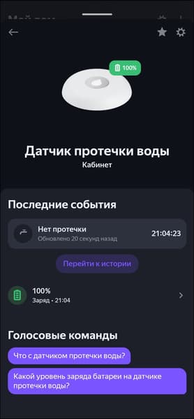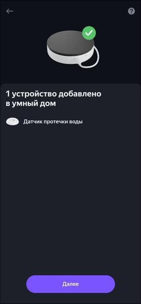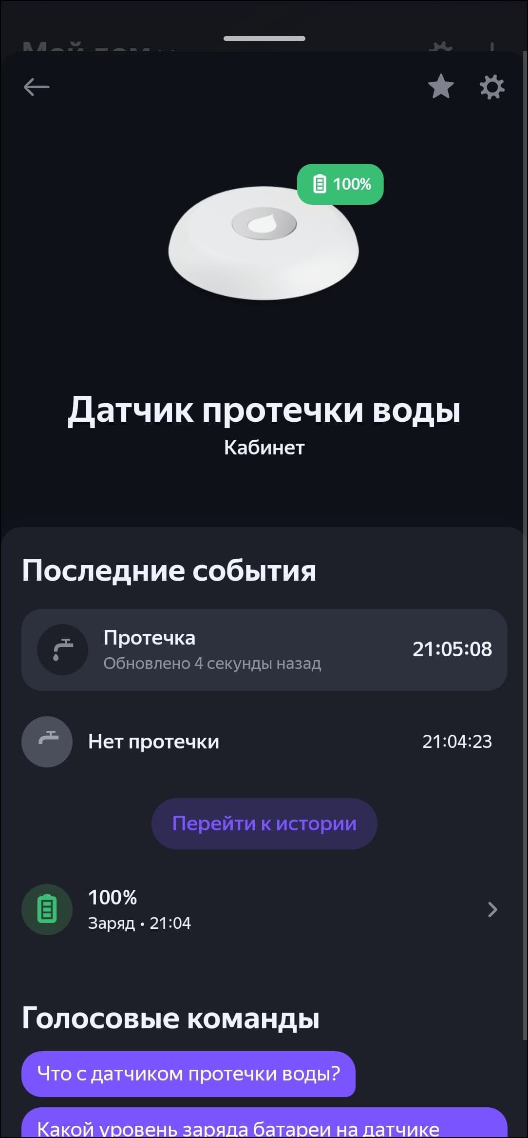 Про подключение Zigbee-устройств к колонке мы говорили в обзоре «Яндекс Станции 2», потому снова продолжим работать с хабом. Процесс практически не отличается: переходим на страницу устройства, запускаем подключение. Далее переводим подключаемый датчик в режим сопряжения с помощью единственной кнопки, ждем несколько секунд — готово, оказываемся на его странице. Изначально датчик протечки просто показывает, зарегистрированы протечки или нет.