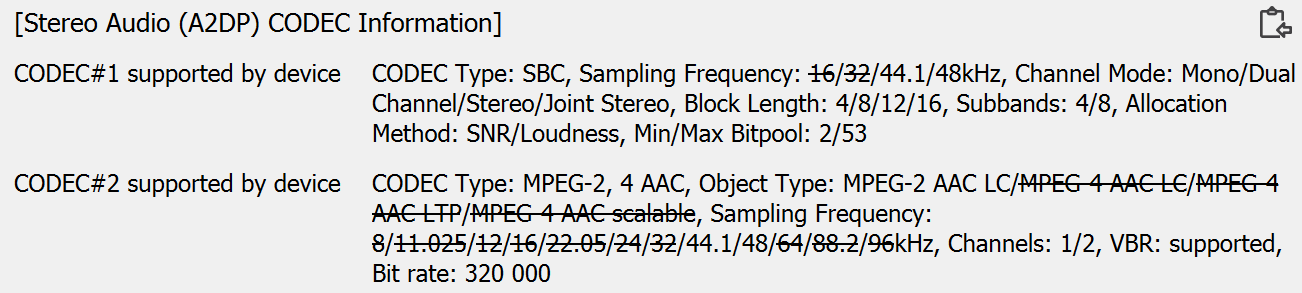 Полный список поддерживаемых кодеков и их режимов традиционно был получен с помощью утилиты Bluetooth Tweaker. Помимо базового SBC колонка поддерживает несколько более «продвинутый» AAC — приятная неожиданность.