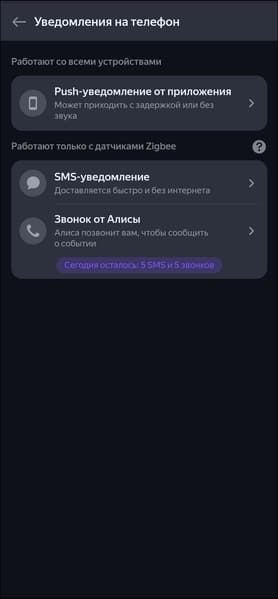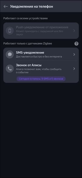 Во-первых, «умный дом» может в случае необходимости присылать пуш-уведомления в приложении. Но это явно не самый надежный способ получения столь важной информации. Поэтому разработчики добавили возможность получать звонки или СМС, правда для этого потребуется подписка «Яндекс Плюс». Сейчас лимит составляет до 20 SMS и 20 звонков в месяц, но не более 5 в день — для самых важных уведомлений этого будет достаточно.