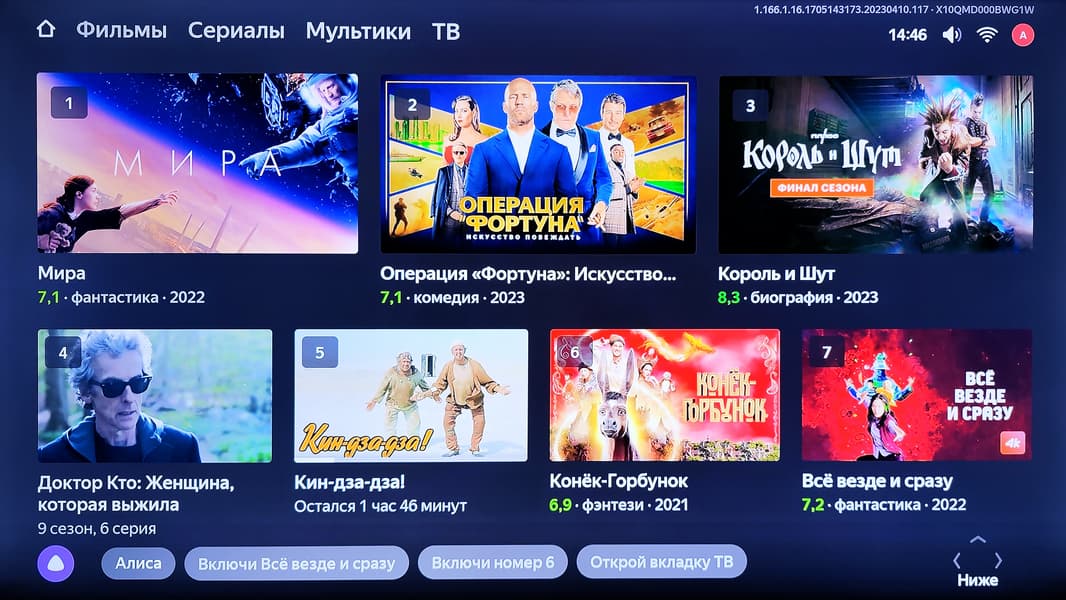 На ТВ во время работы колонки транслируется интерфейс, позволяющий выбирать контент с помощью пульта дистанционного управления. Вот только выбрать можно исключительно видео из «Кинопоиска», а зайти в «Яндекс.Музыку» и запустить любимый плейлист не получится — для этого придется дать голосовую команду «Алисе».