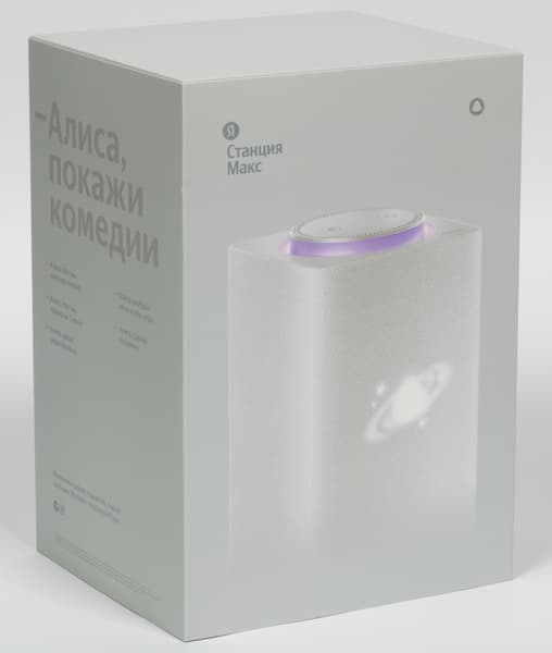 Поставляется обновленная «Яндекс Станция Макс» в крупной коробке из плотного картона, на которую надета «суперобложка» с нанесенными на нее изображениями устройства, краткими характеристиками и прочей информацией.