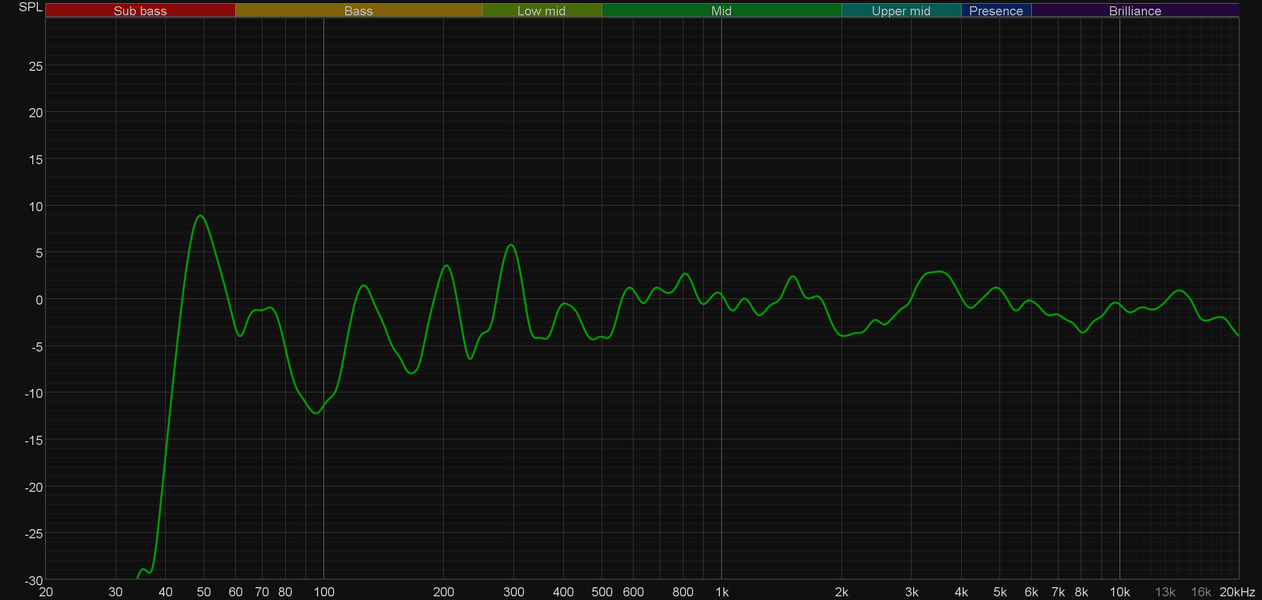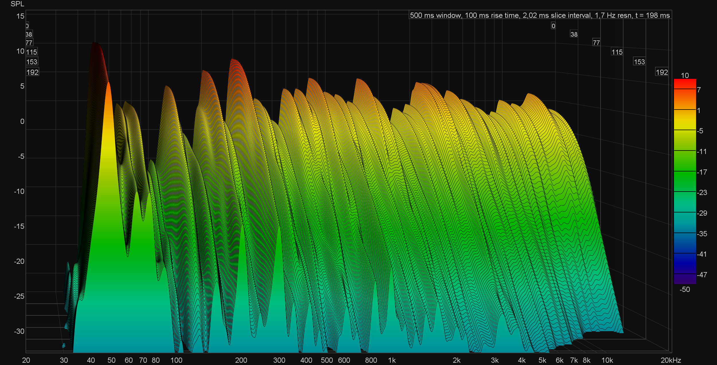 При этом бас, конечно же, очень гулкий и склонен к «бубнению», что хорошо заметно по графику кумулятивного затухания спектра (он же «водопад», или waterfall). Критиковать смарт-колонку за это нет никакого смысла — тут речь идет скорее не про качество баса, а про сам факт его наличия. «Выжать» из маленькой колонки с пластиковым корпусом звучание в районе 50 Гц надо еще суметь.
