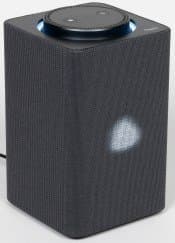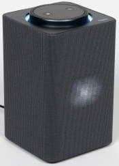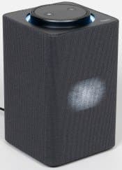 На верхней панели расположен вращающийся регулятор громкости, по центру которого находятся две клавиши: вызова голосового помощника и отключения микрофонов. За отверстием в центре и перфорацией по внешнему краю скрываются 7 микрофонов для «общения» с голосовым помощником. В правом нижнем углу скромно расположился небольшой логотип производителя.