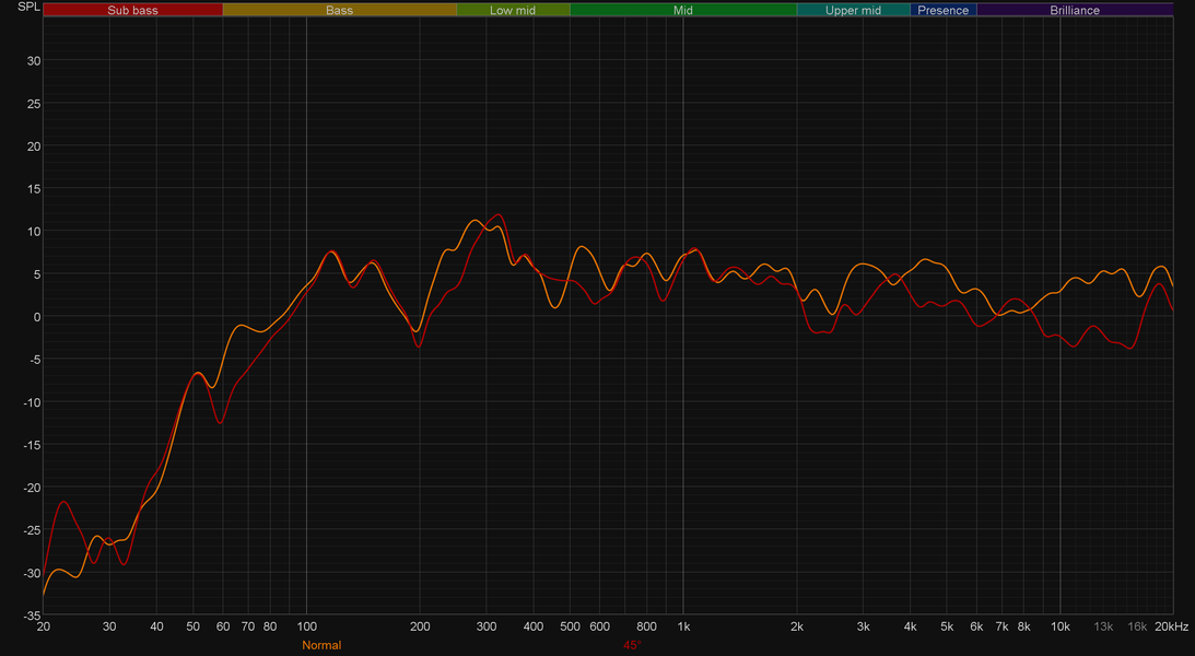 Для этого посмотрим на графики АЧХ. Для компактной акустики мы традиционно проводим измерения при двух положениях микрофона. Сначала размещаем его на расстоянии примерно 60 см по нормали к колонке. А потом под углом 45° сверху, так как часто устройство находится примерно на уровне пояса слушателя. Разница в измерениях присутствует, хоть и не очень значительная.