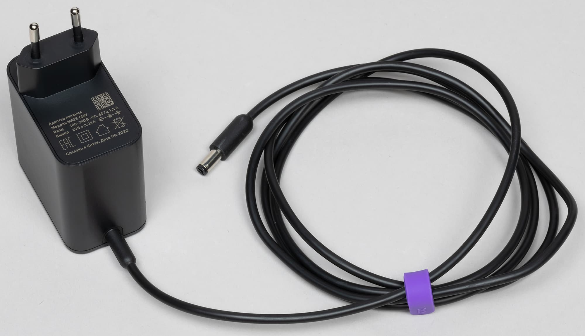 Блок питания компактный, к качеству исполнения корпуса никаких вопросов — все выполнено на должном уровне. Основные параметры можно найти на внутренней стороне под вилкой. Длина кабеля — 170 см, регулировать длину можно с помощью идущего в комплекте силиконового хомута.