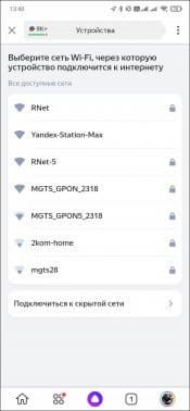 Мы решили для начала подключиться «по старинке» — через беспроводную сеть. Выбираем, подключаем — тут все как обычно. Но есть небольшой нюанс: в сетях 5 ГГц «Яндекс.Станция Макс» работает не слишком-то стабильно — это заметили и мы, и другие пользователи устройства. Есть смысл воспользоваться сетью 2,4 ГГц — особенно учитывая, что устройства для «умного дома» все равно поддерживают только ее. Теоретически могут возникнуть проблемы с воспроизведением видео с разрешением 4K, но на практике мы с ними не столкнулись. Далее подносим гаджет, с которого производится настройка, к колонке — он воспроизводит не самые приятные на свете звуки, после чего «Станция» некоторое время осуществляет подключение.