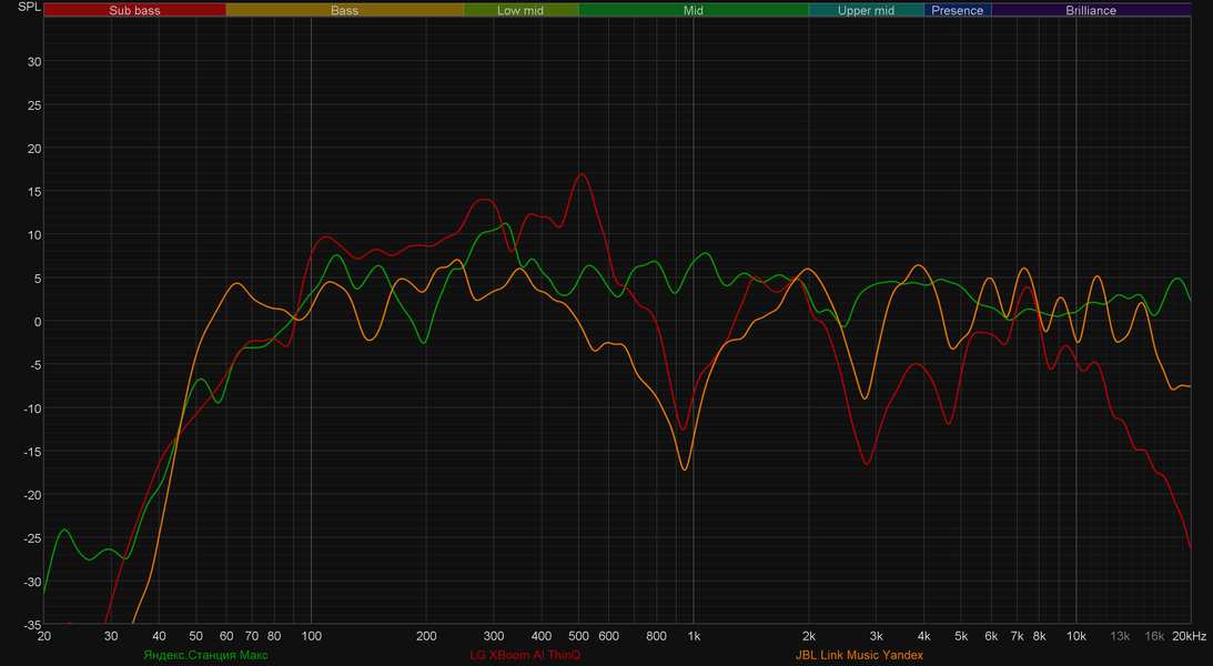 И у LG XBoom AI ThinQ, и у JBL Music Yandex графики выглядят куда менее ровными, а провалы в среднечастотном диапазоне и в верхней середине так и вовсе выглядят довольно пугающе. При этом субъективно многие пользователи оценивают их звучание очень высоко, что еще раз доказывает — далеко не всем нужна «ровная» АЧХ, главное — чтобы звук оказывал нужное эмоциональное воздействие. В общем, если вам ближе ровное «мониторное» звучание — скорее всего, новая «Яндекс.Станция Макс» вам понравится. А вот если хочется интересных акцентов — стоит обратить внимание на колонки LG или JBL.
