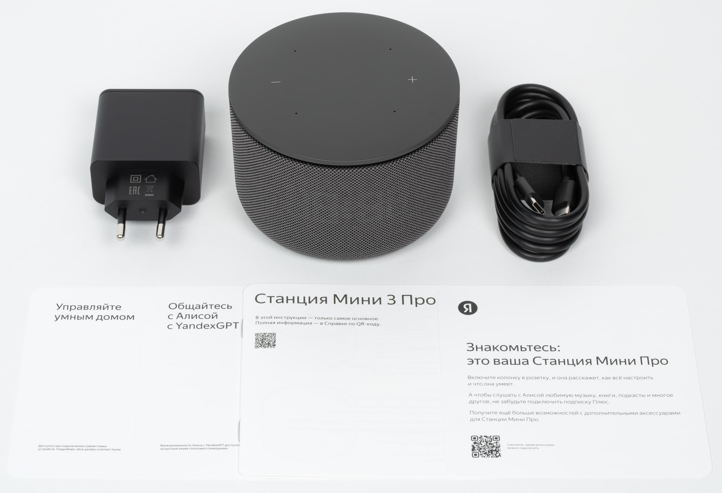«Станция Мини 3 Про» упакована в привычную для компактных колонок «Яндекса» картонную коробку с изображением устройства, его названием, краткими характеристиками и примерами голосовых команд для Алисы. Внутри колонка и аксессуары надежно зафиксированы с помощью картонного ложемента, так что все доезжает в целости и сохранности.